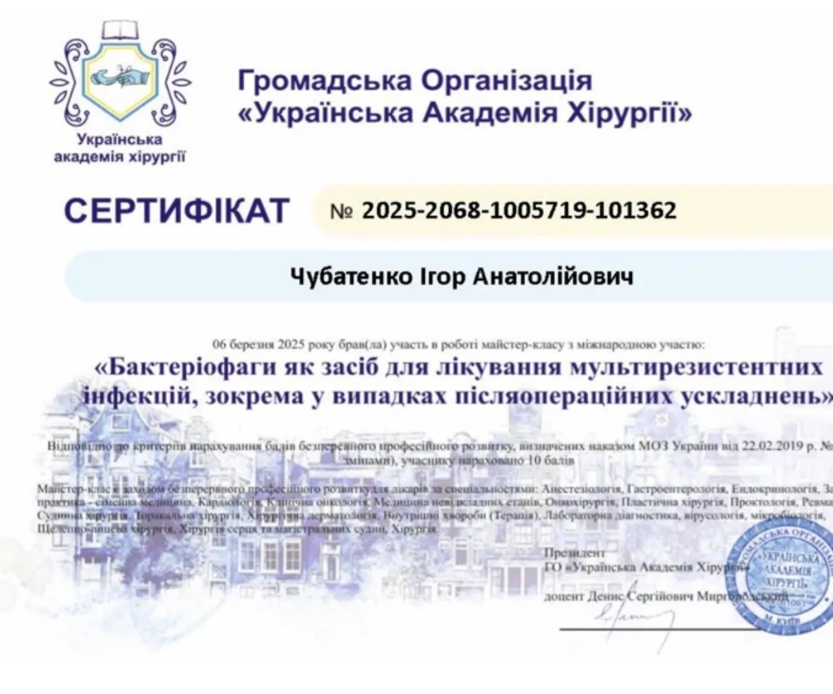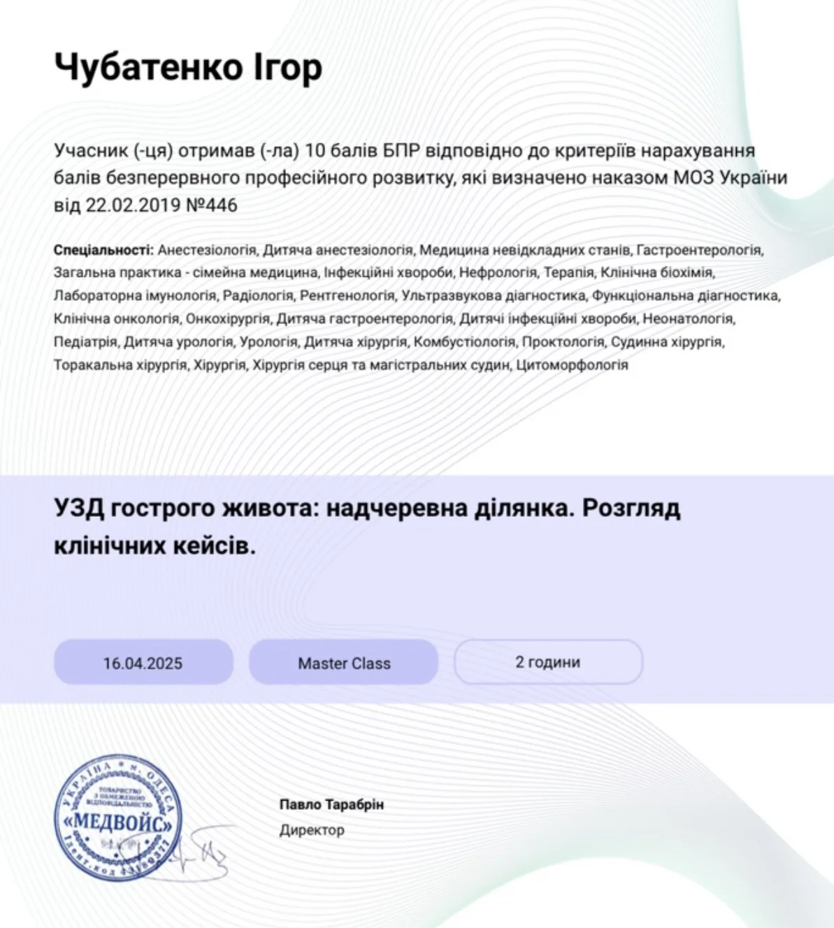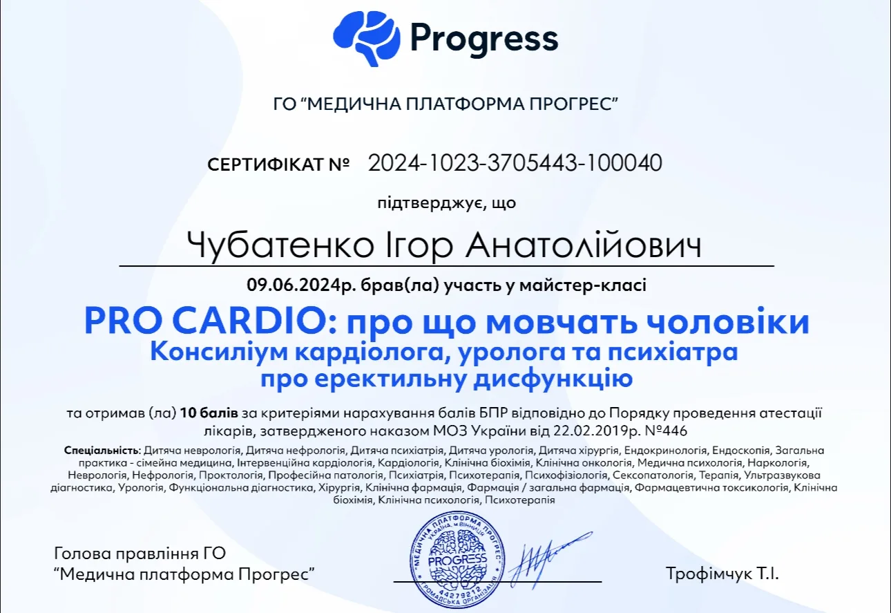 - 1989 р. – Донецький національний медичний університет ім. М. Горького, спеціалізація “Урологія”.