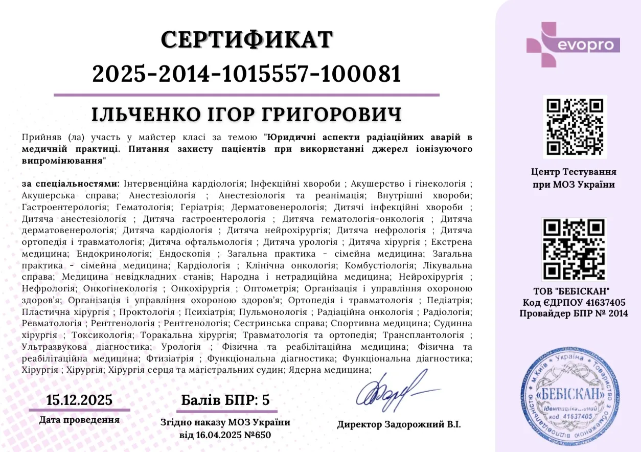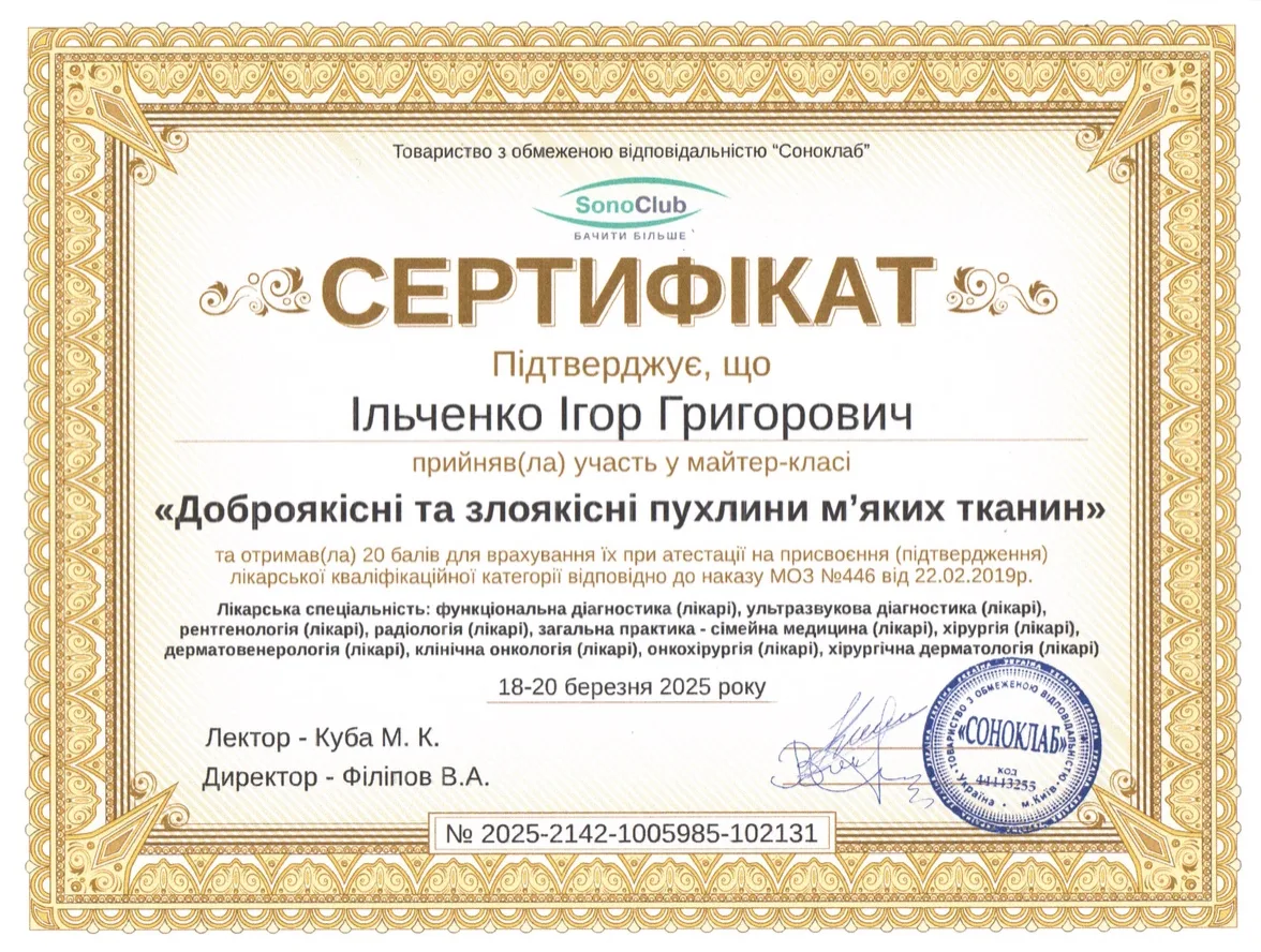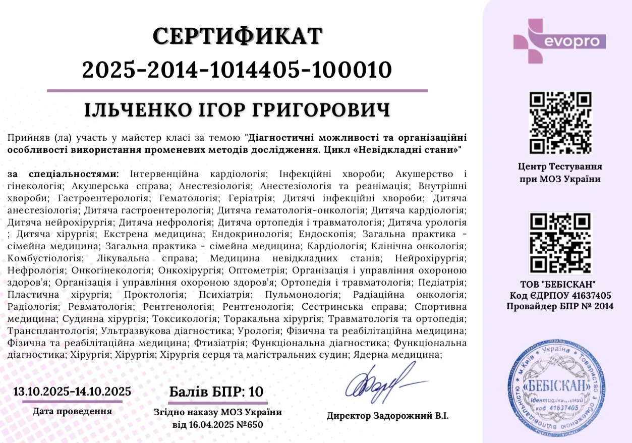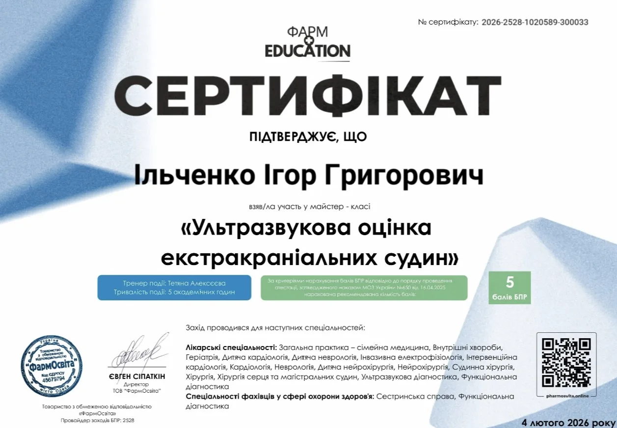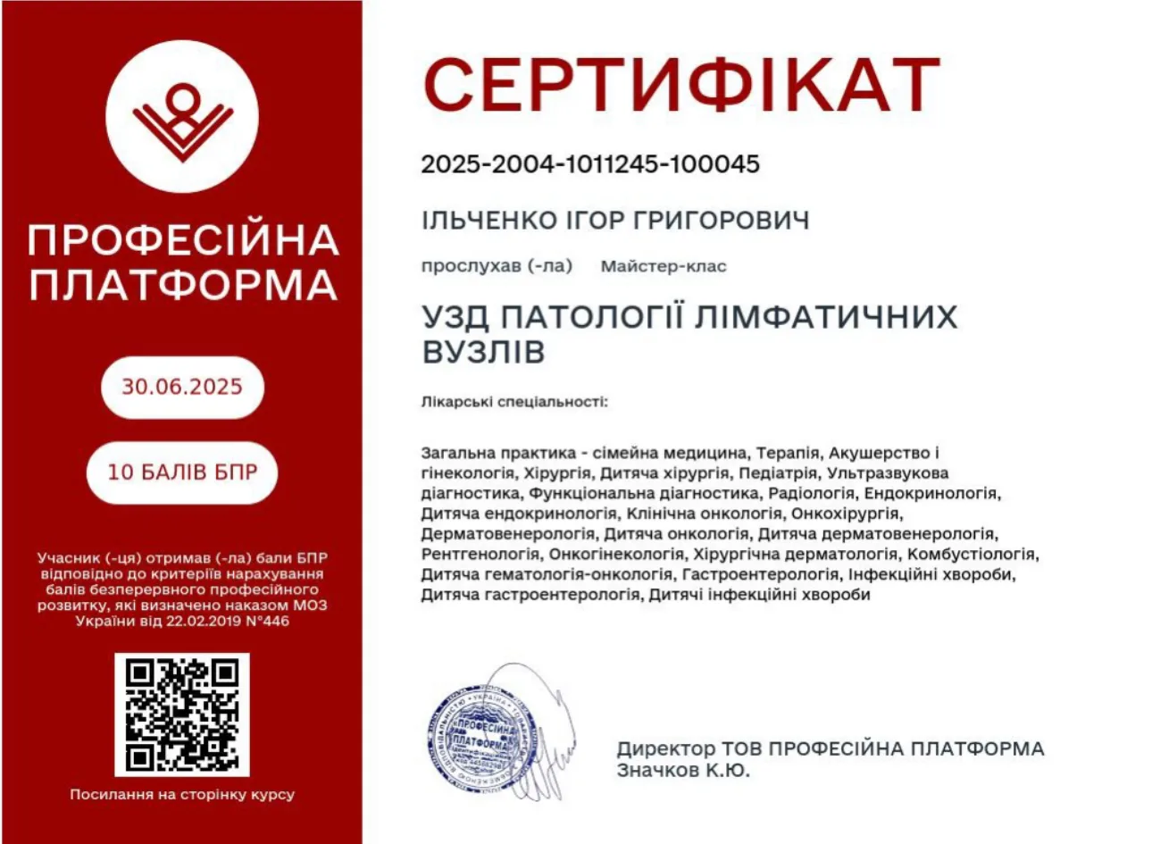 - 2005 р. – ДЗ “Дніпропетровська медична академія” МОЗ України, спеціалізація «Ультразвукова діагностика»;