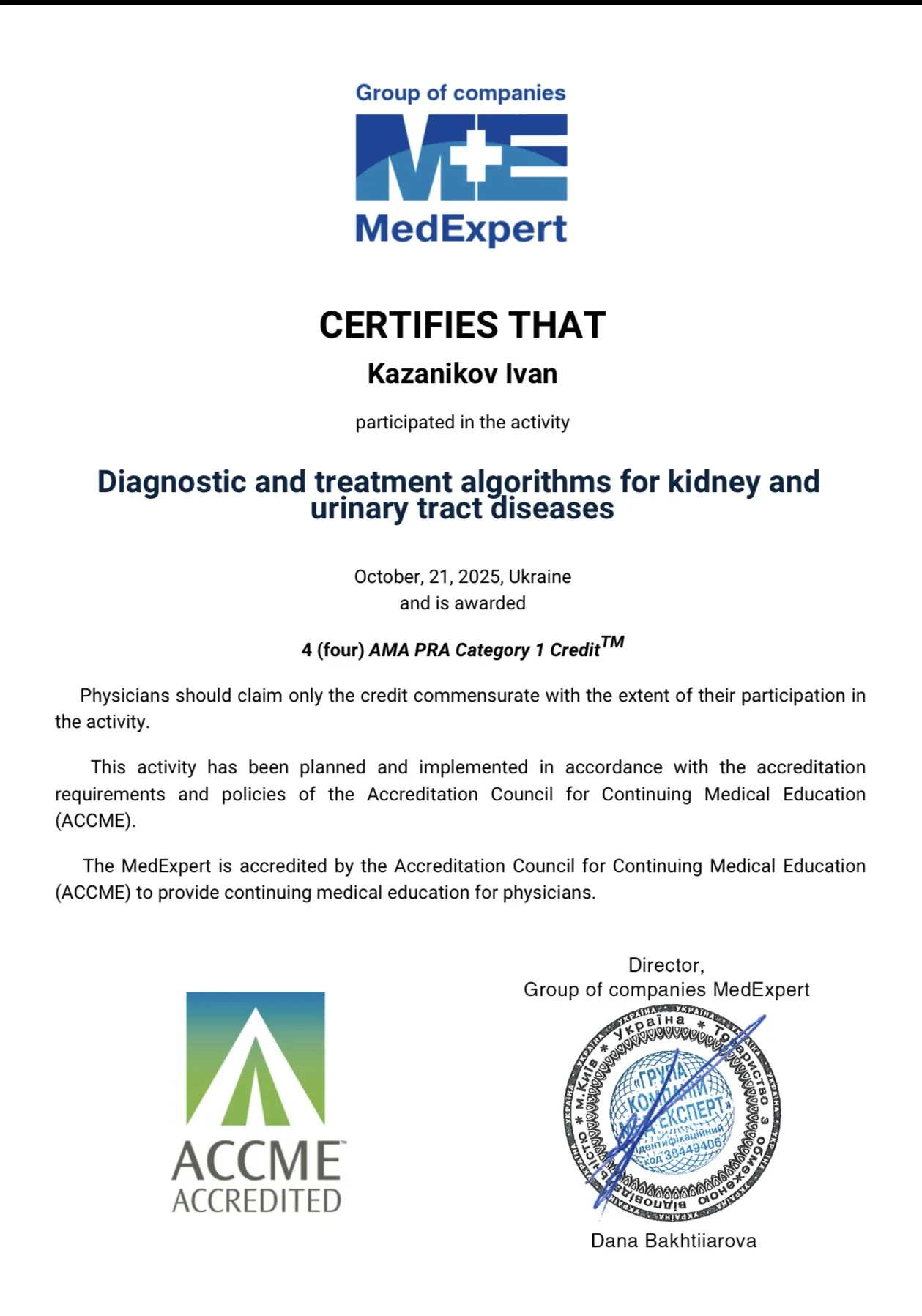 - 2025 р. -Дніпропетровський державний медичний університет МОЗ України, спеціалізація “Урологія”