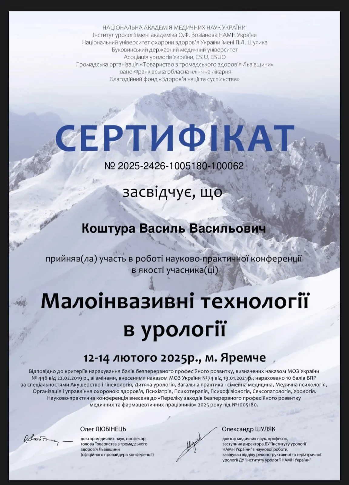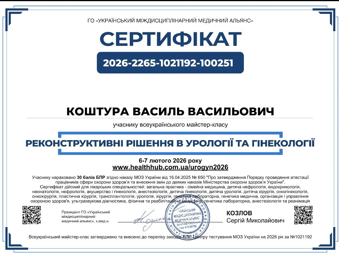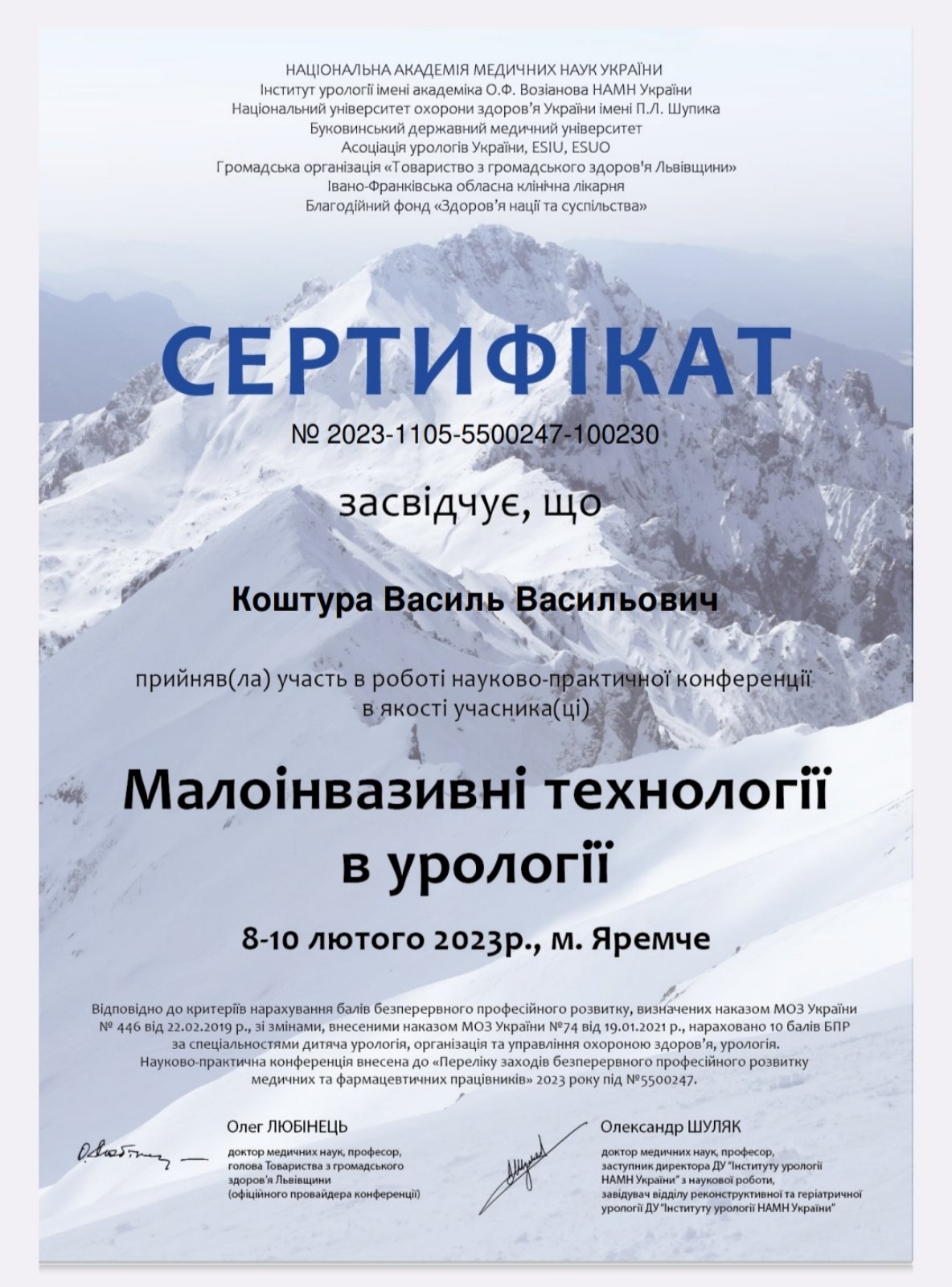- 2016 р. – ТУ “Урологія, андрологія, нефрологія”;