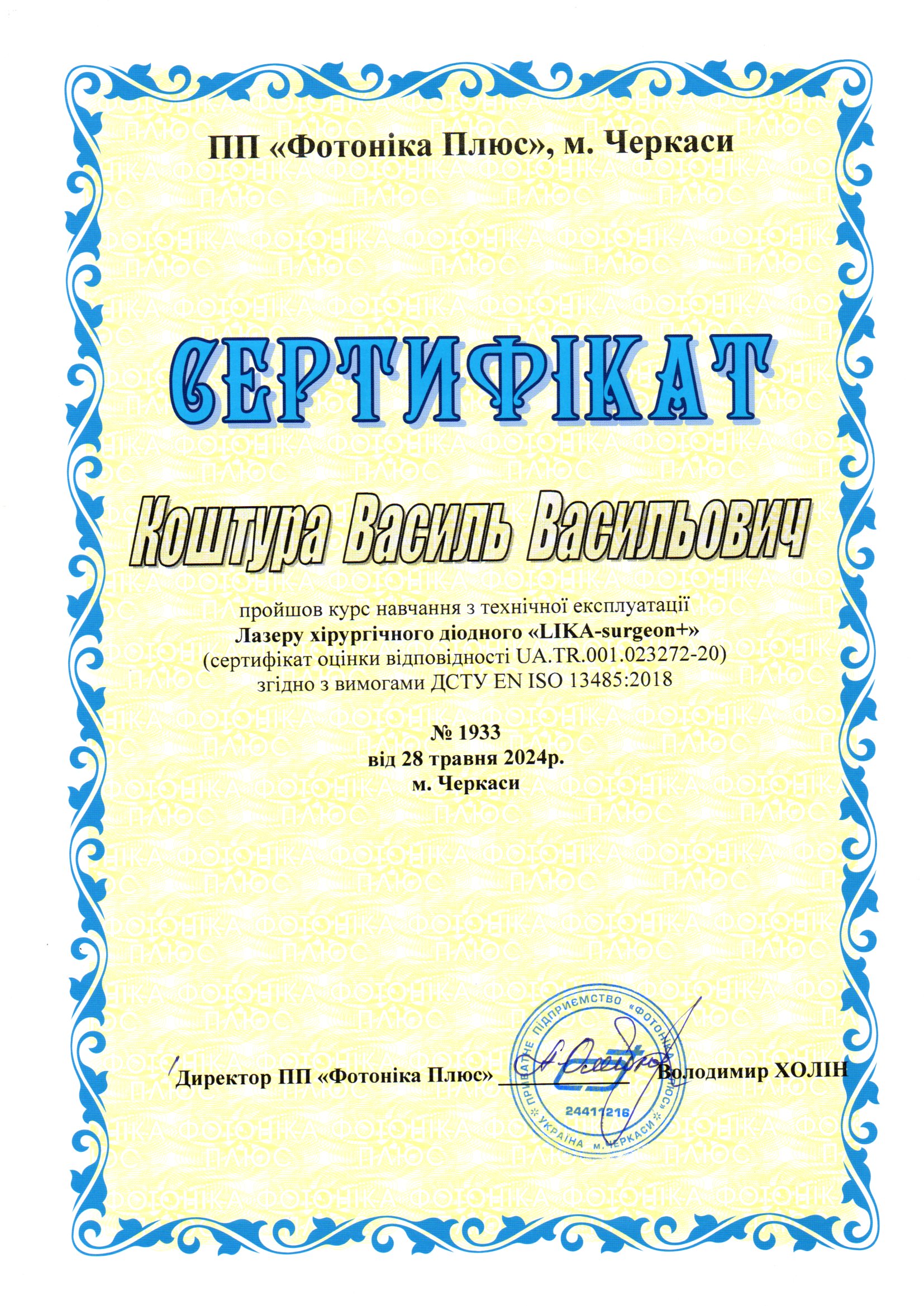 - 1990 р. – Дніпропетровська Державна медична Академія, спеціалізація “Урологія”;