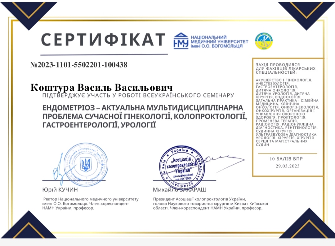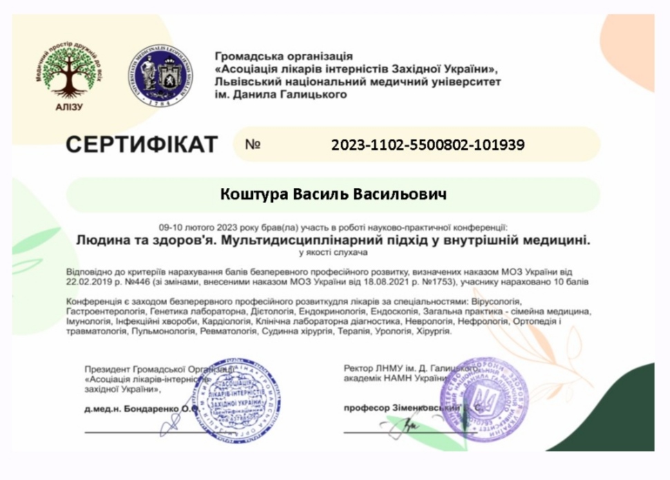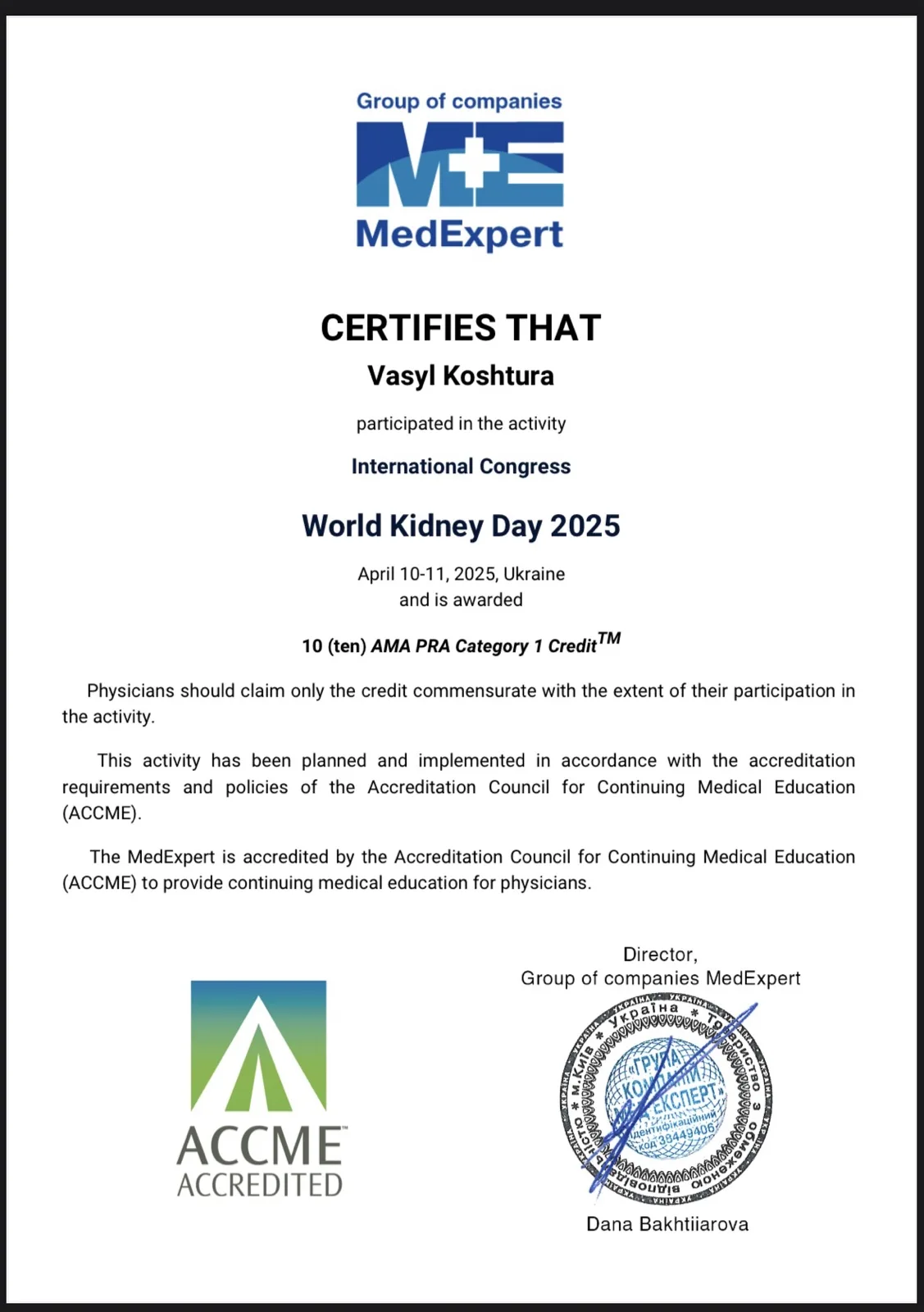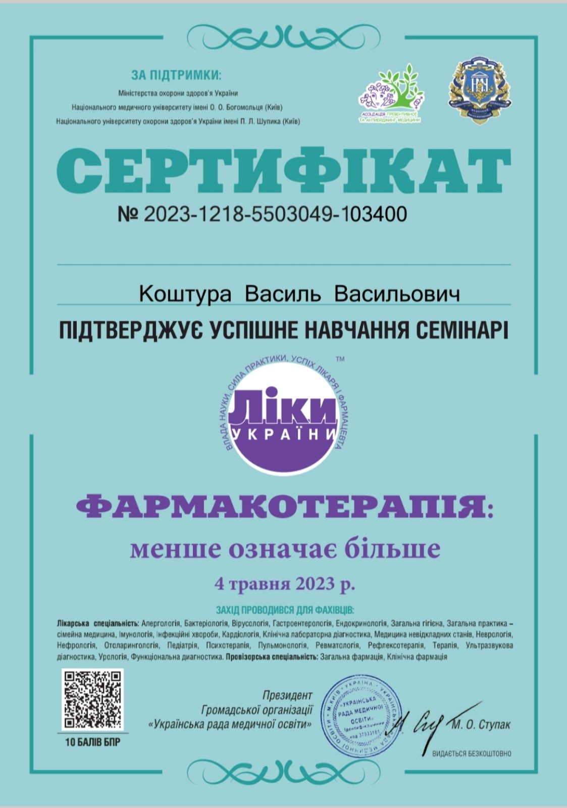 - 2018 р. – Тематичне удосконалення “Невідкладна допомога урологічним хворим”;