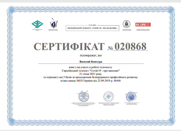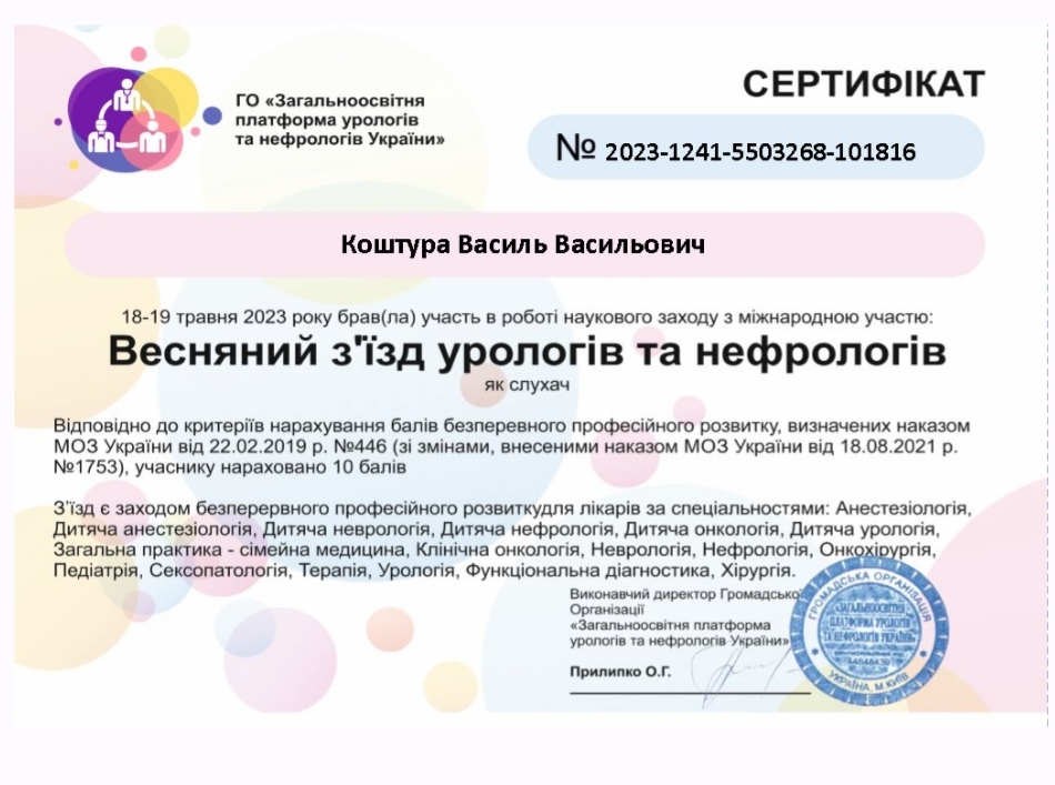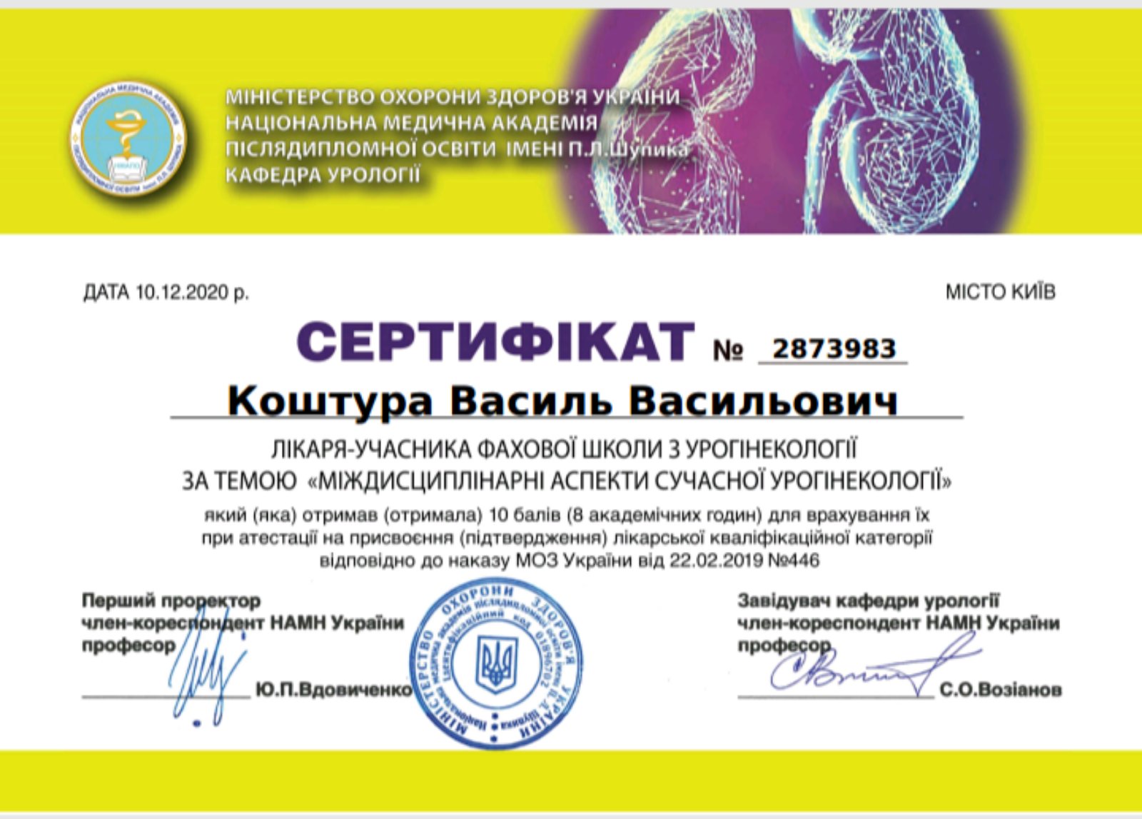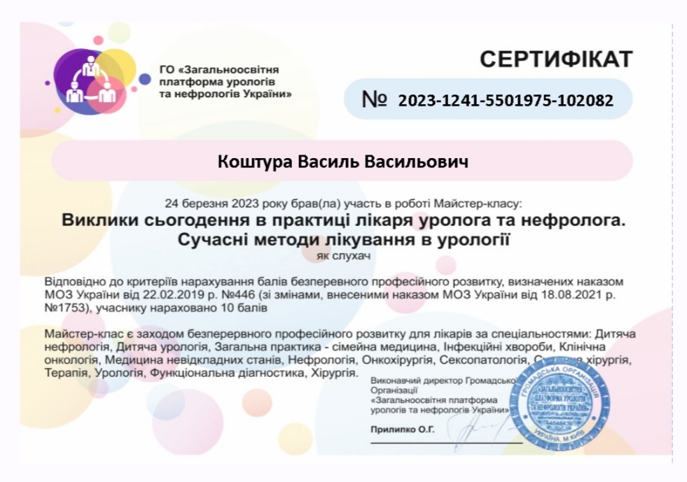 - 2020 р. – Тематичне удосконалення “Сучасні питання урології”.