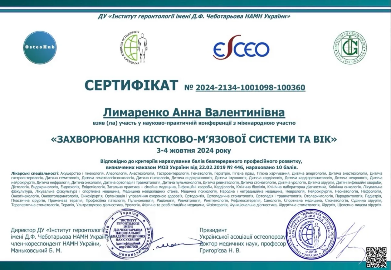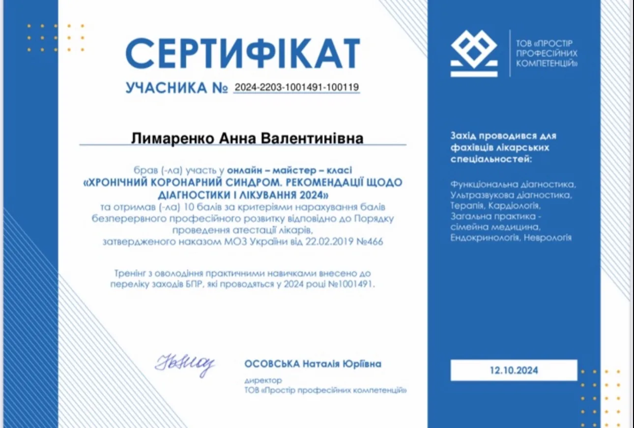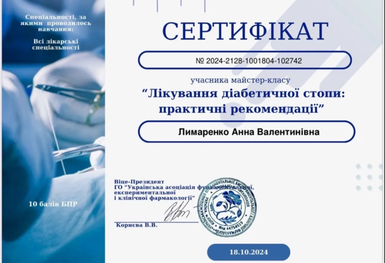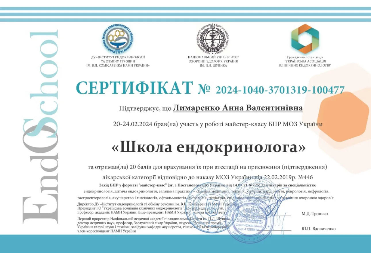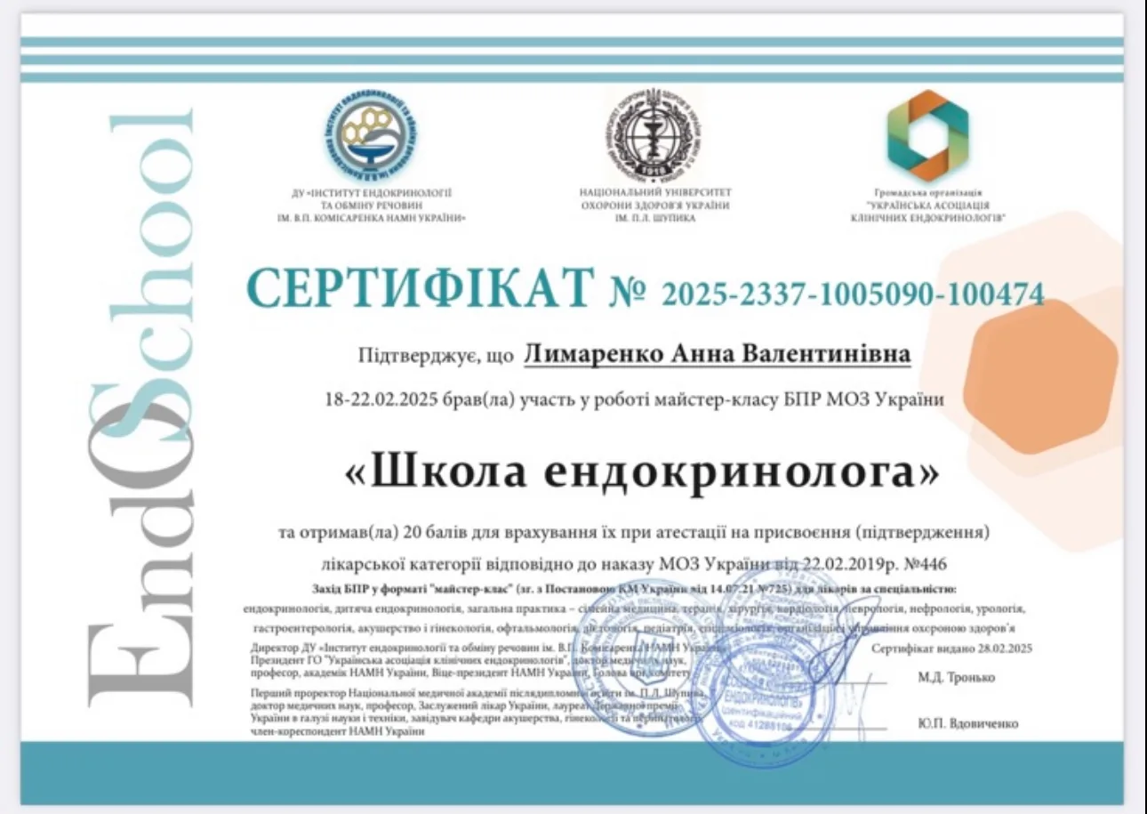 - 2023 р. – ДЗ “Дніпропетровська медична академія” МОЗ України, спеціалізація “Ендокринологія”.