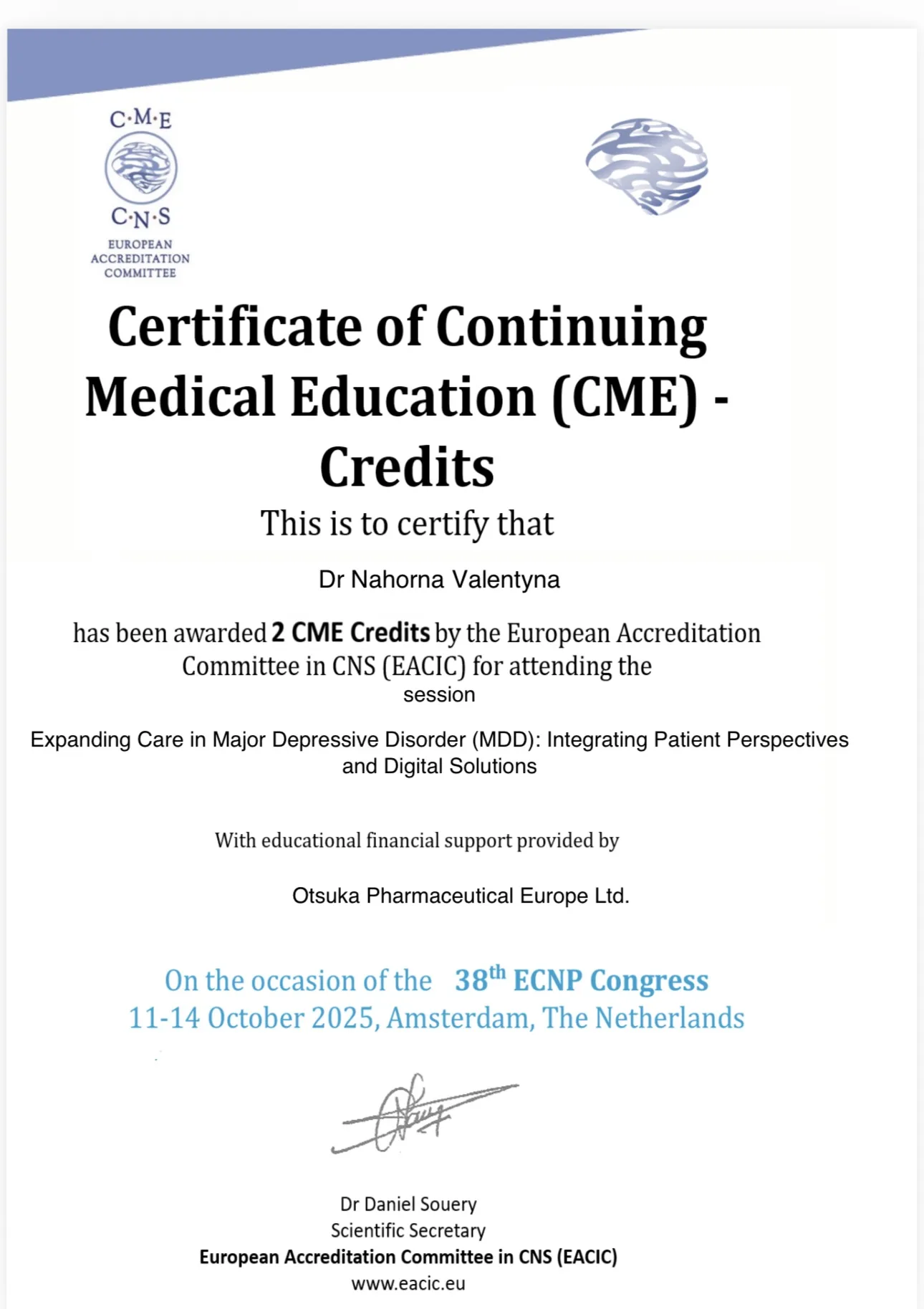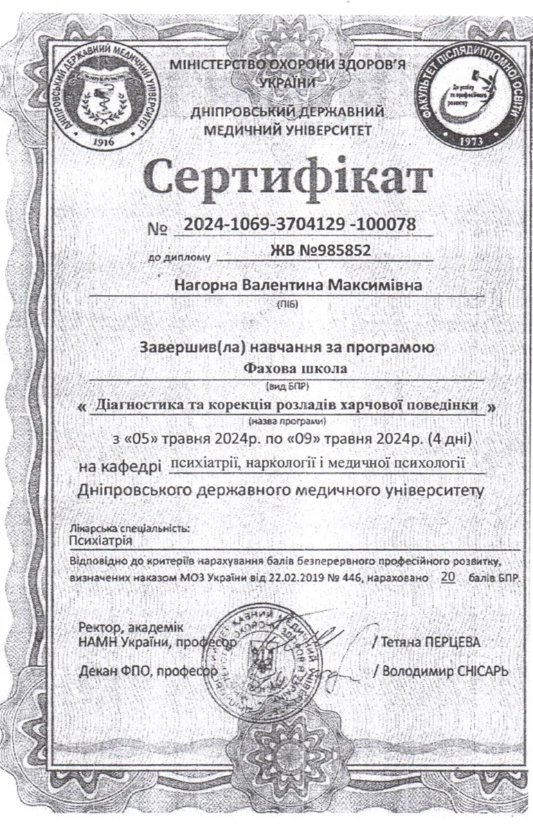 - 2018 р. – підтверджено вищу кваліфікаційну категорію за спеціалізацією “Психіатрія”.