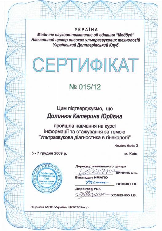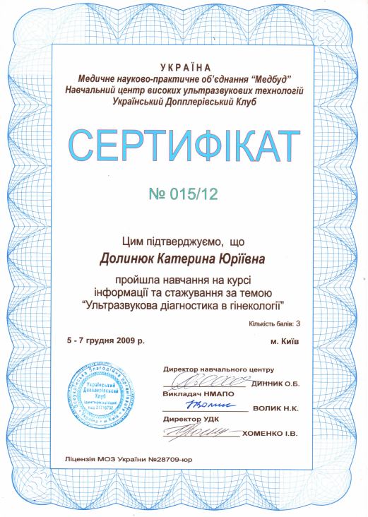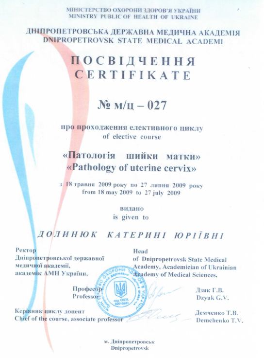 - 2009 р. – Дніпропетровська державна медична академія, спеціалізація “Акушерство та гінекологія”;