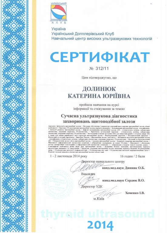 - 2014 р. – курси тематичного удосконалення лікарів «УЗД молочних залоз та мамографія»;