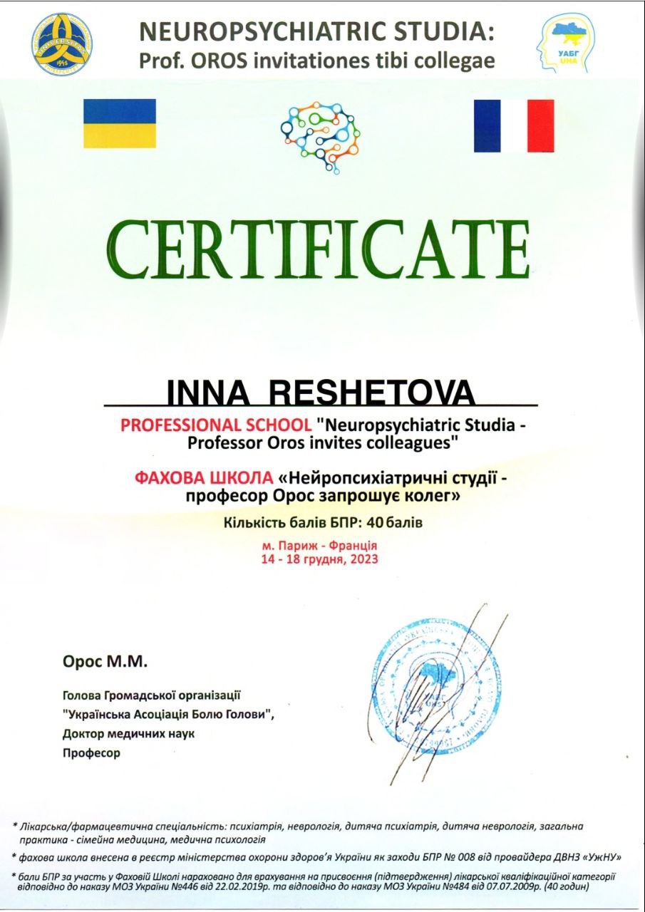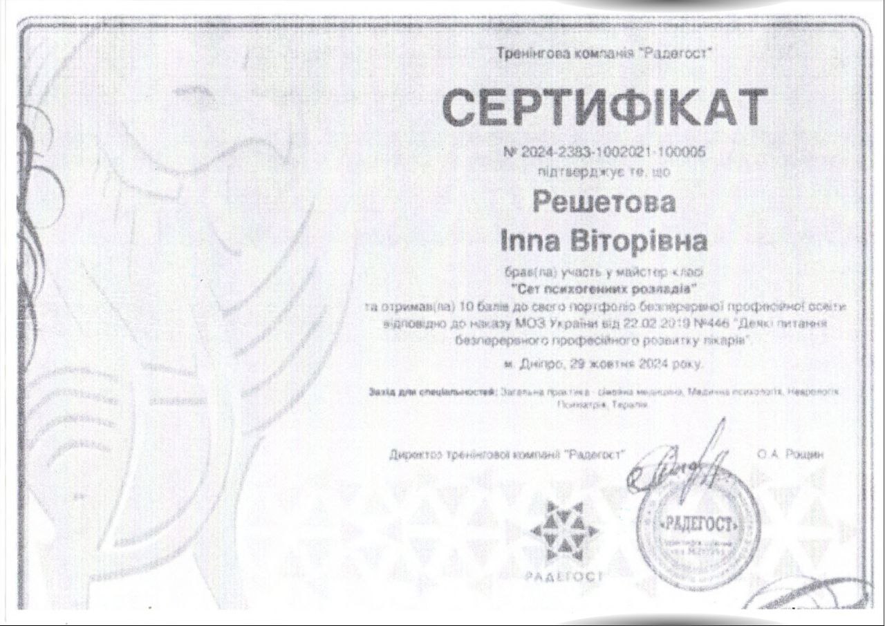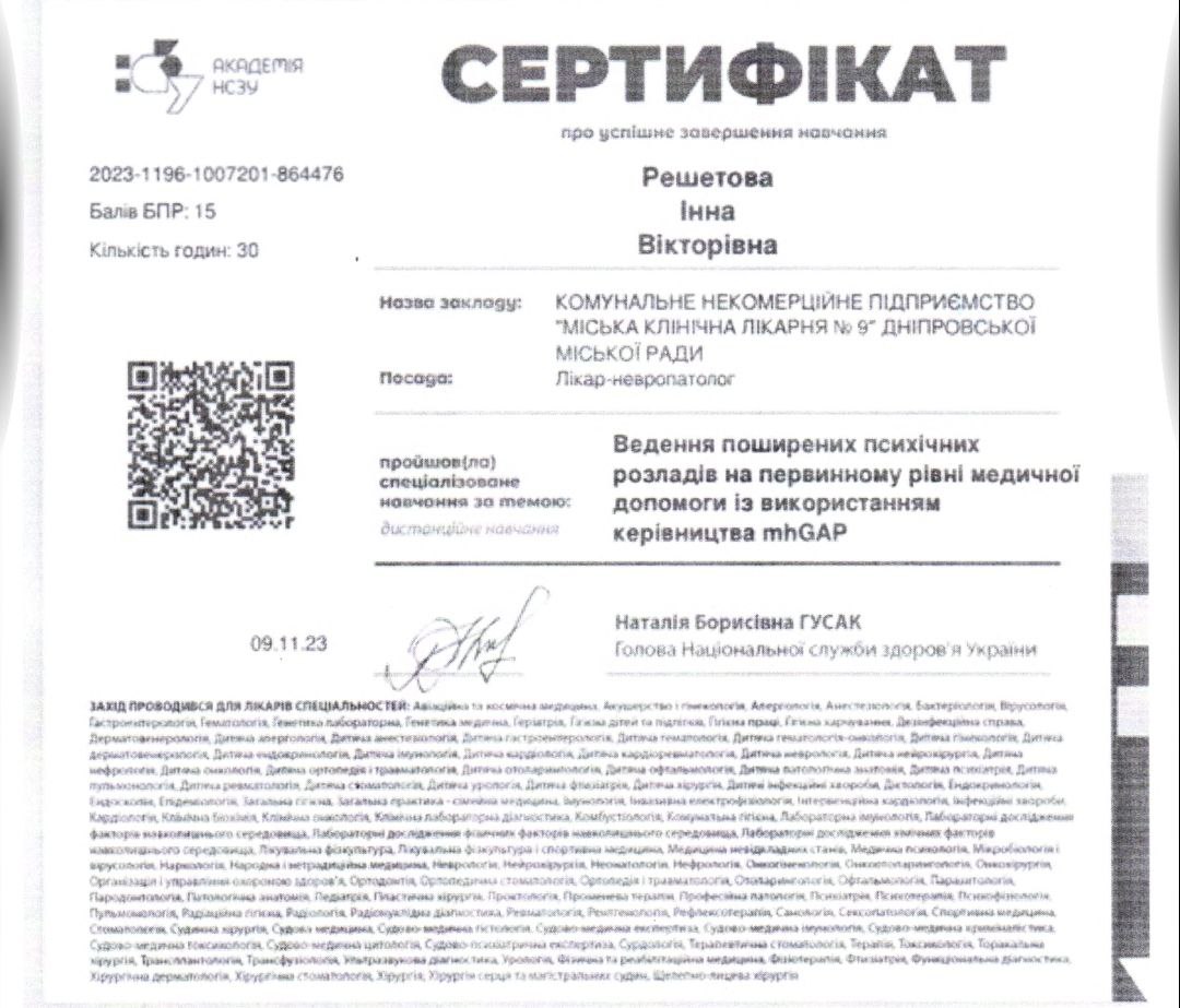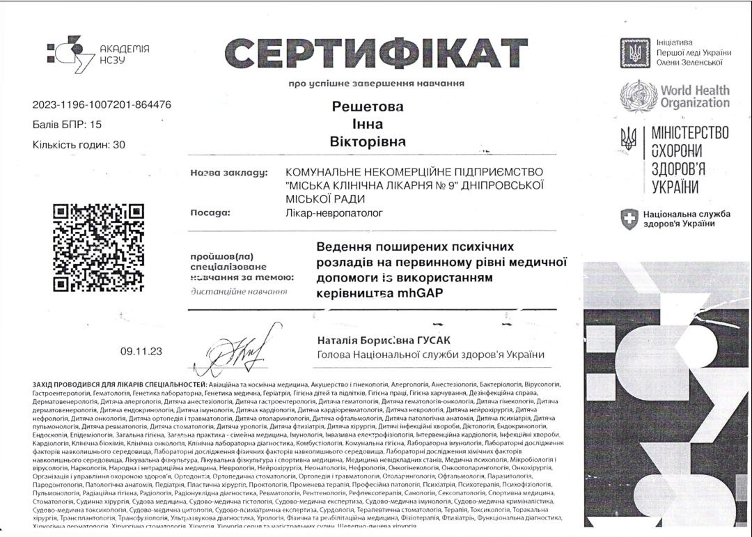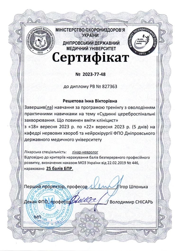 - 1989 р. – ДЗ “Дніпропетровська медична академія” МОЗ України, спеціалізація “Неврологія”.