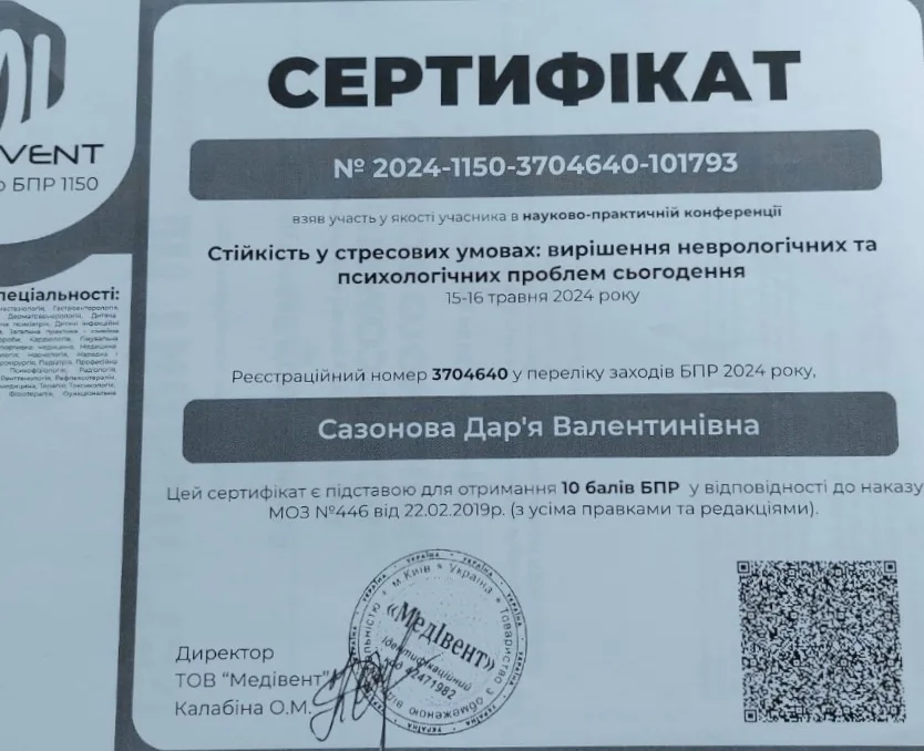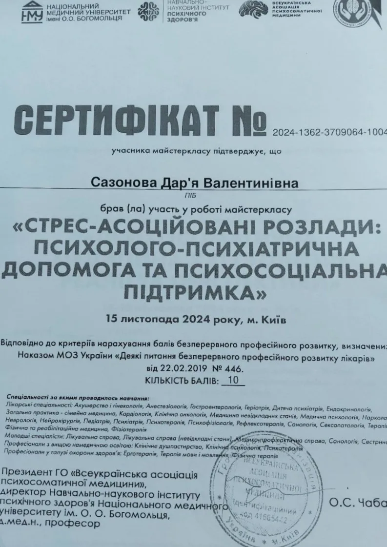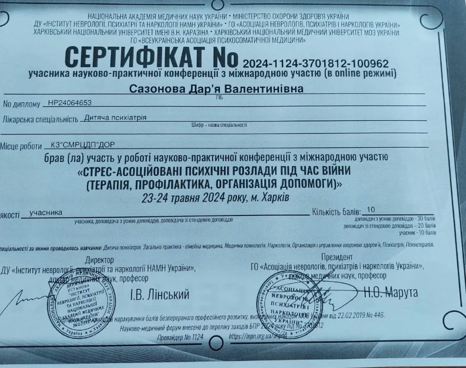 - 2005 р. – Дніпропетровська державна медична академія, спеціалізація “Психіатрія”;