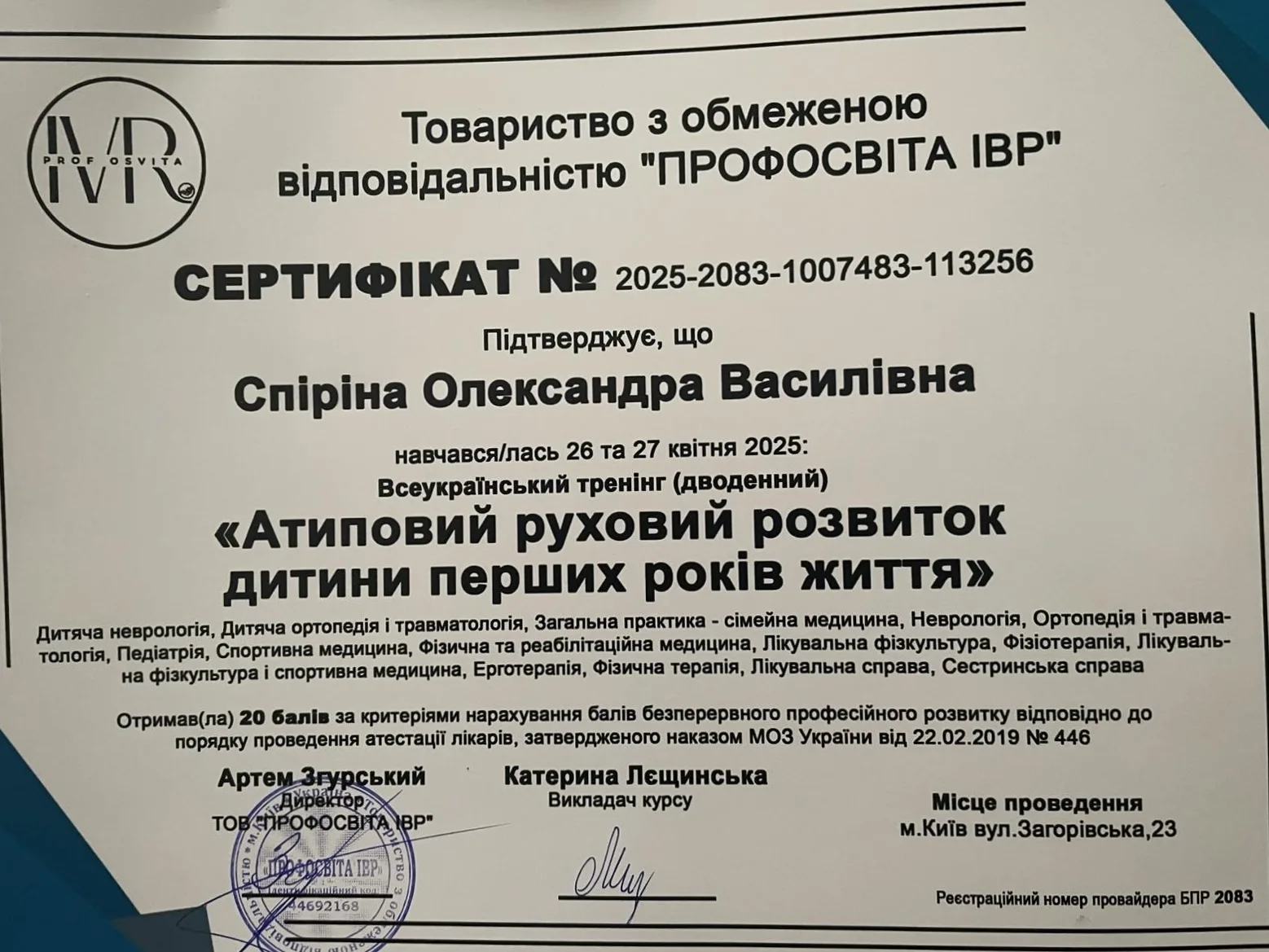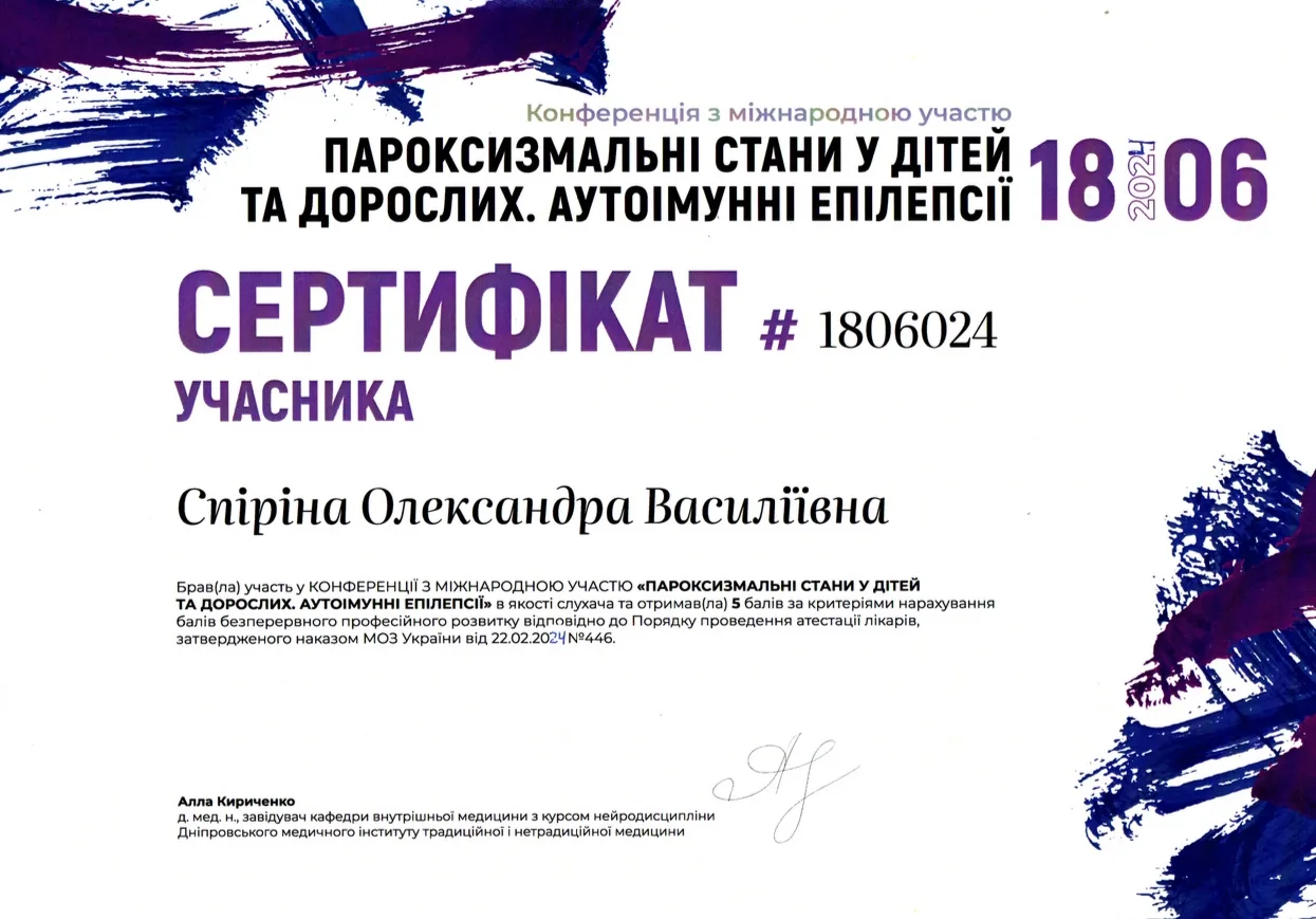 - 2016 р. – ДЗ “Дніпропетровська медична академія” МОЗ України, спеціалізація “Дитяча неврологія”.