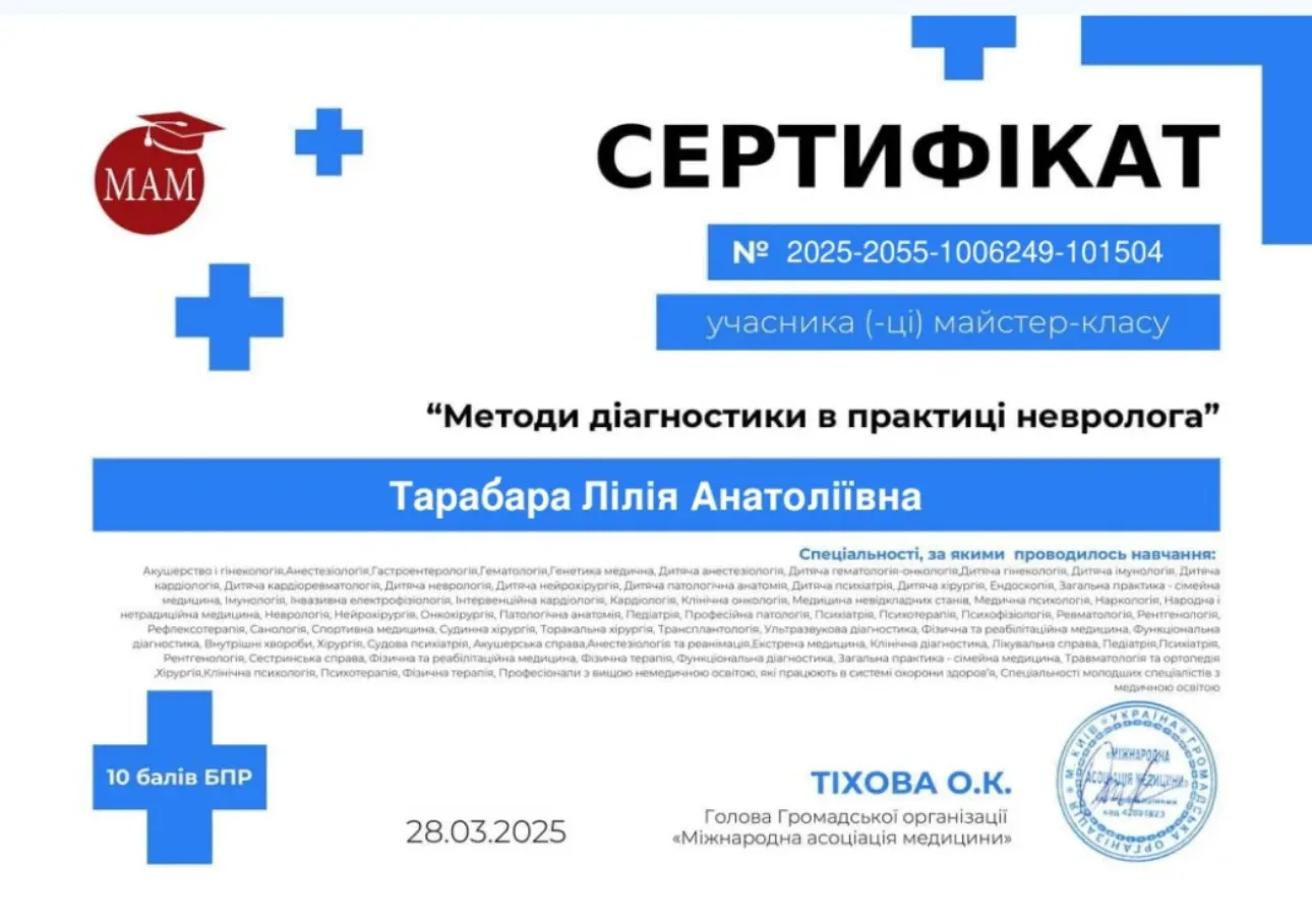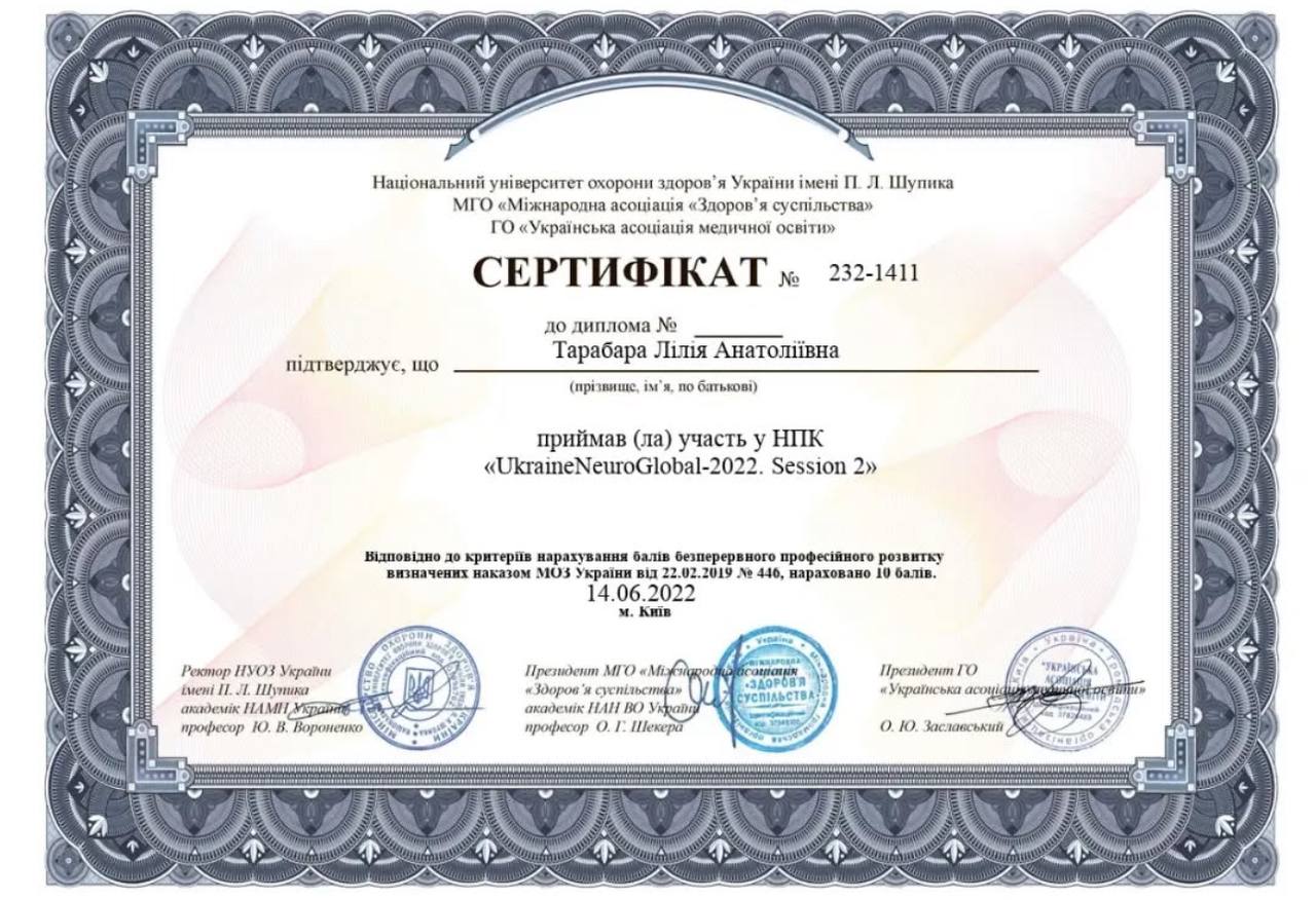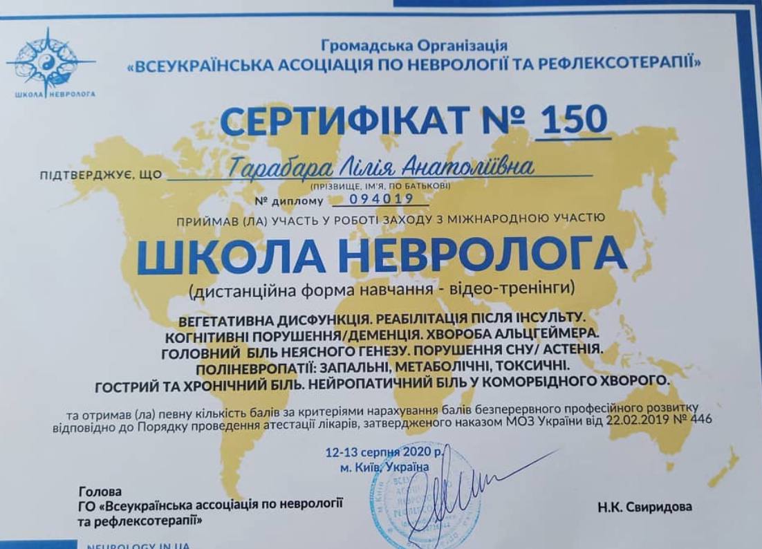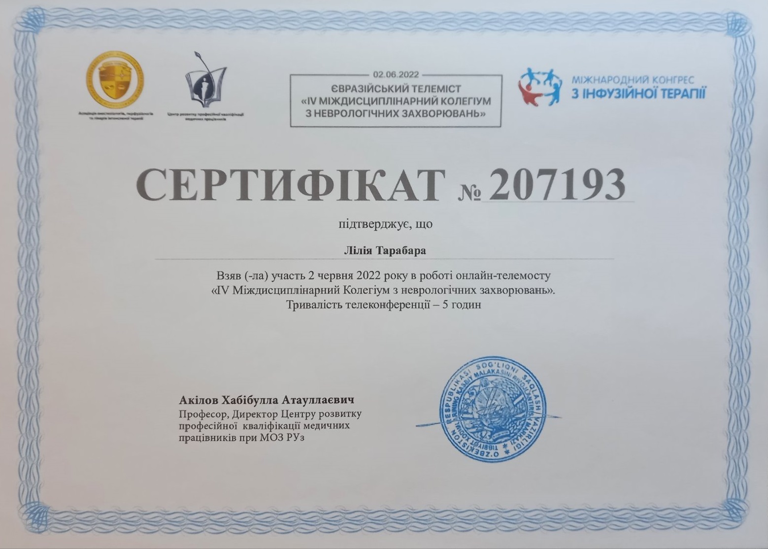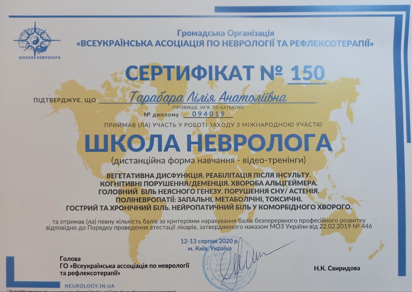 - 2017 р. – ДЗ “Дніпропетровська медична академія” МОЗ України, спеціалізація “Неврологія”.