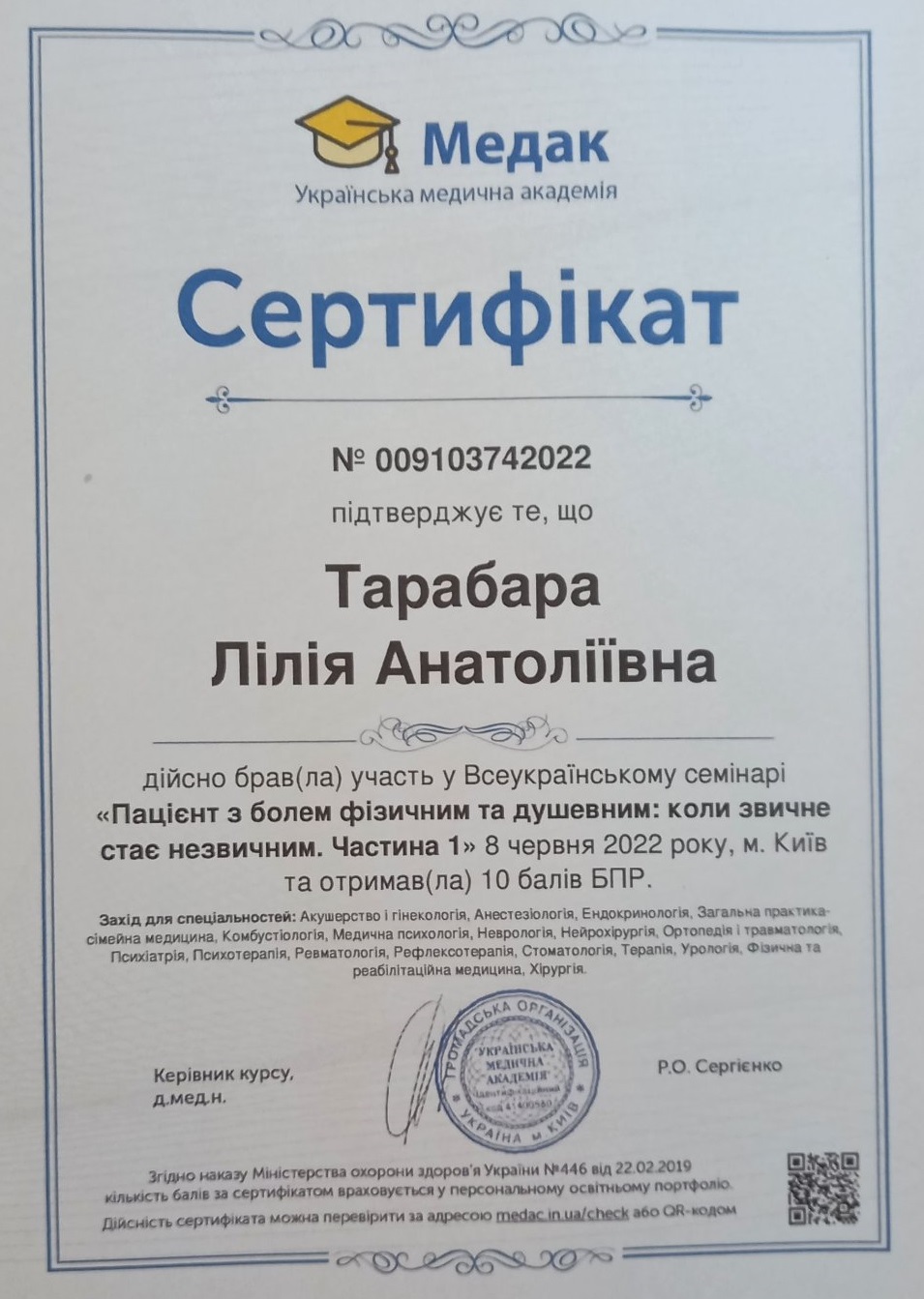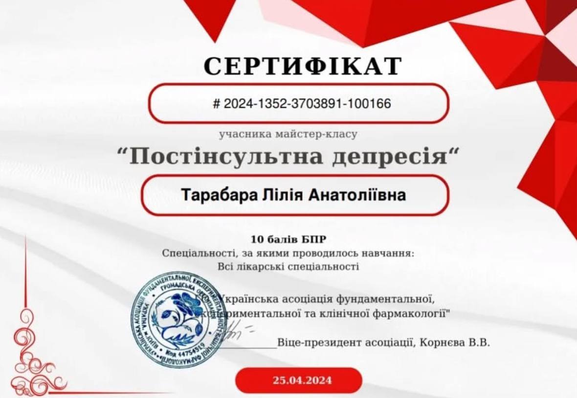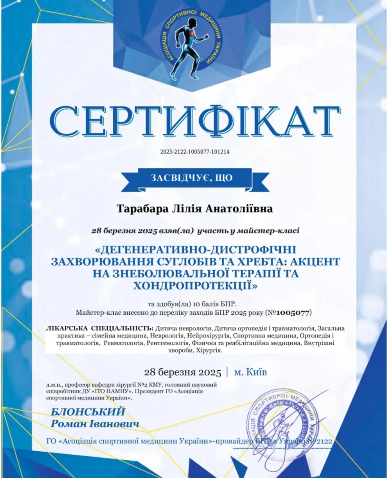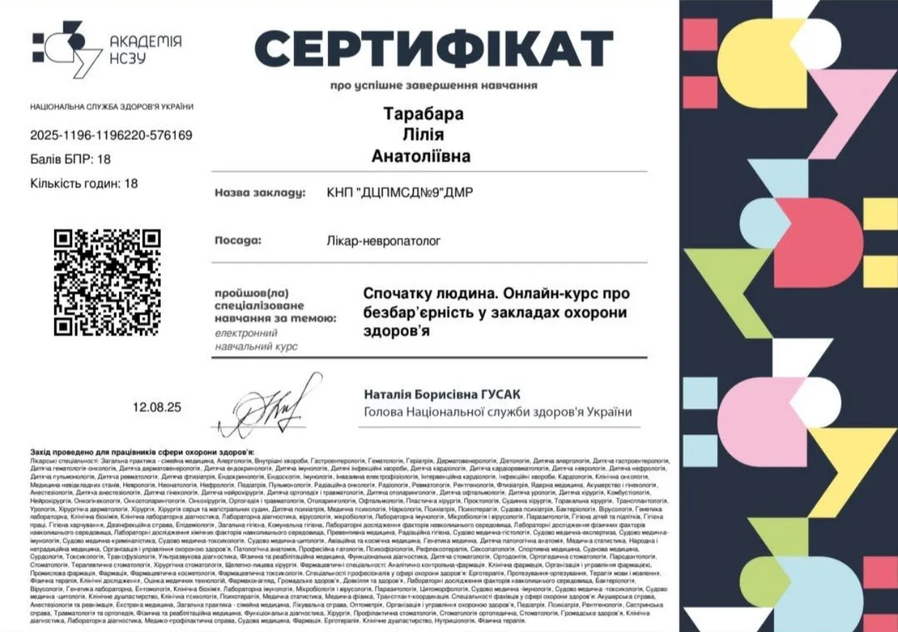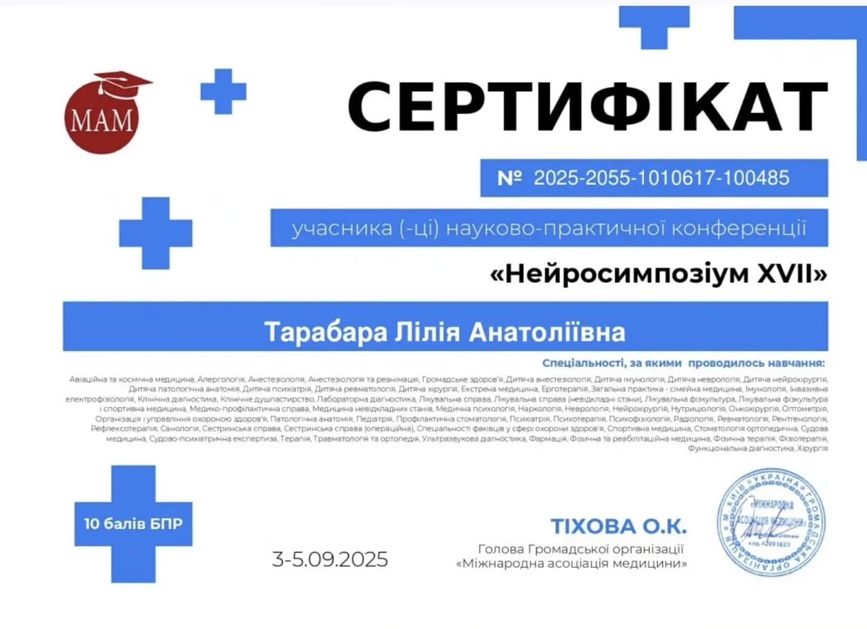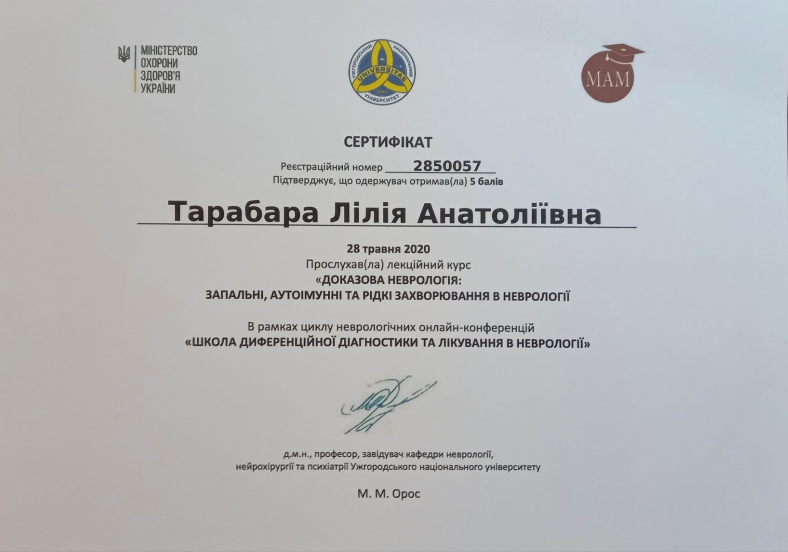 - 2017 р. – ДЗ “Дніпропетровська медична академія” МОЗ України, спеціалізація “Неврологія”.