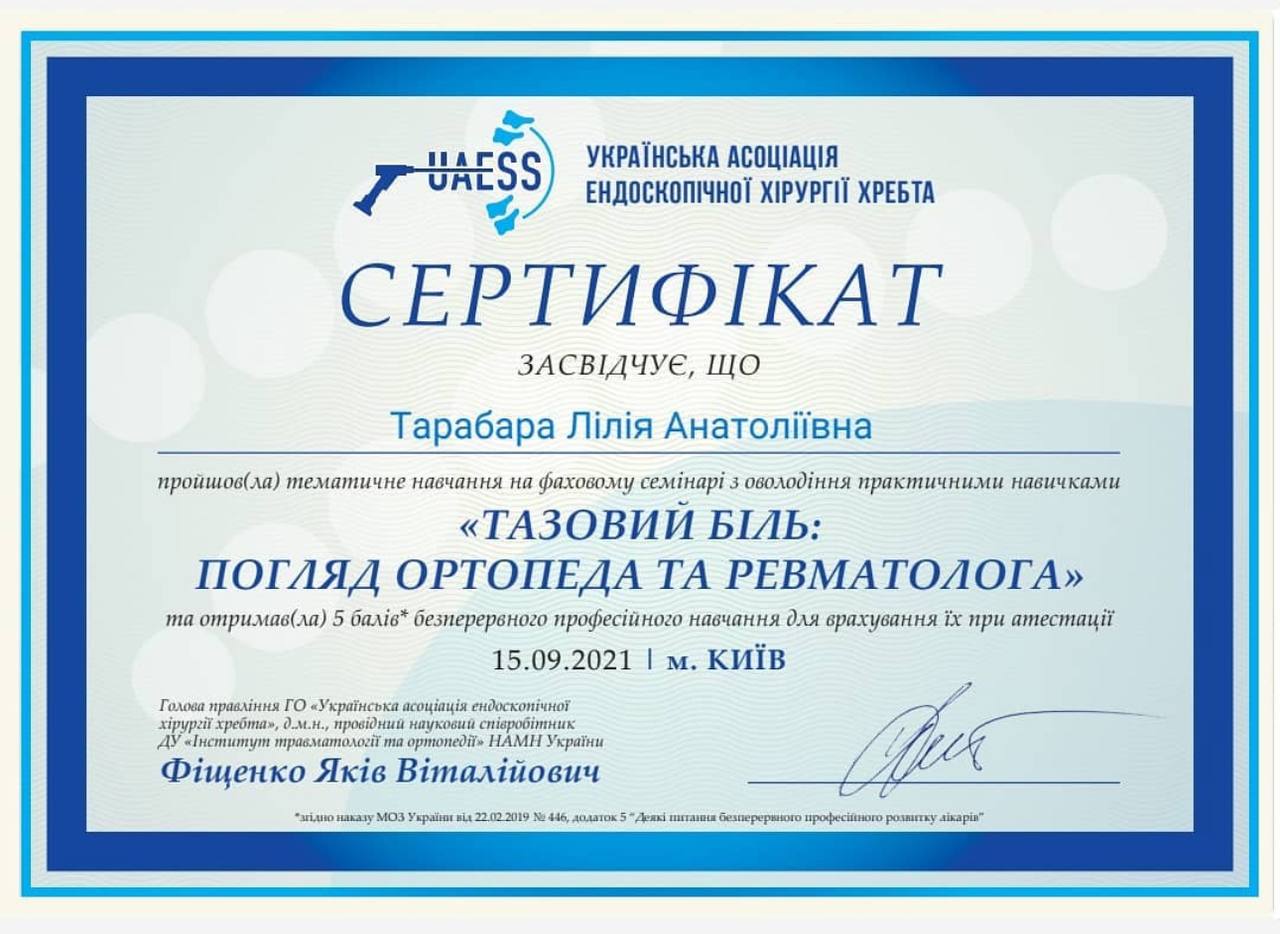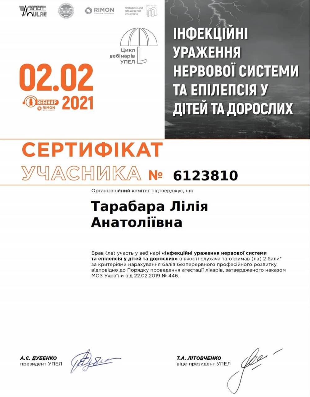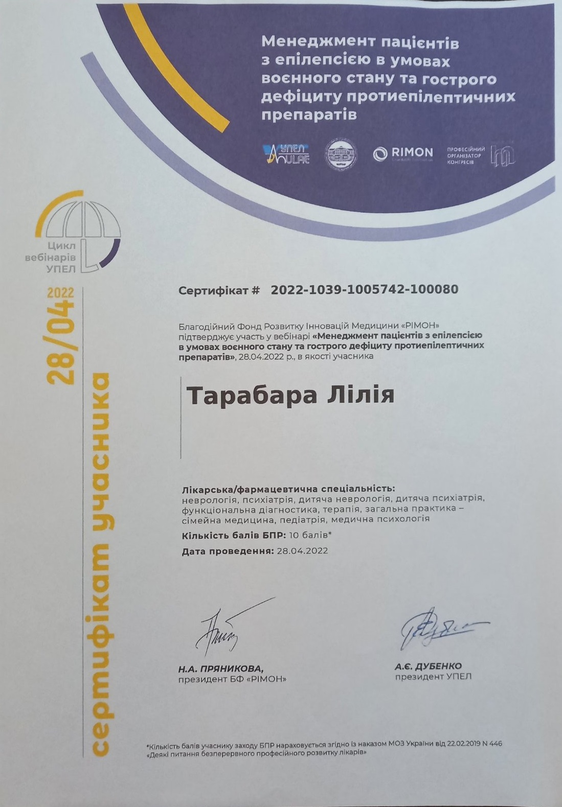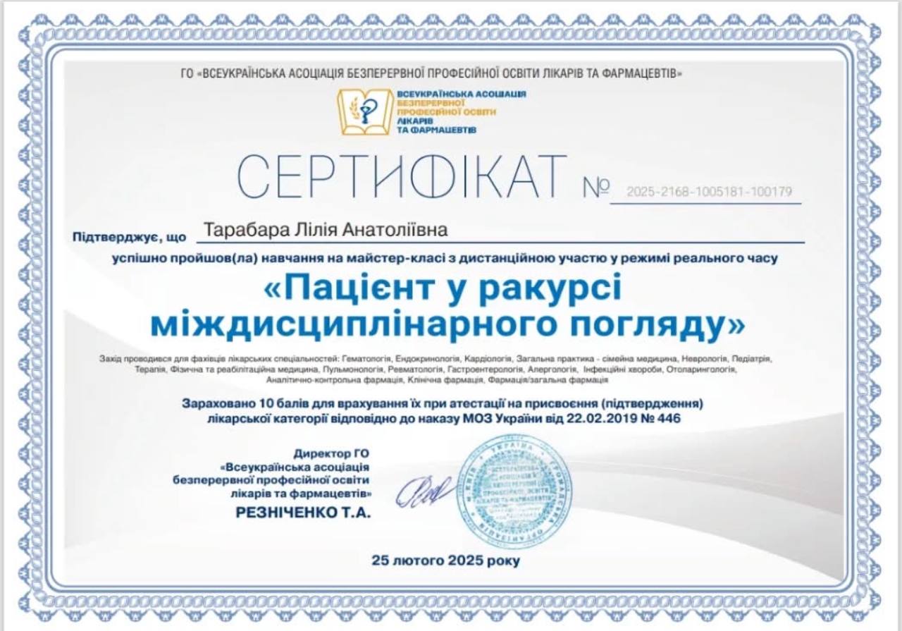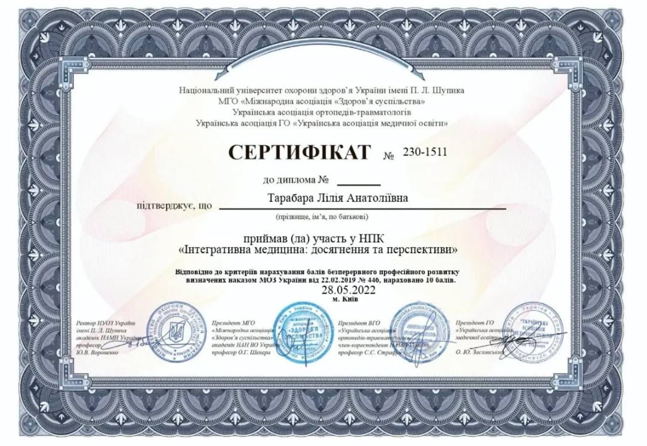 - 2017 р. – ДЗ “Дніпропетровська медична академія” МОЗ України, спеціалізація “Неврологія”.