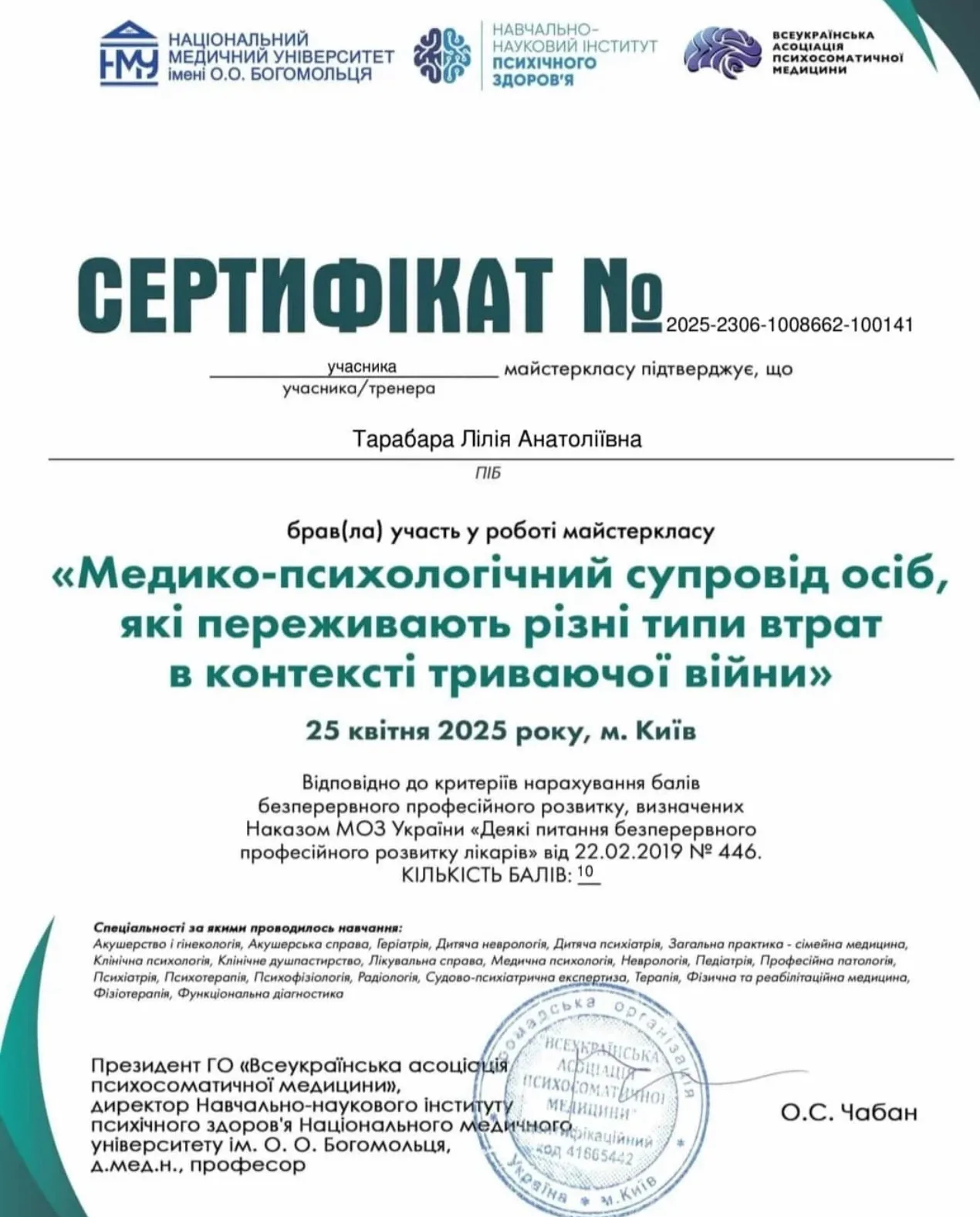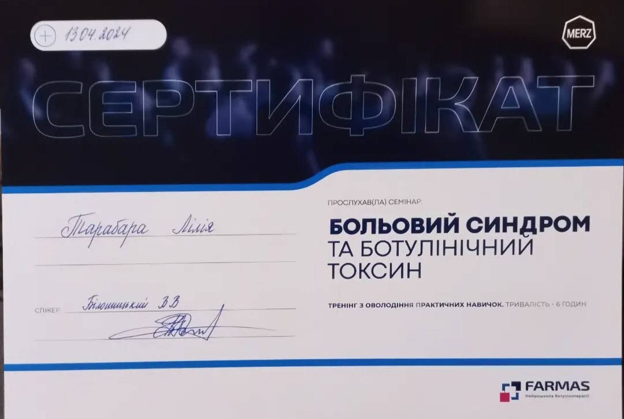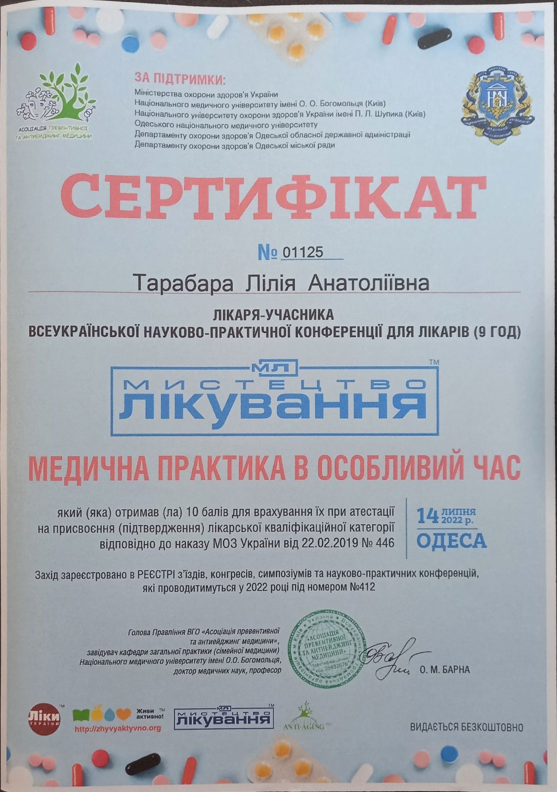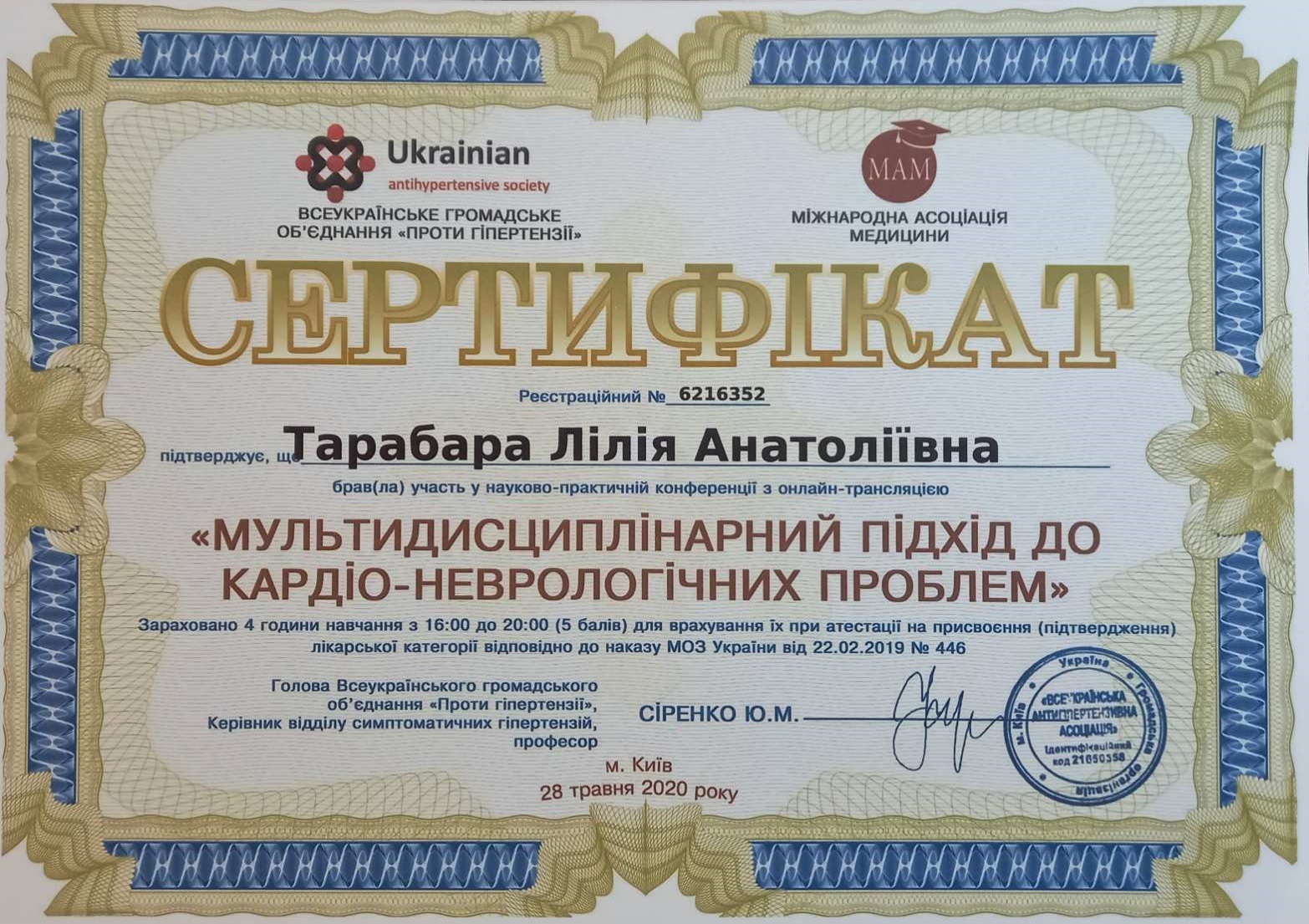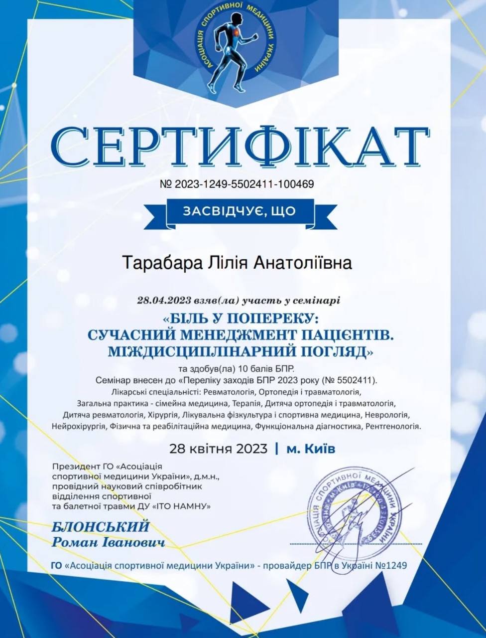 - 2017 р. – ДЗ “Дніпропетровська медична академія” МОЗ України, спеціалізація “Неврологія”.