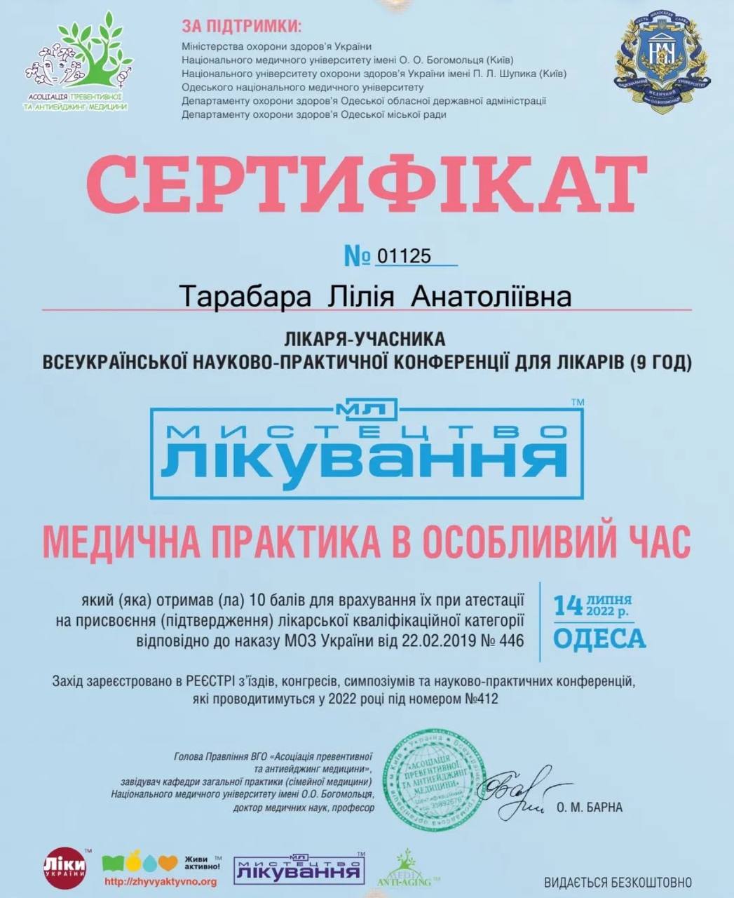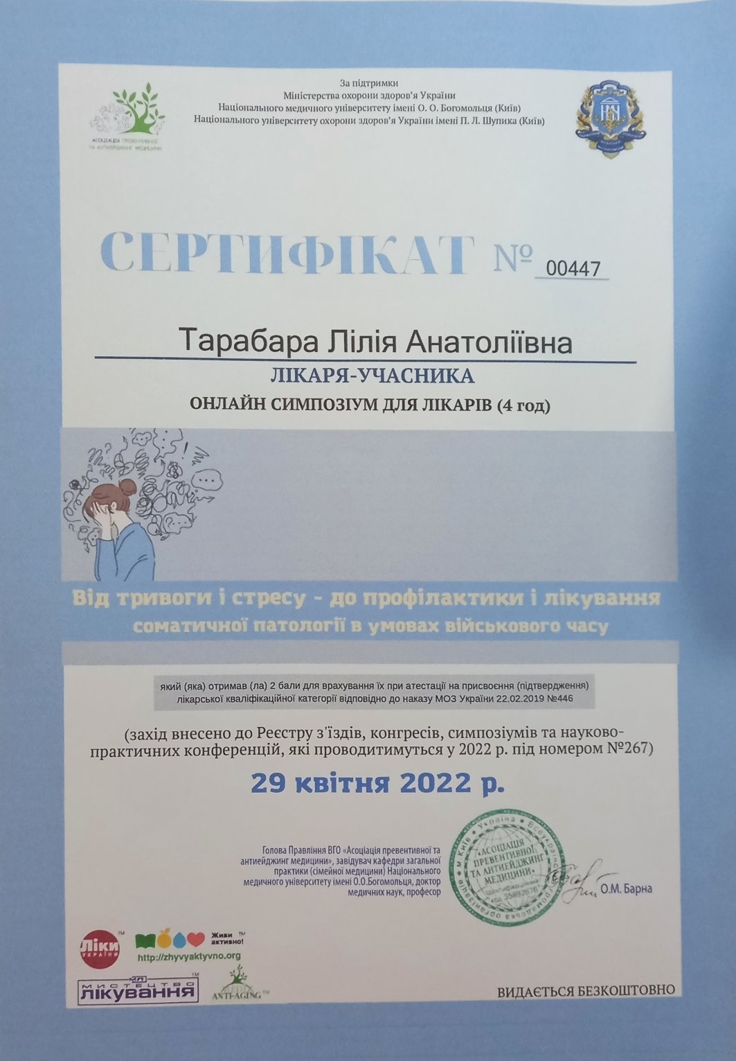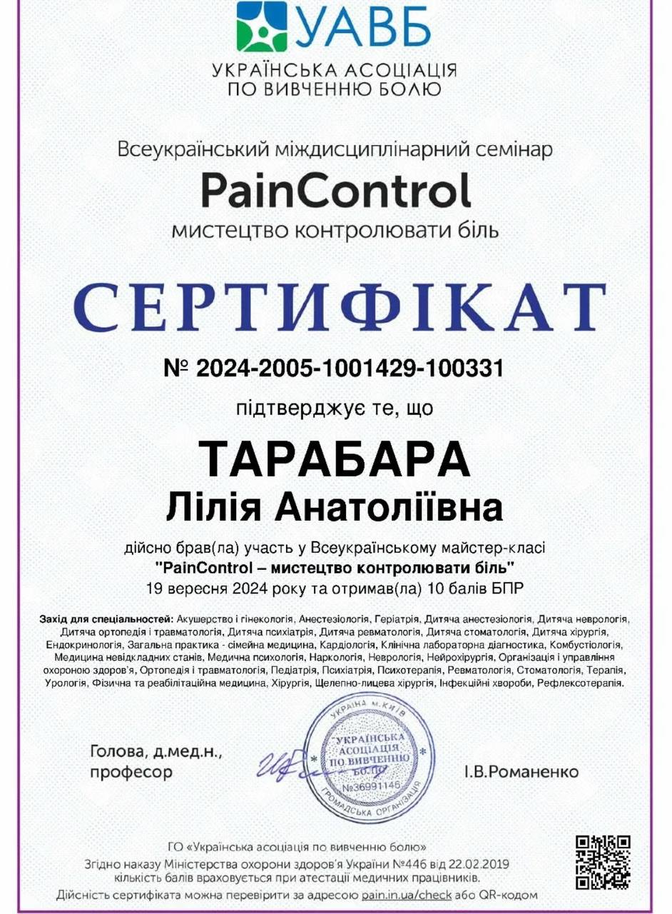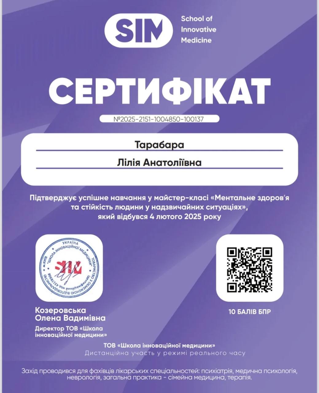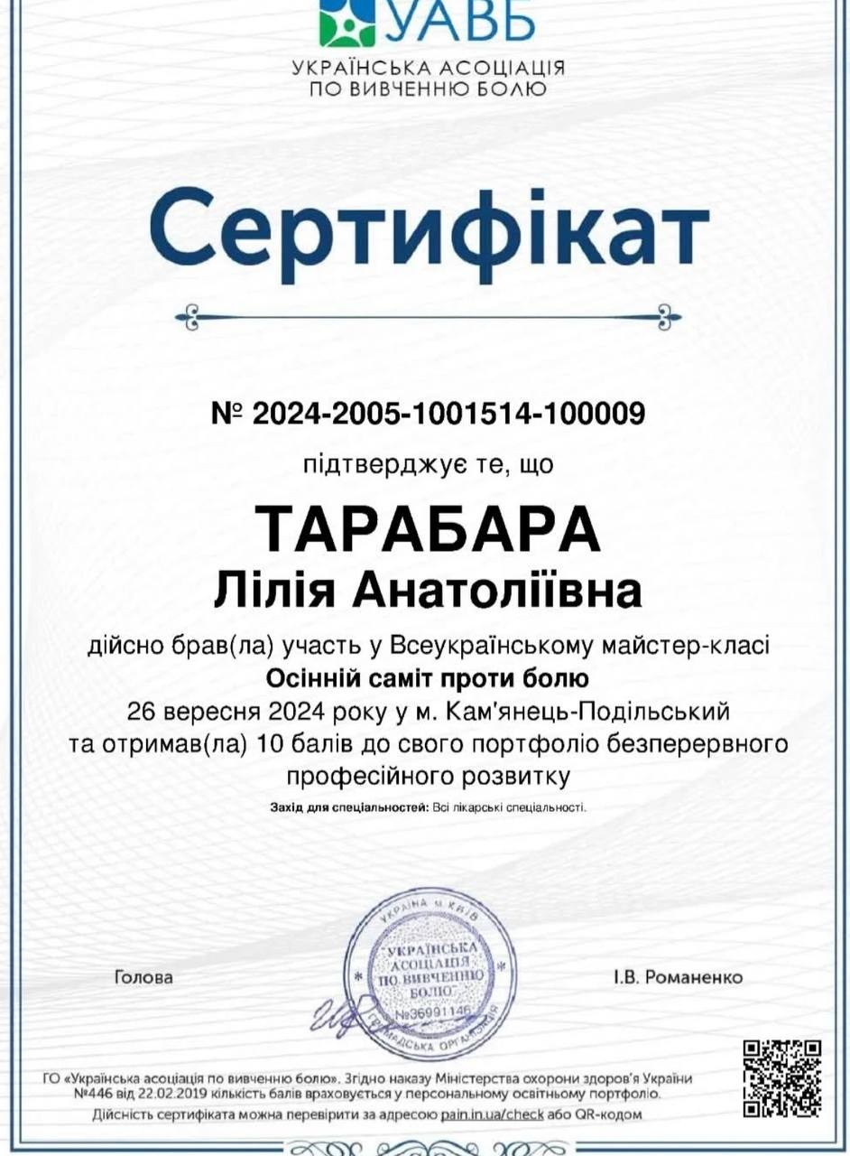 - 2017 р. – ДЗ “Дніпропетровська медична академія” МОЗ України, спеціалізація “Неврологія”.