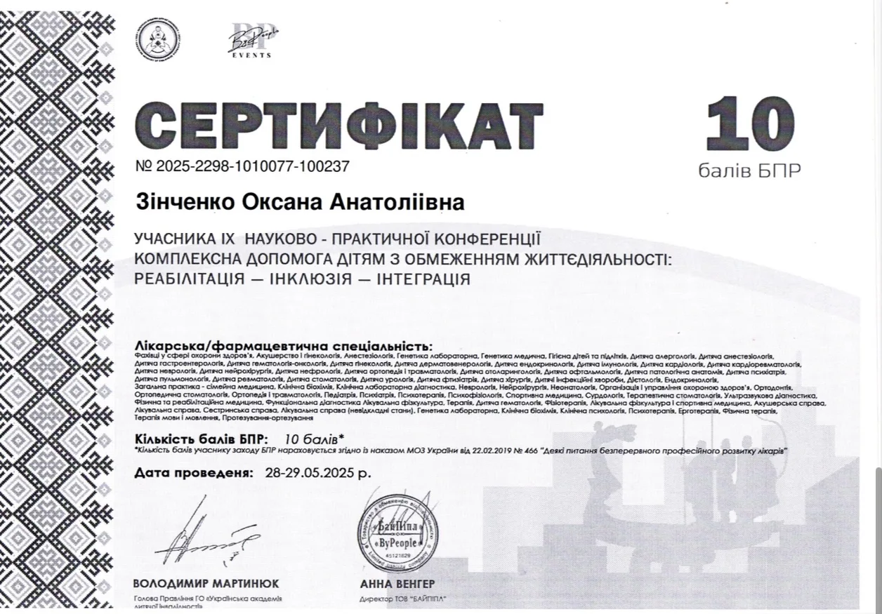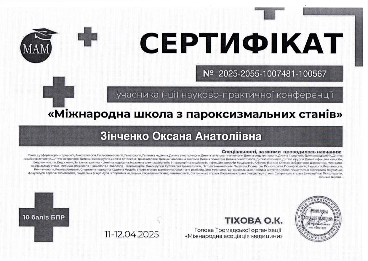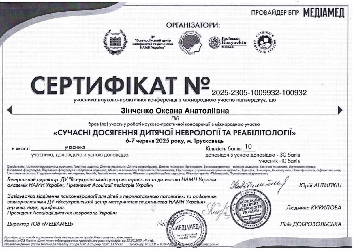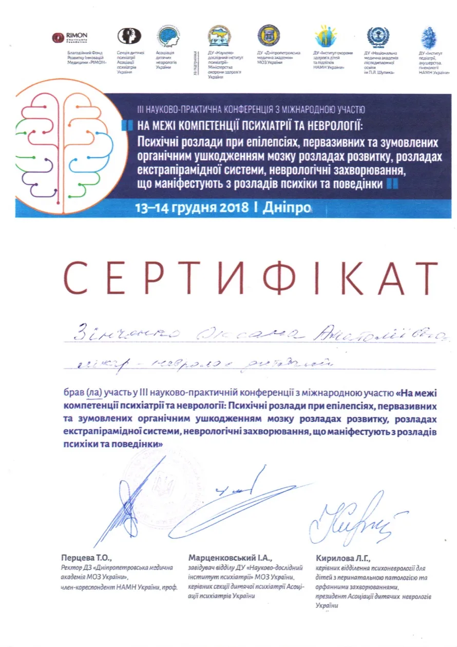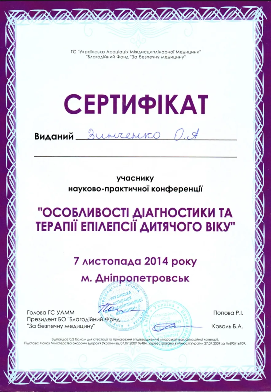 - 1997 р. – ДЗ “Дніпропетровська медична академія” МОЗ України, спеціалізація “Дитяча неврологія”.