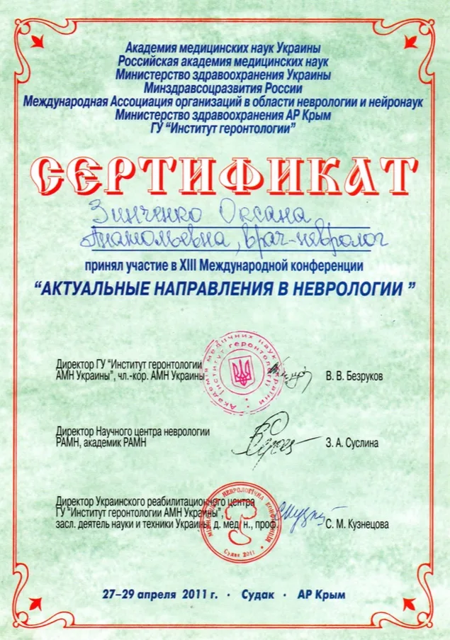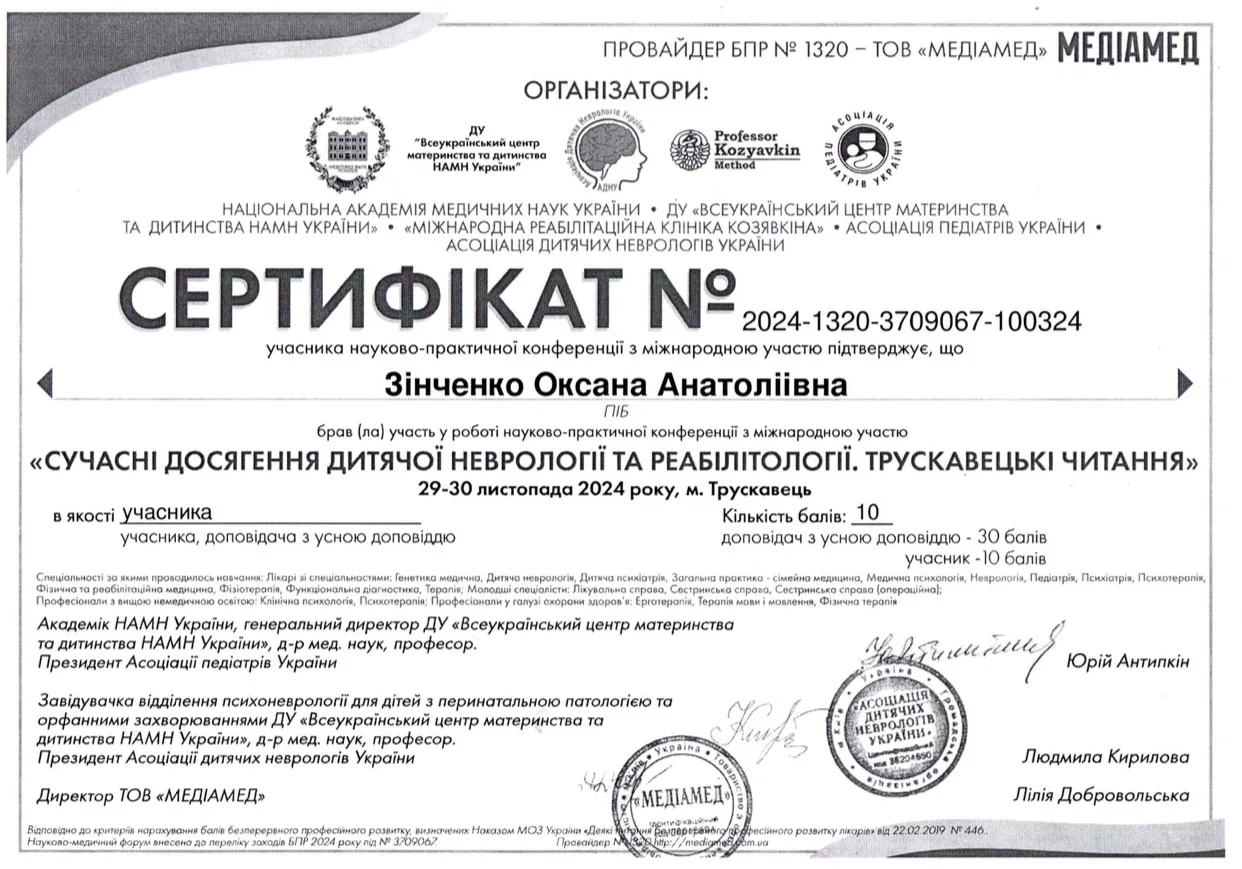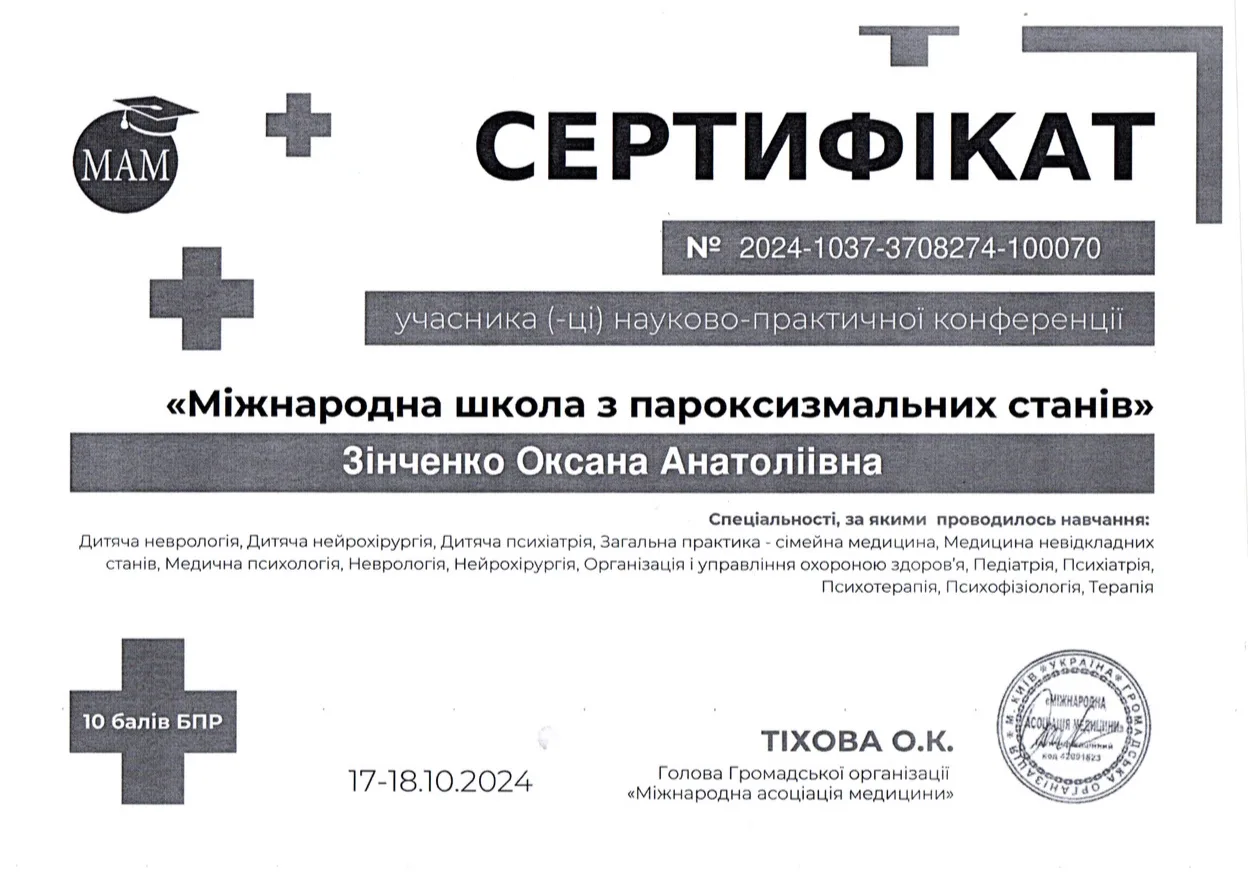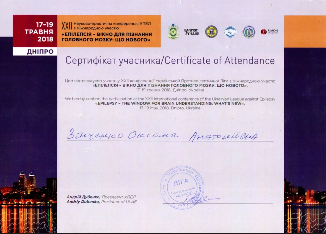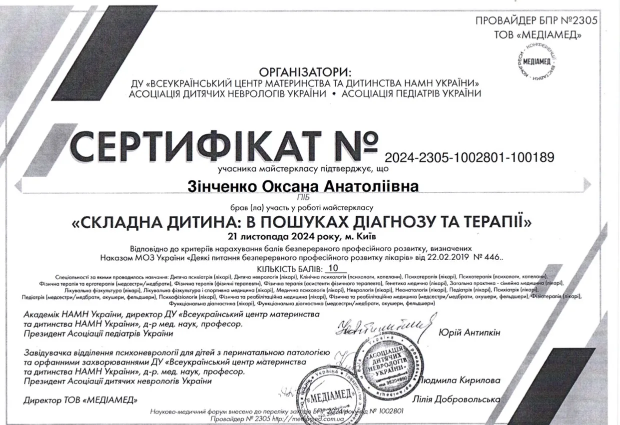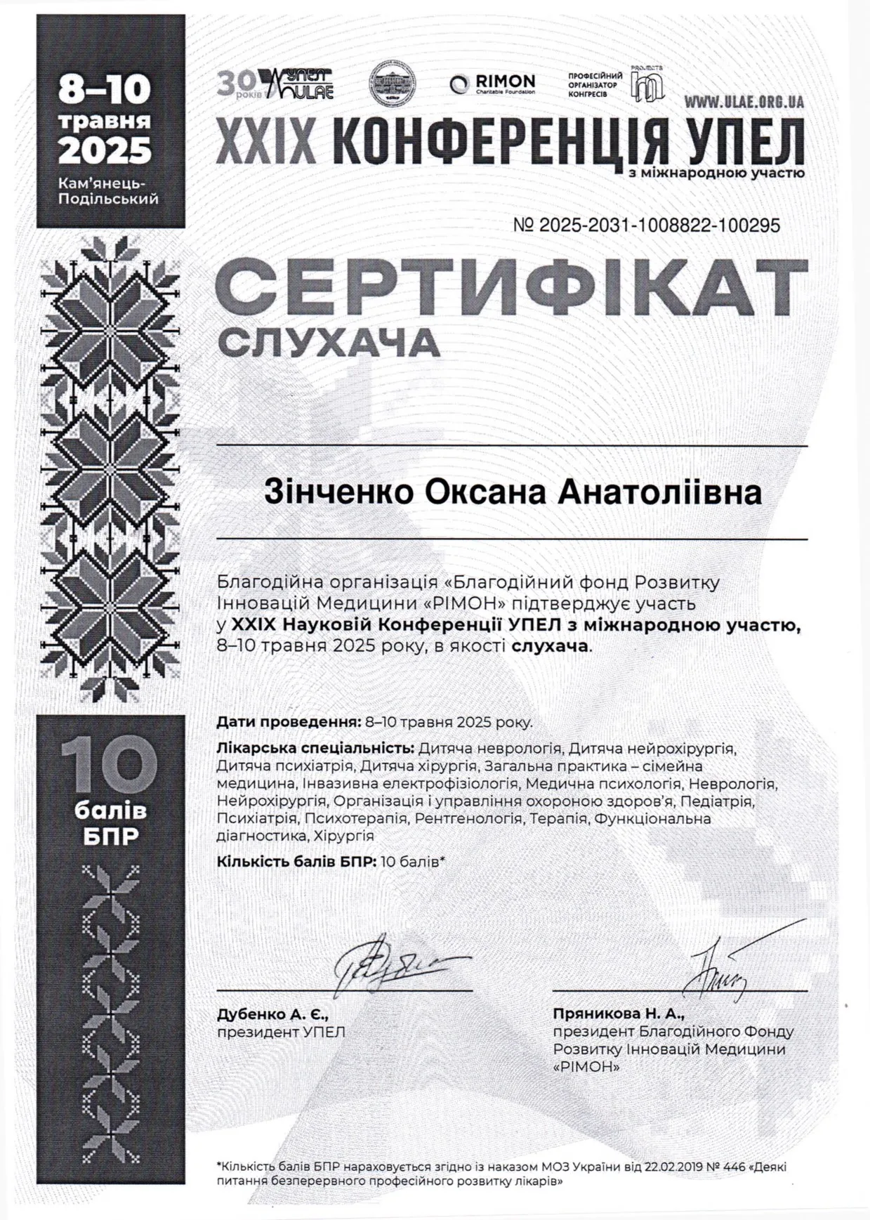 - 1997 р. – ДЗ “Дніпропетровська медична академія” МОЗ України, спеціалізація “Дитяча неврологія”.