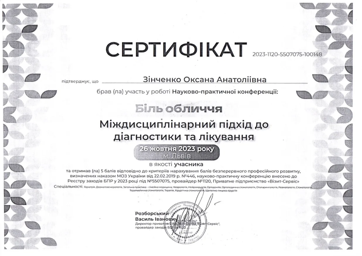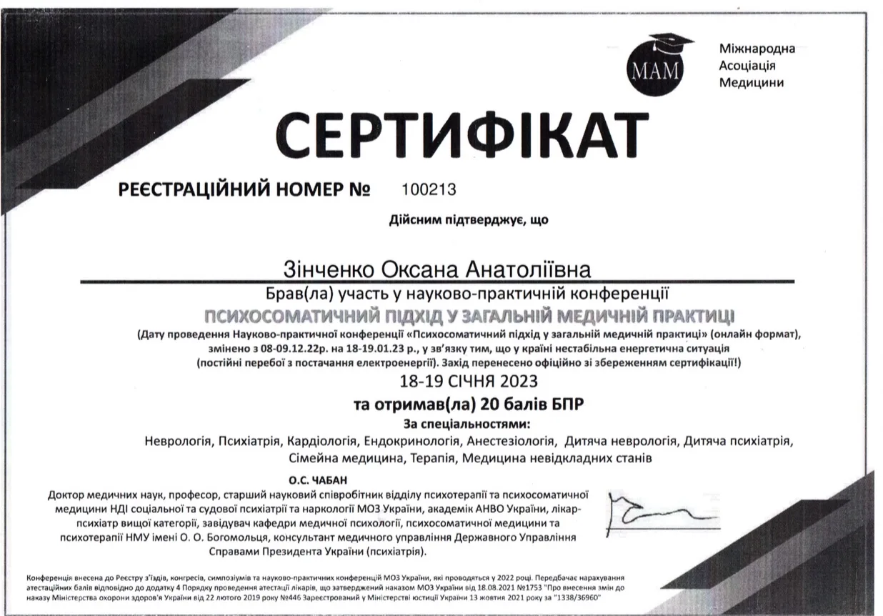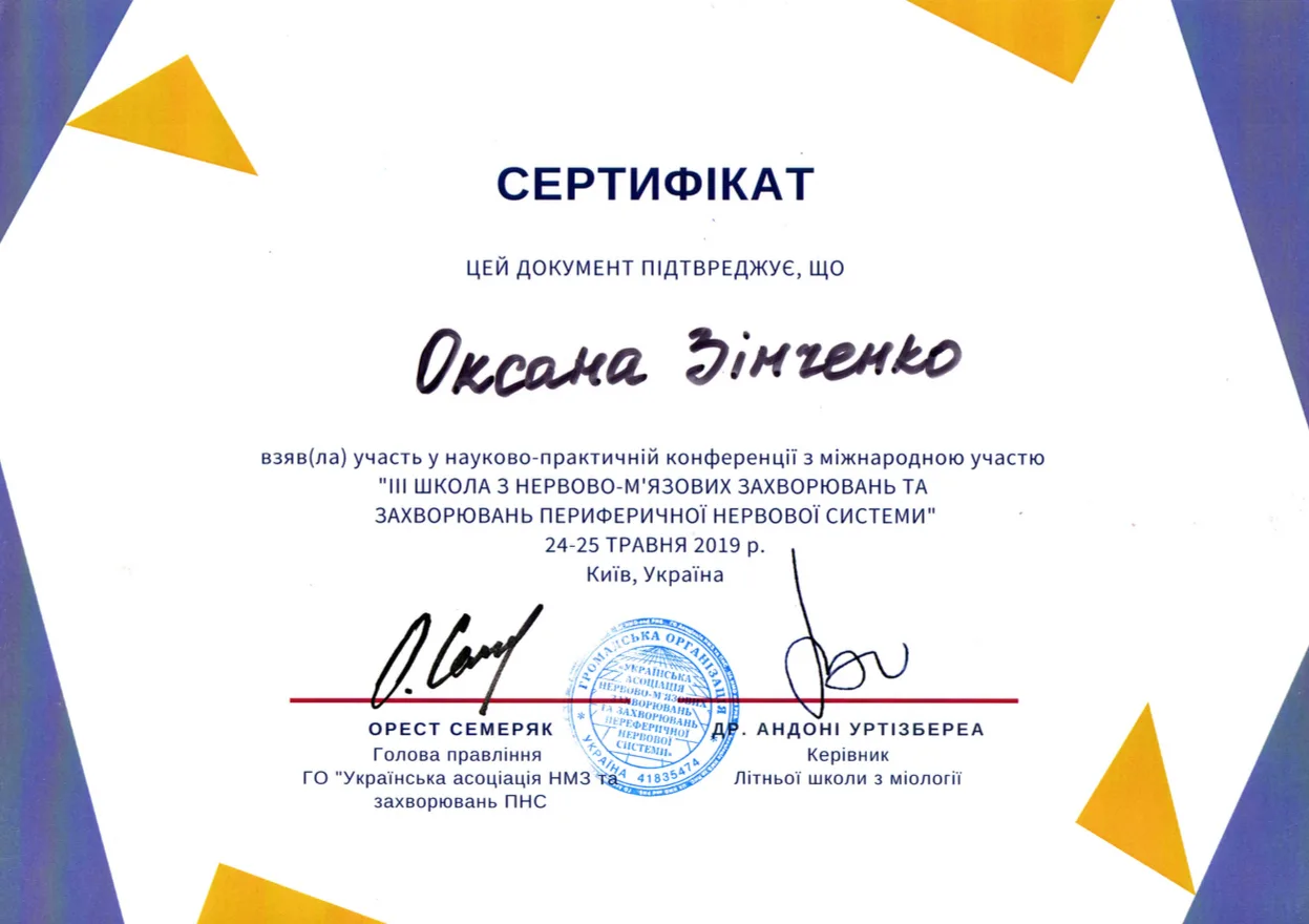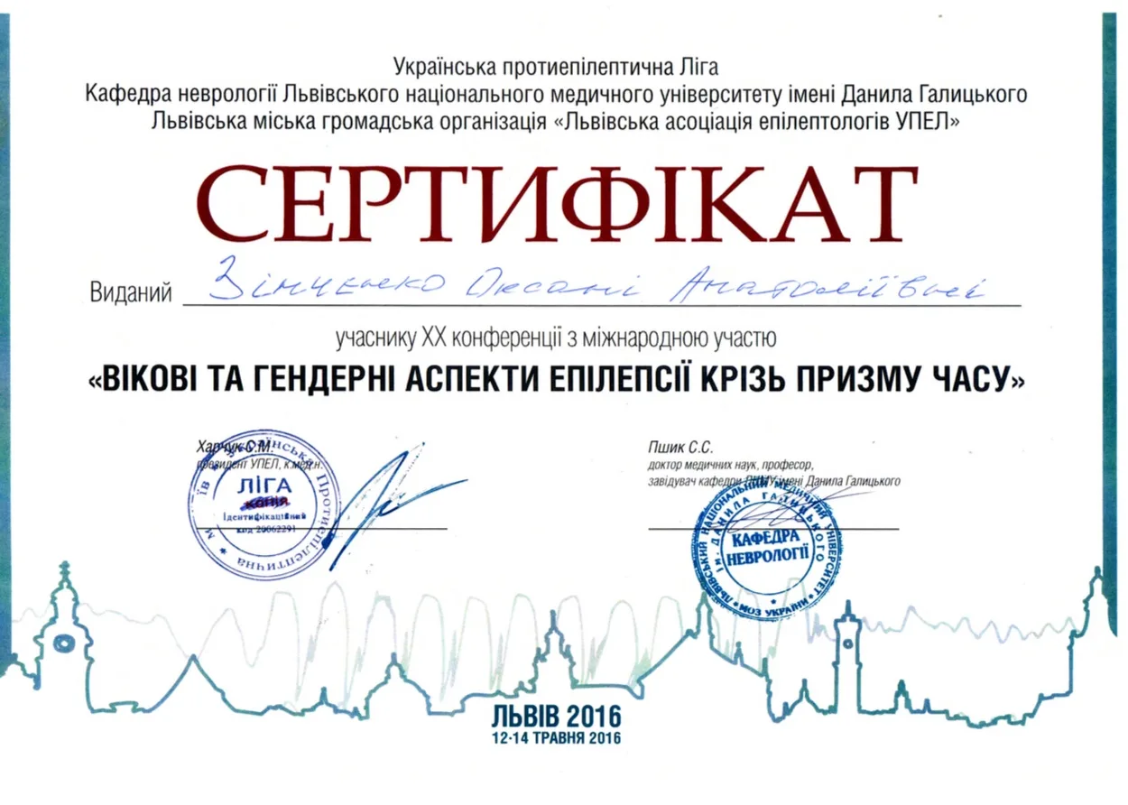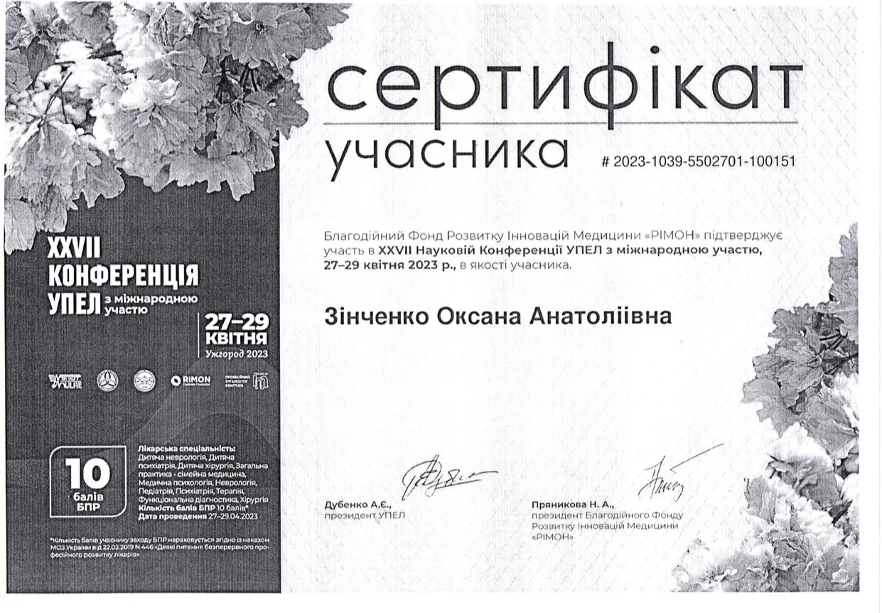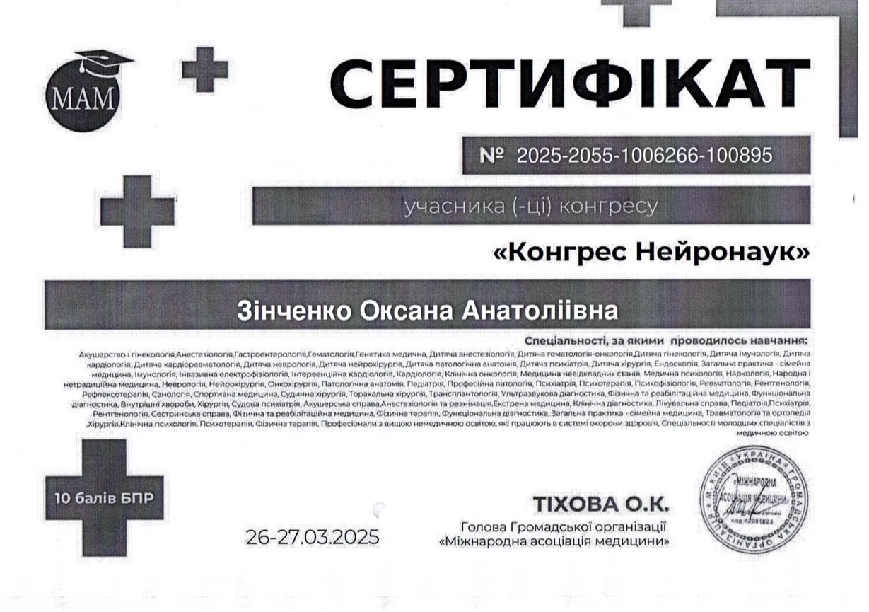 - 1997 р. – ДЗ “Дніпропетровська медична академія” МОЗ України, спеціалізація “Дитяча неврологія”.