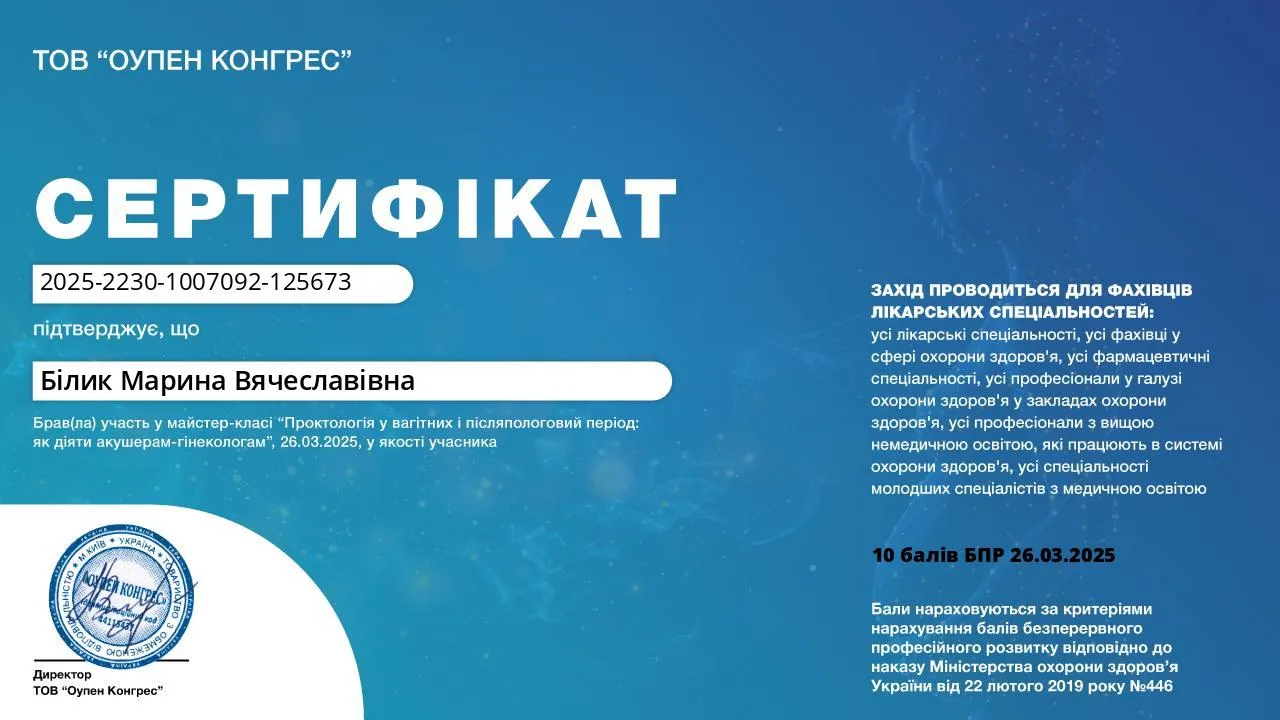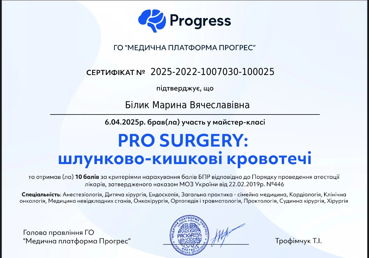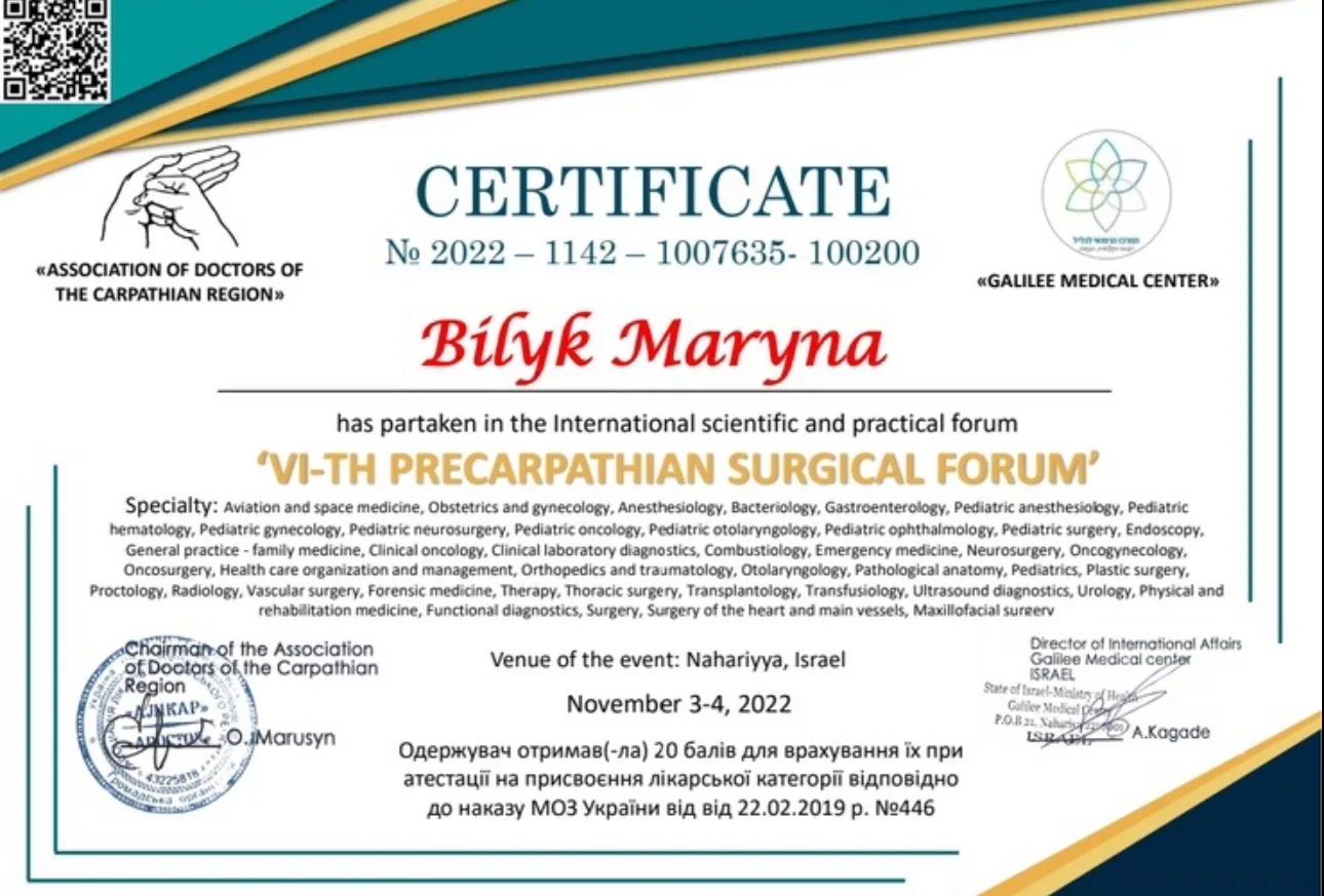 - 2022 г. – ГУ “Днепропетровская медицинская академия” МОЗ Украины, специализация “Проктология”.