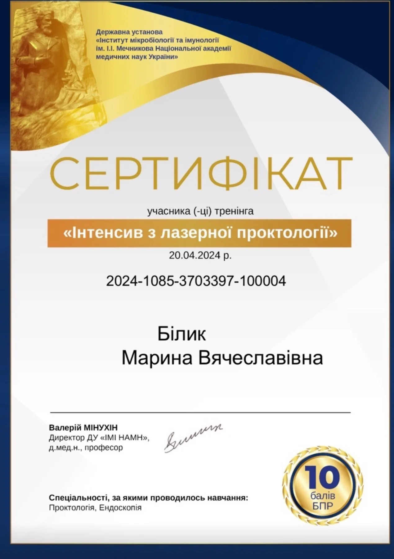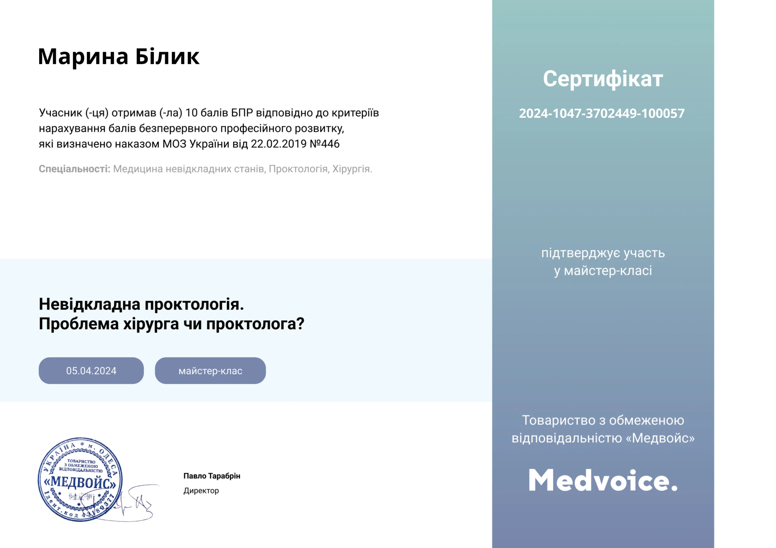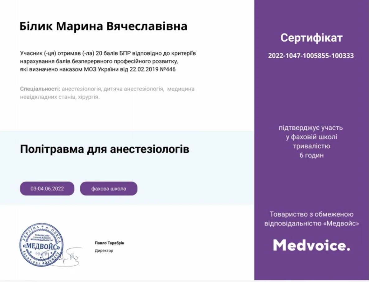 - 2022 г. – ГУ “Днепропетровская медицинская академия” МОЗ Украины, специализация “Проктология”.