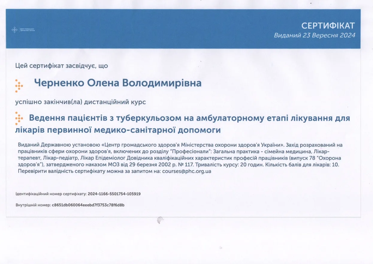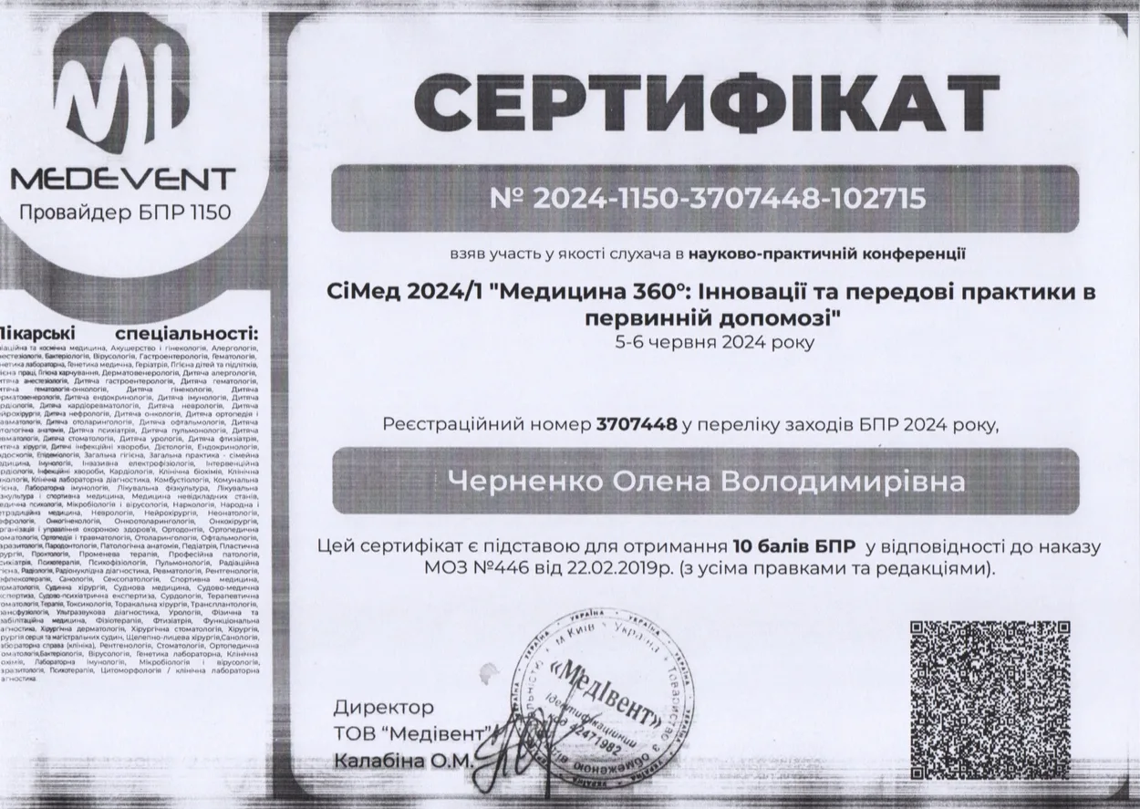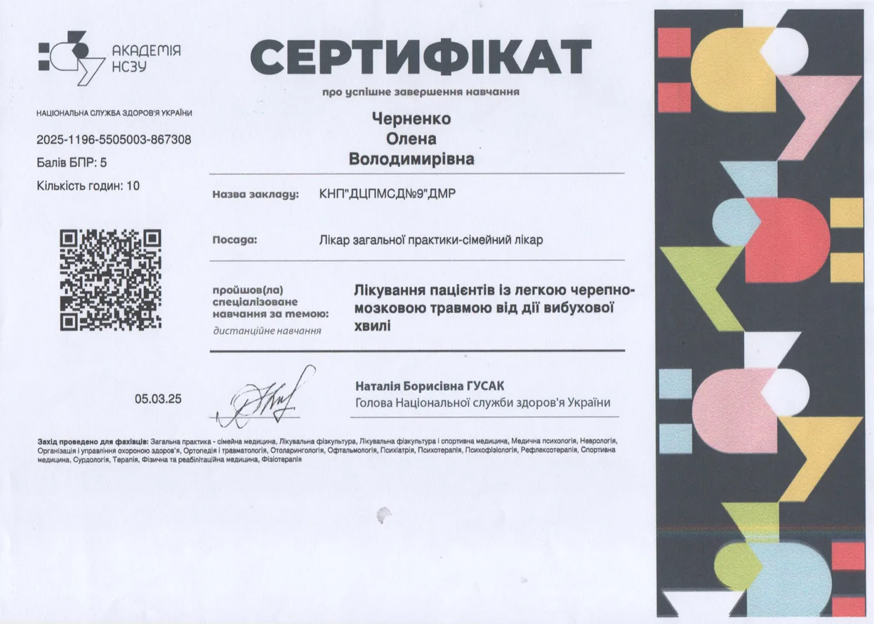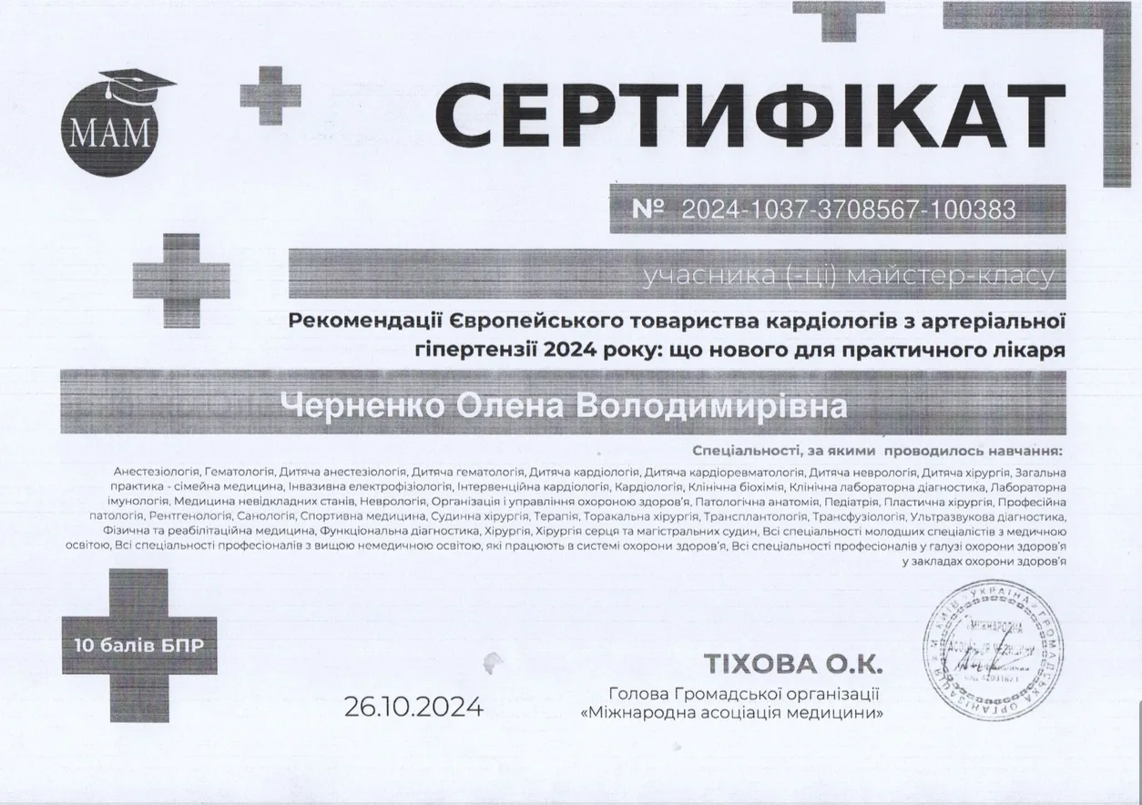- 2019 г. – присвоение I квалификационной категории по специальности “Терапия”.