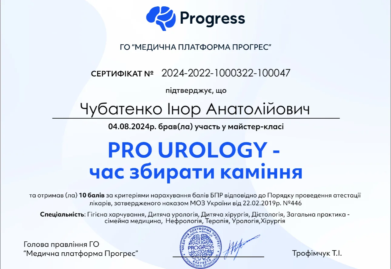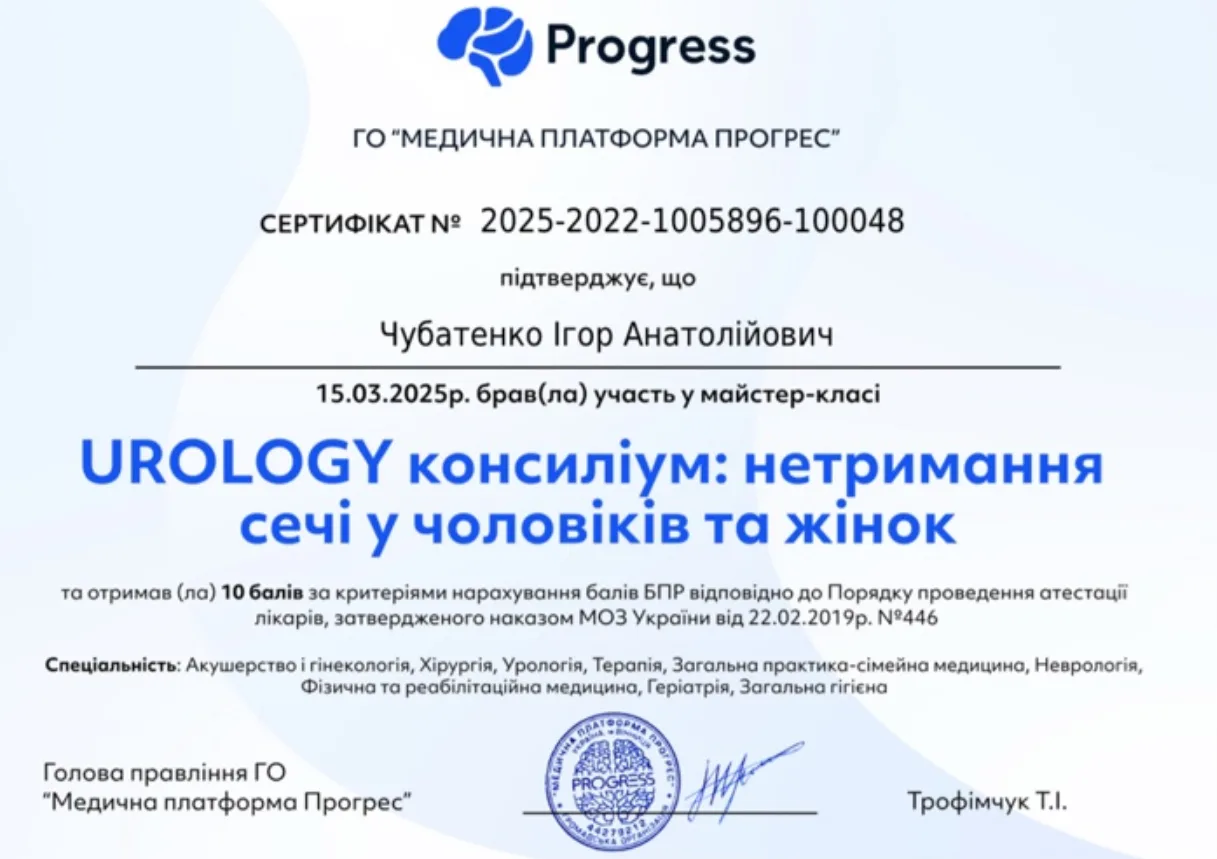 - 1989 г. – Донецкий национальный медицинский университет им. М. Горького, специализация “Урология”.