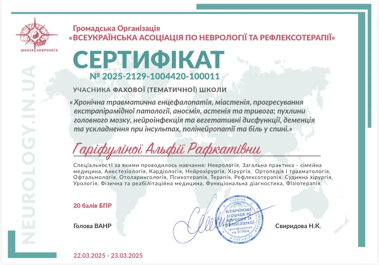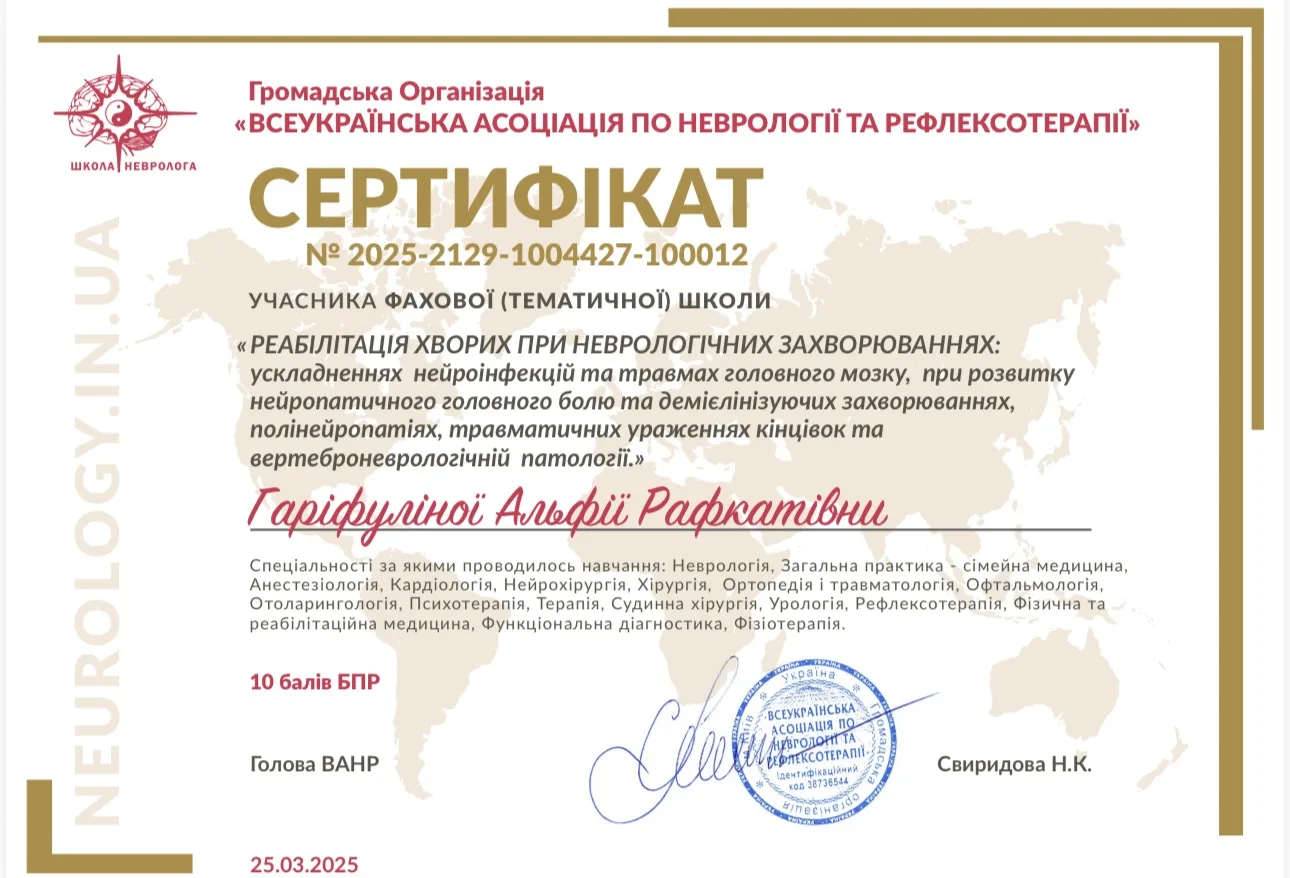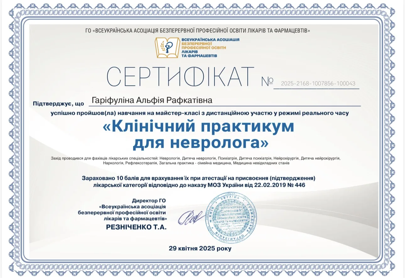 - 2024 г. – Днепровский государственный медицинский университет, специализация “Неврология”.