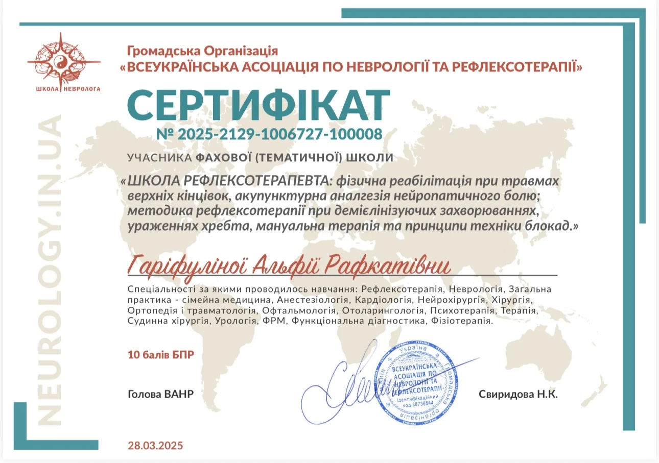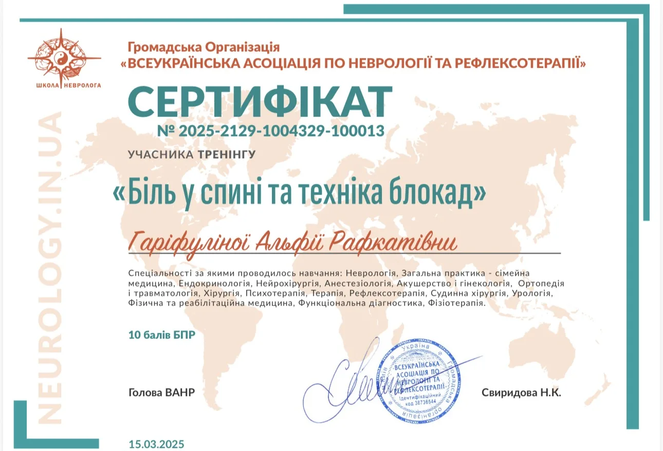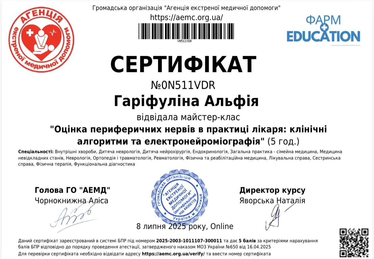 - 2024 г. – Днепровский государственный медицинский университет, специализация “Неврология”.