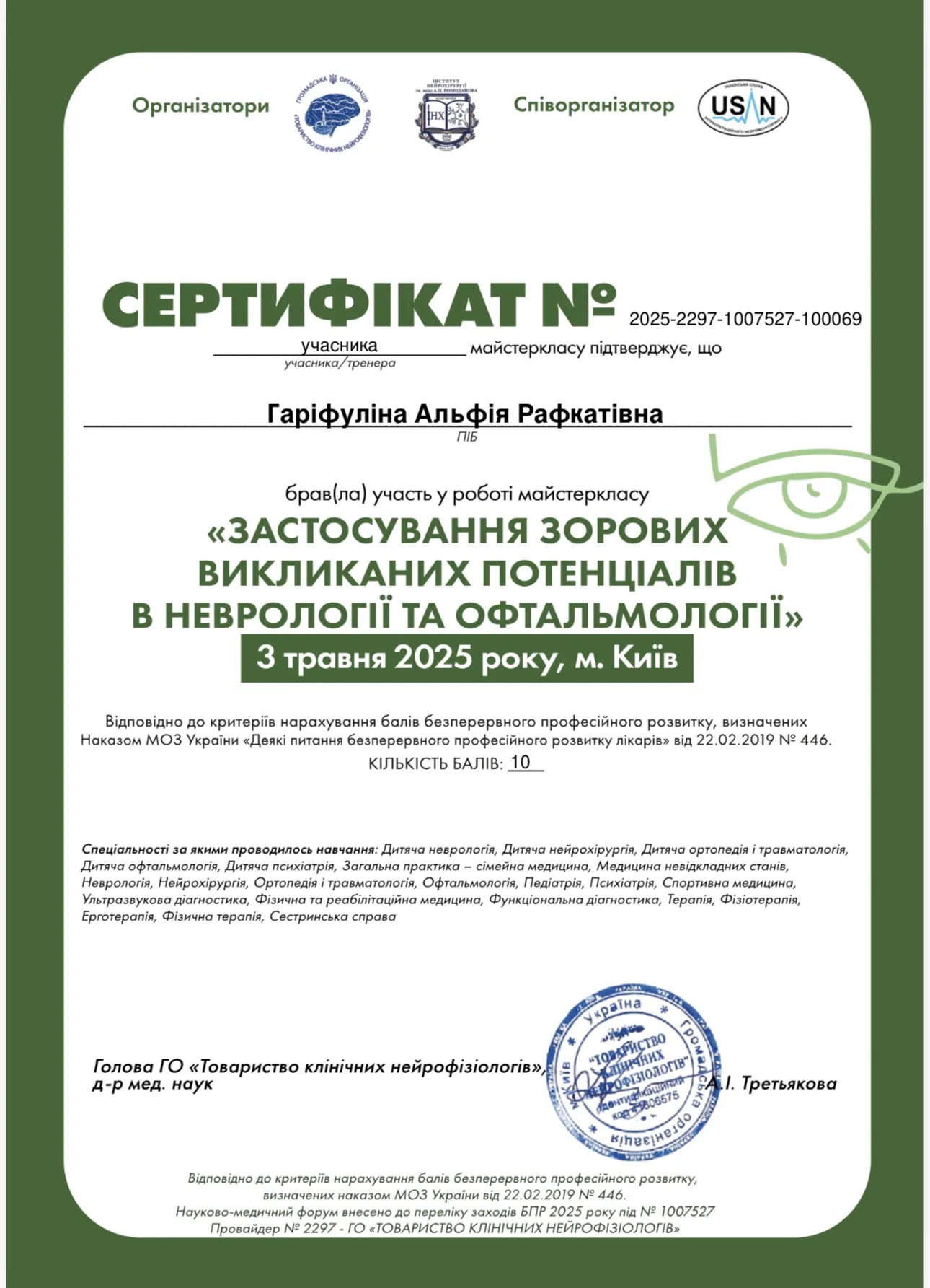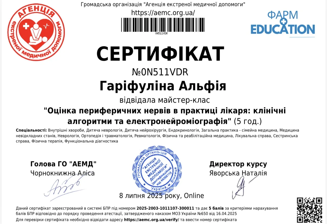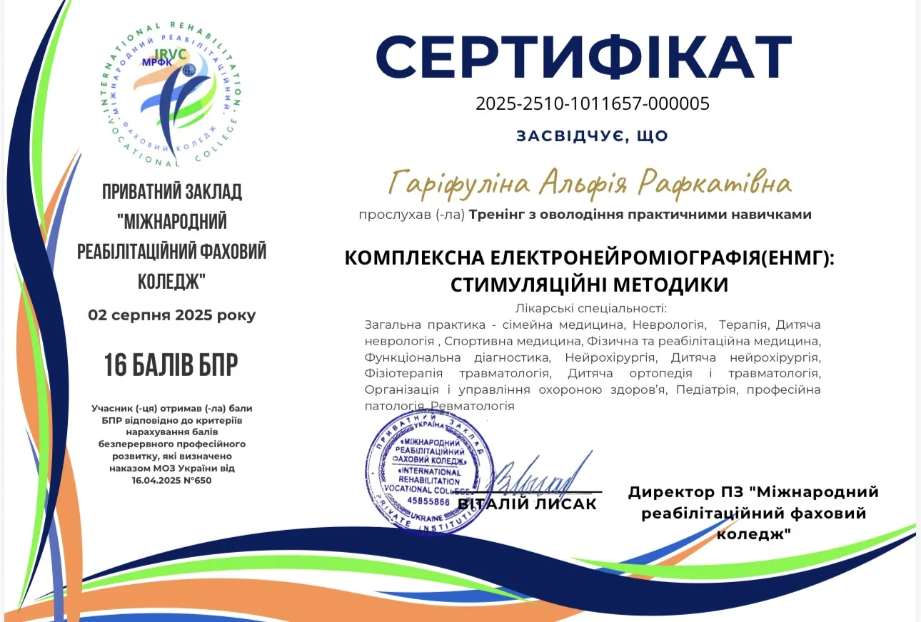 - 2025 г. -Научно-учебный медицинский институт НТУ “ХПИ”- тематическое усовершенствование “Избранные вопросы клинической нейрофизиологии: ЭЭГ исследования и вызванные потенциалы головного мозга”.