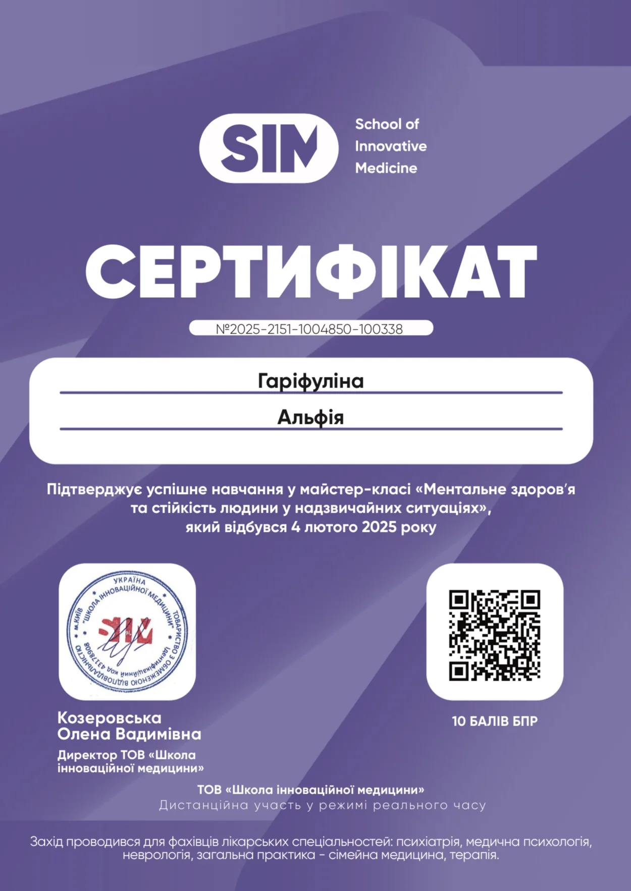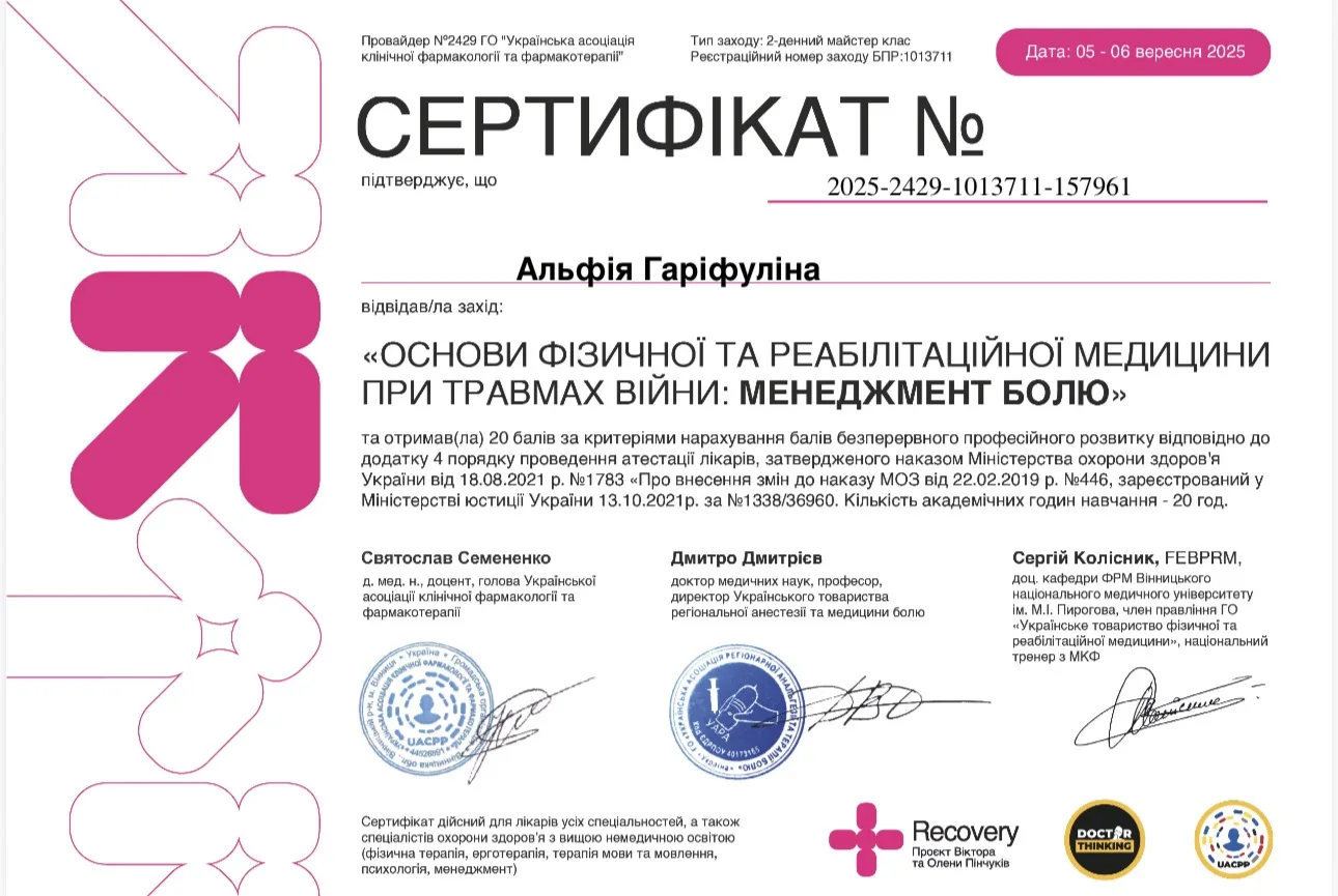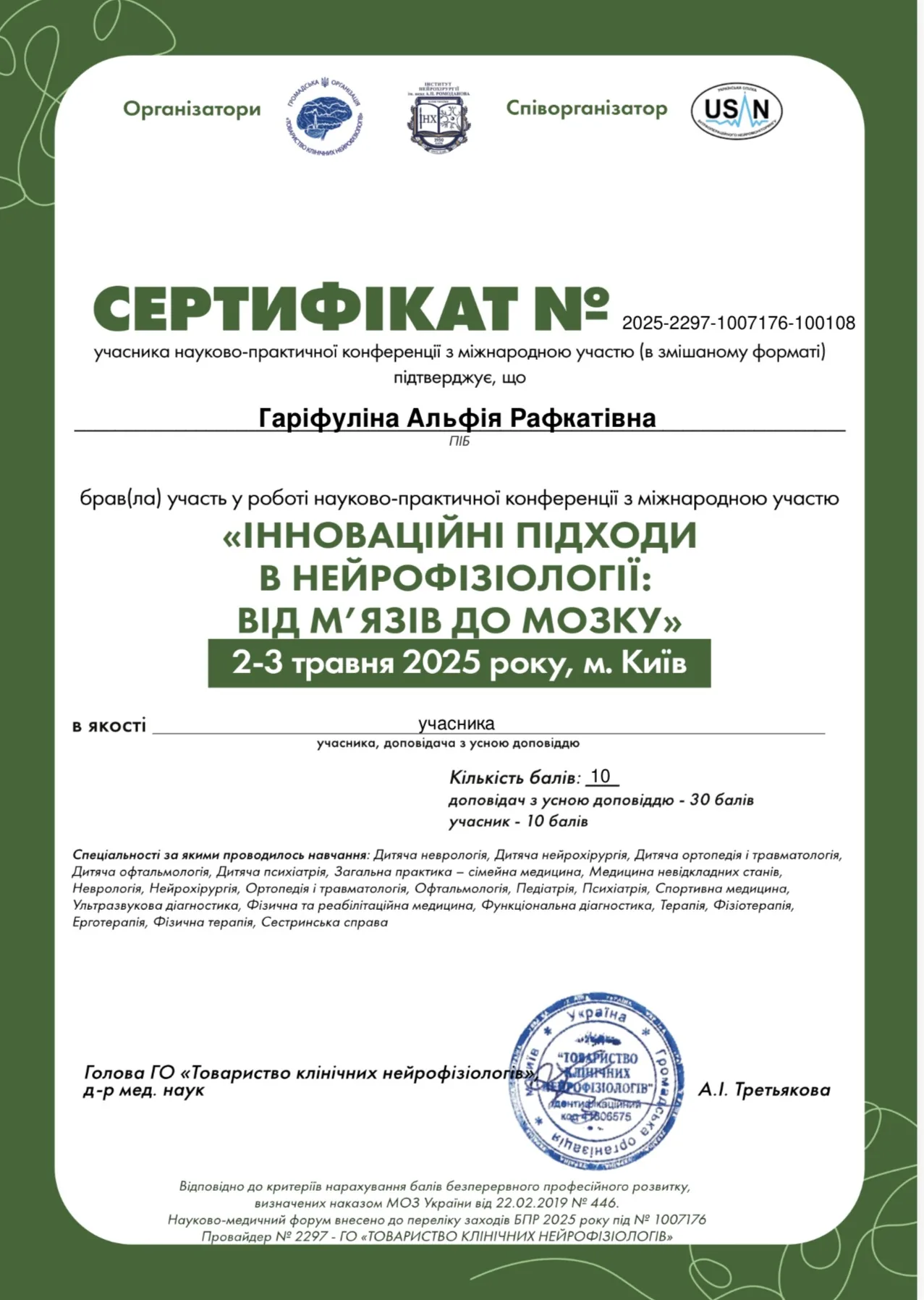 - 2025 г. -Научно-учебный медицинский институт НТУ “ХПИ”- тематическое усовершенствование “Избранные вопросы клинической нейрофизиологии: ЭЭГ исследования и вызванные потенциалы головного мозга”.
