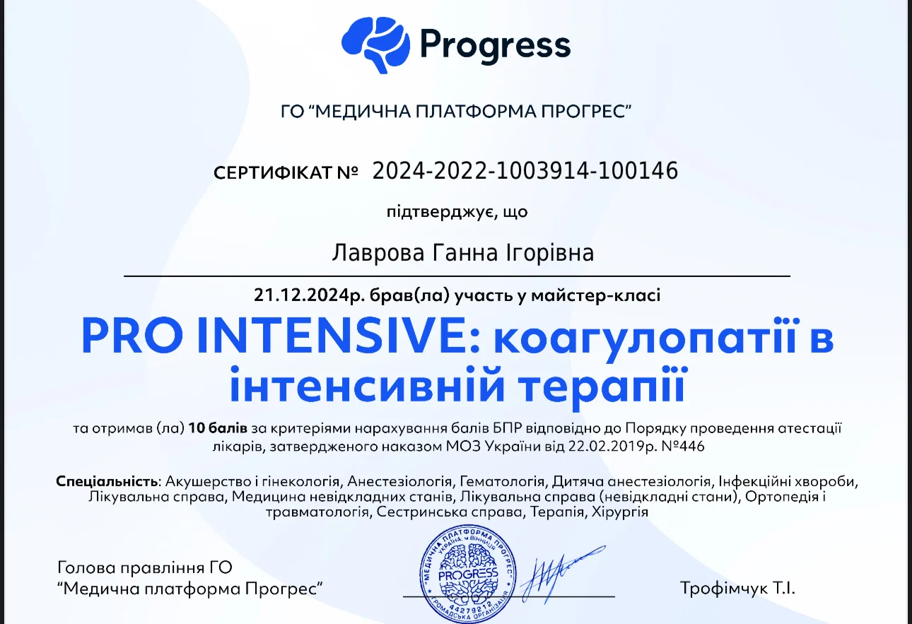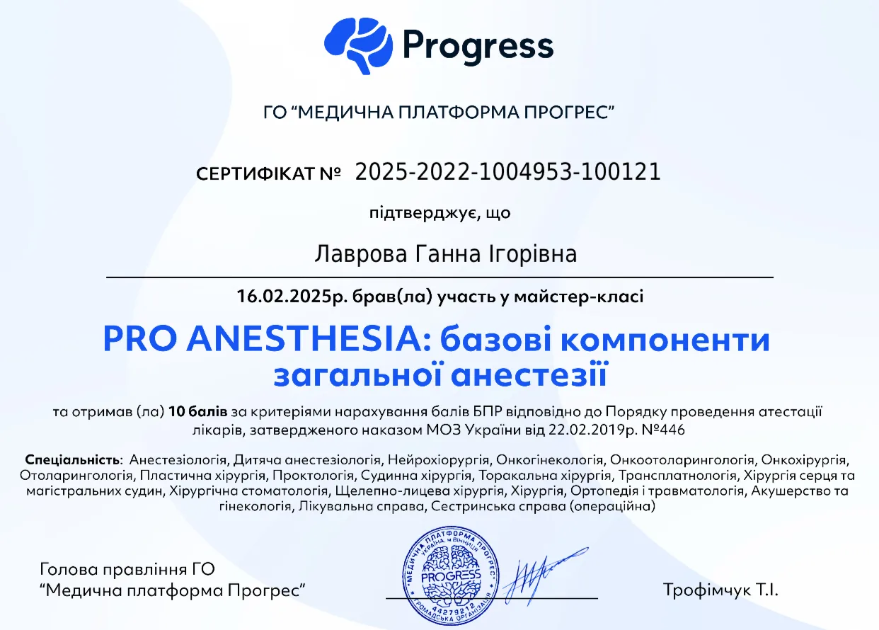 - 2017 г. – Днепропетровская государственная медицинская академия, специализация “Анестезиология и интенсивная терапия”;