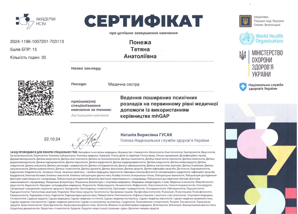 - 1991 г. – Павлоградское медицинское училище, специальность «Сестринское дело».