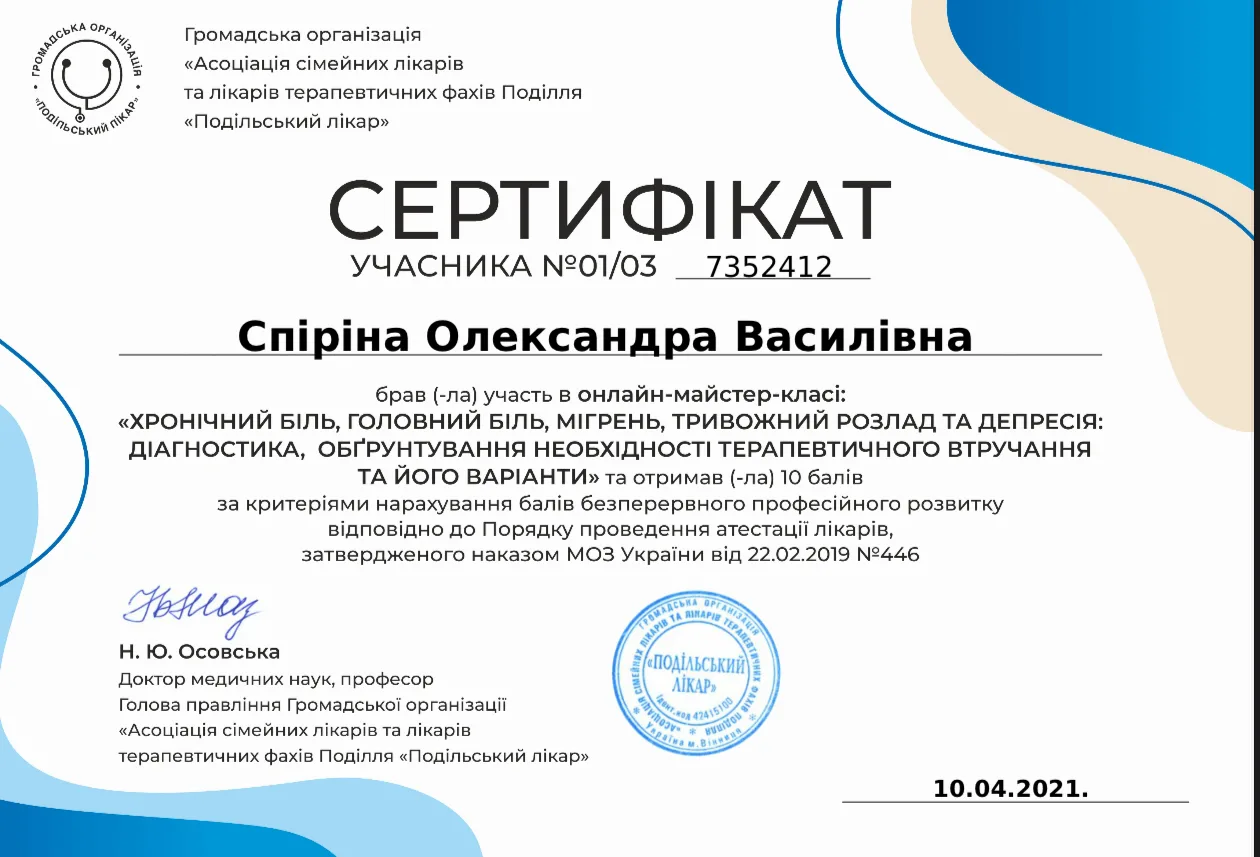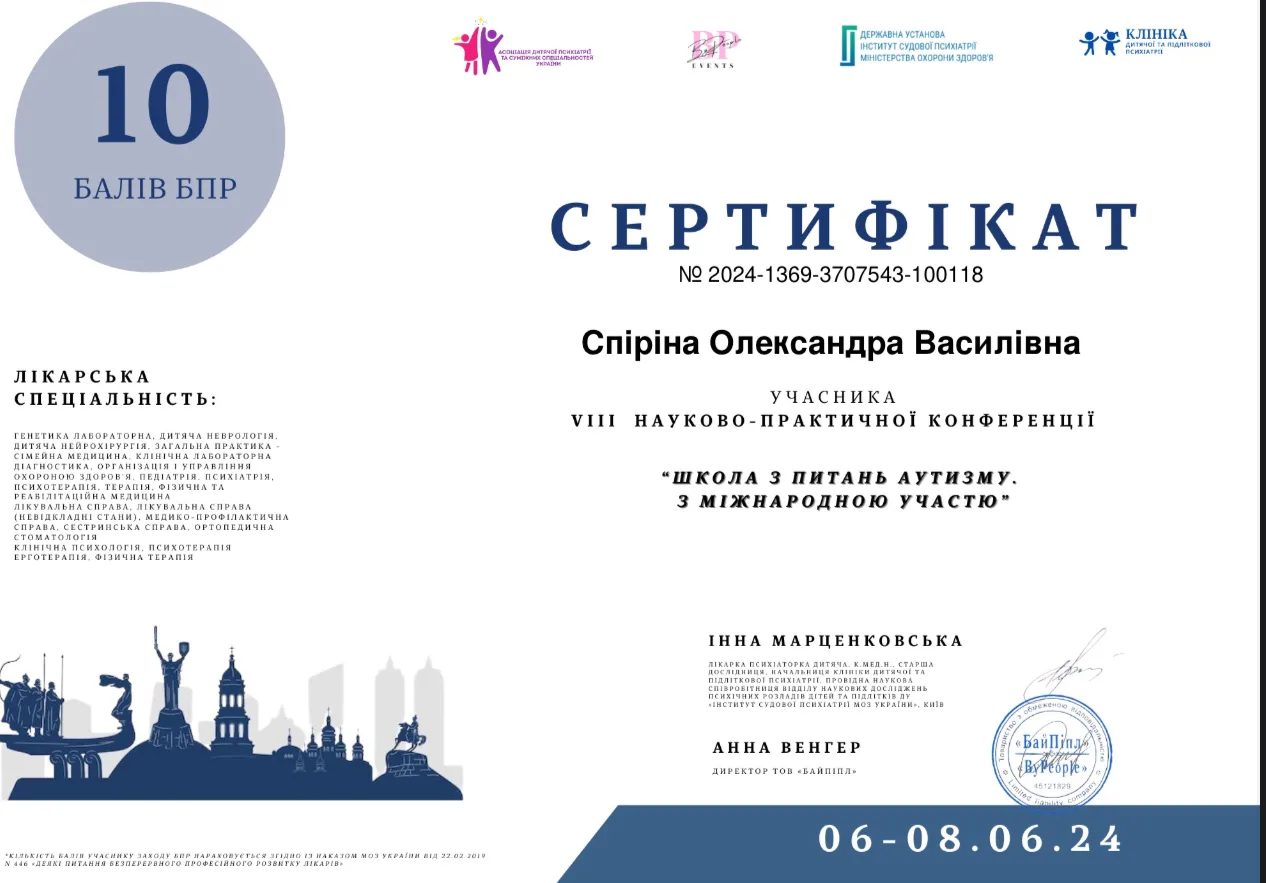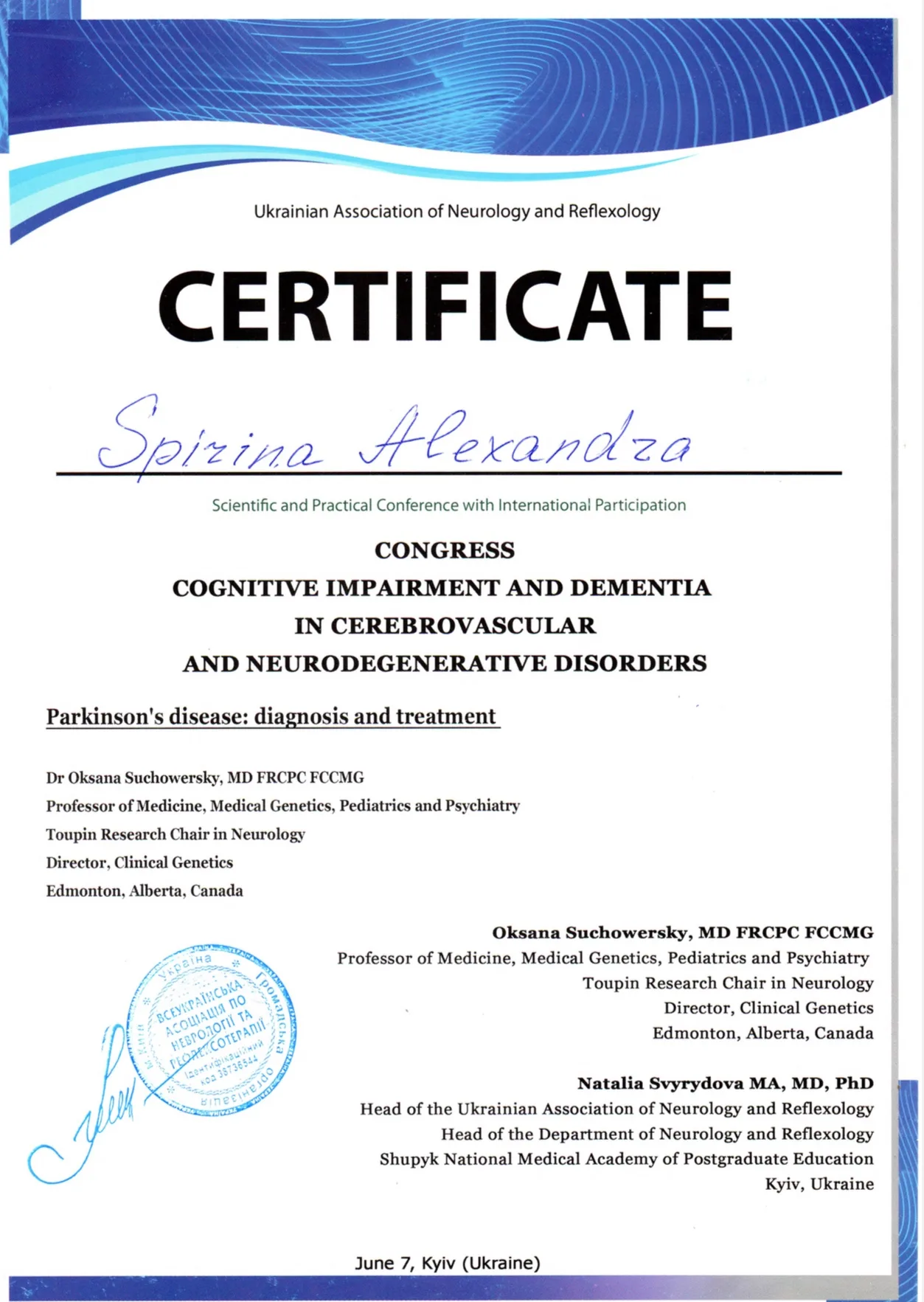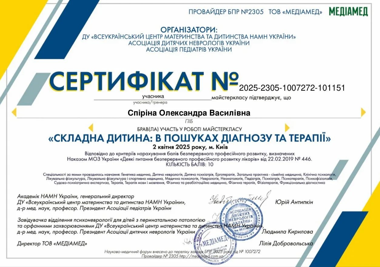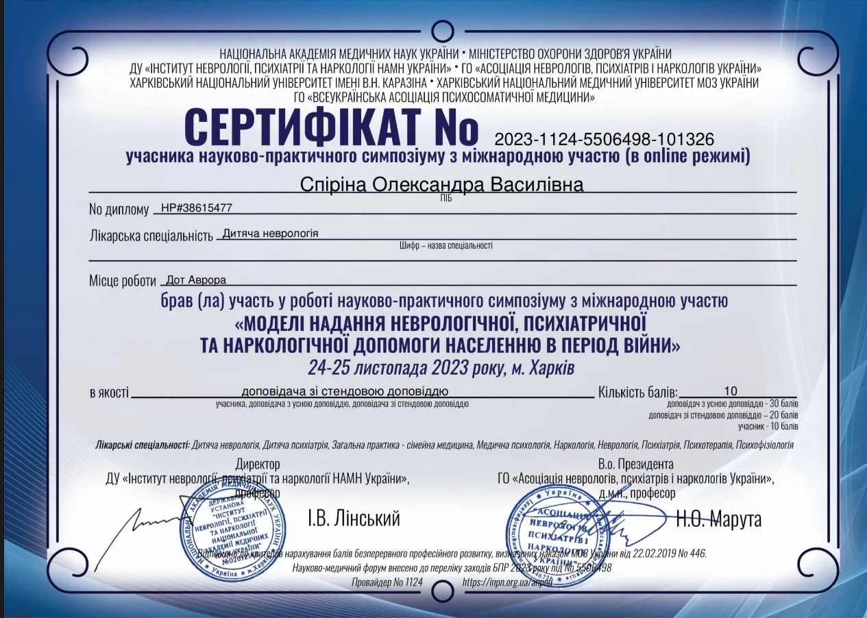 - 2016 г. – ГУ “Днепропетровская медицинская академия” МЗ Украины, специализация “Детская неврология”.