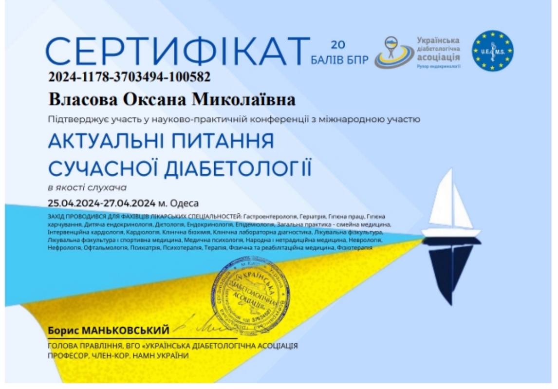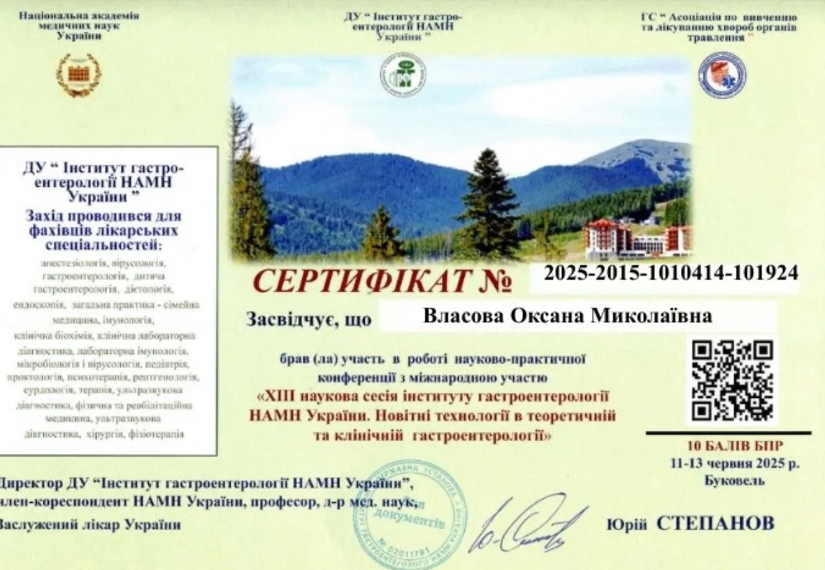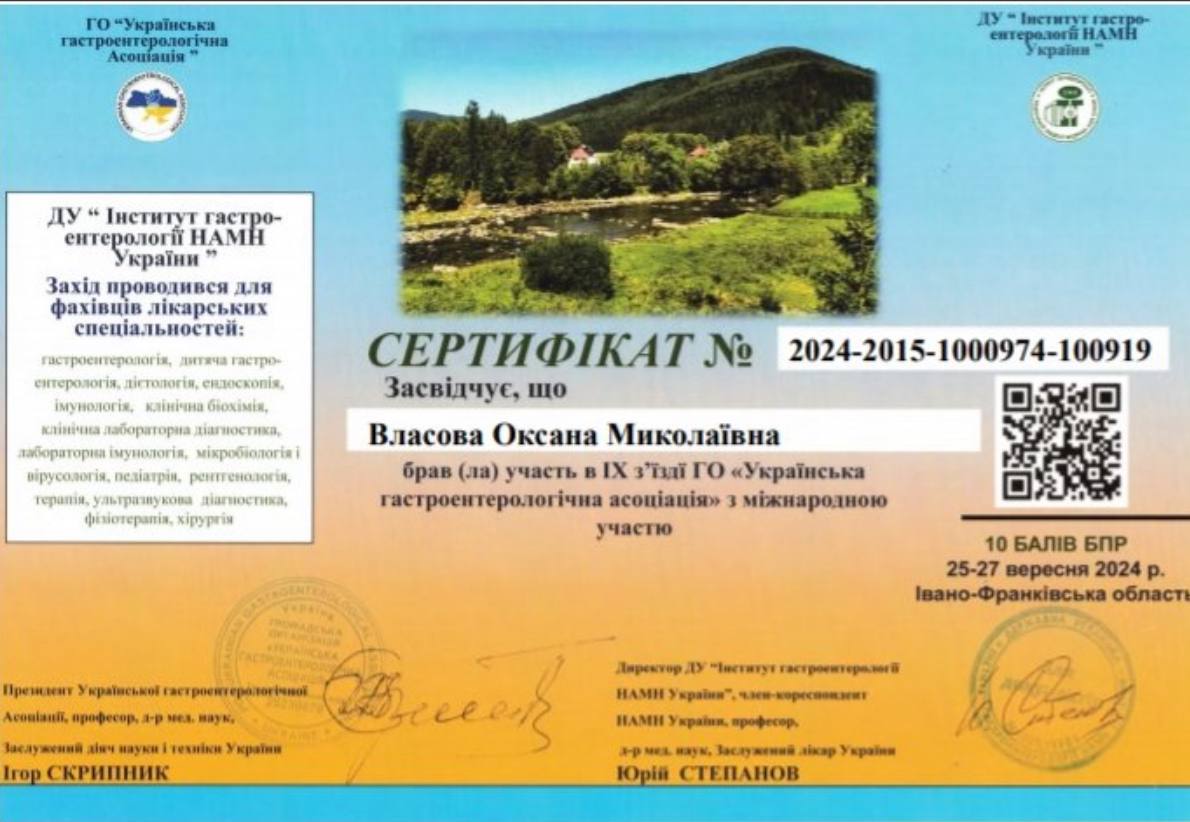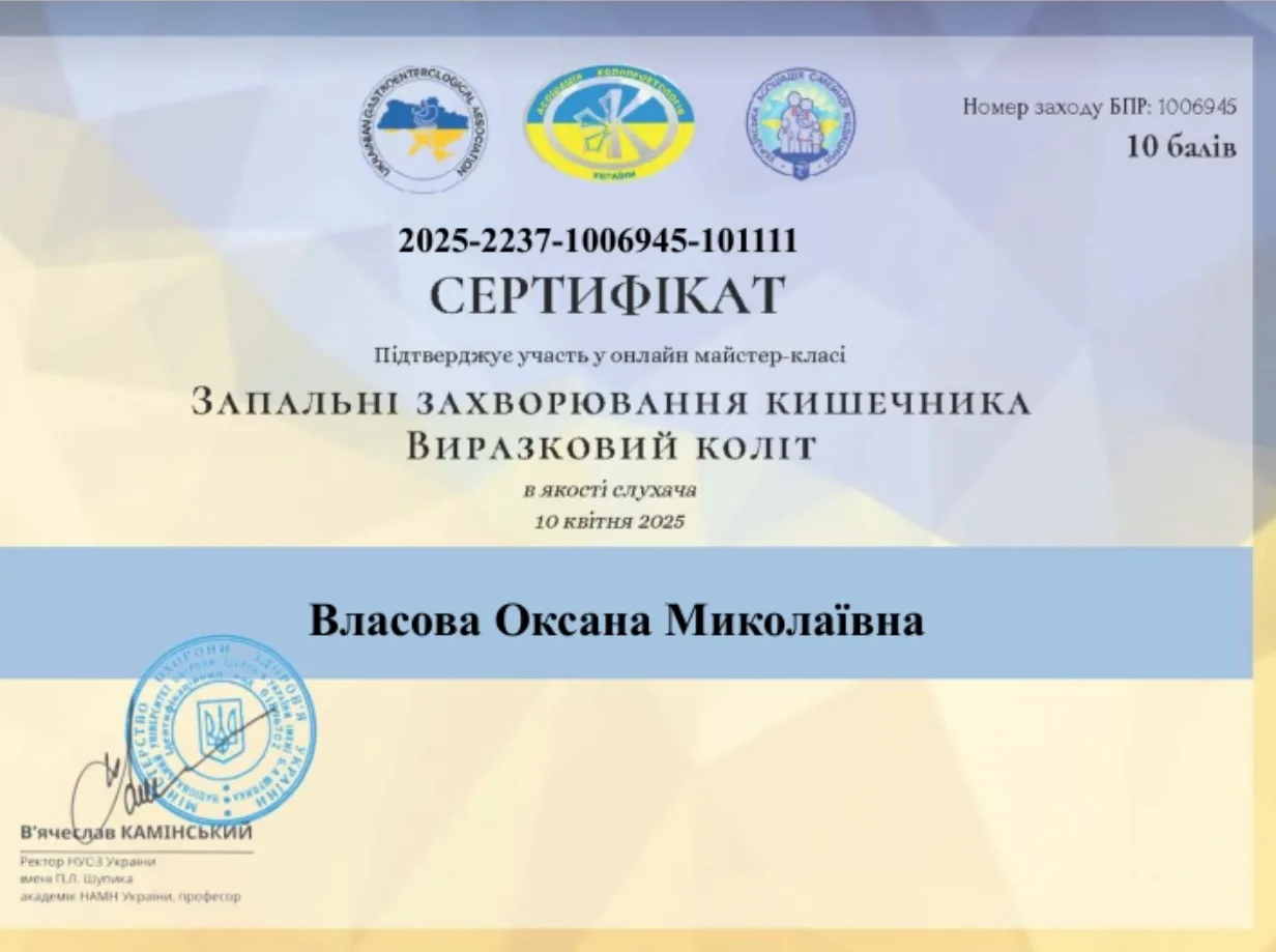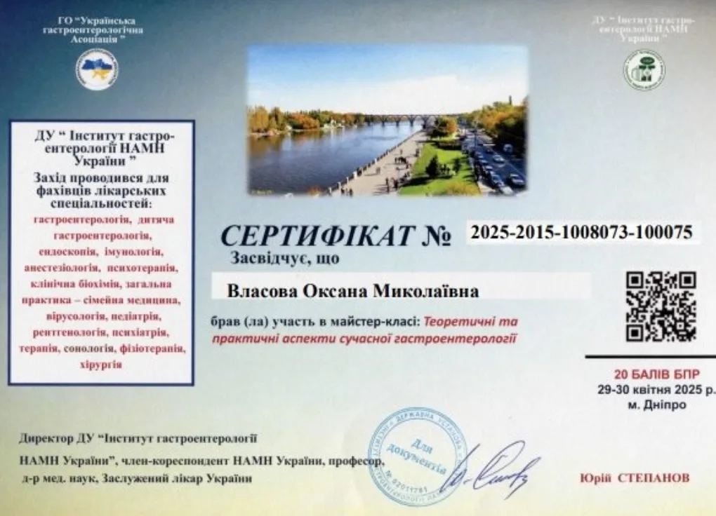 - 2011 г. – ГУ “Днепропетровская медицинская академия” МЗ Украины, специализация “Гастроэнтерология”