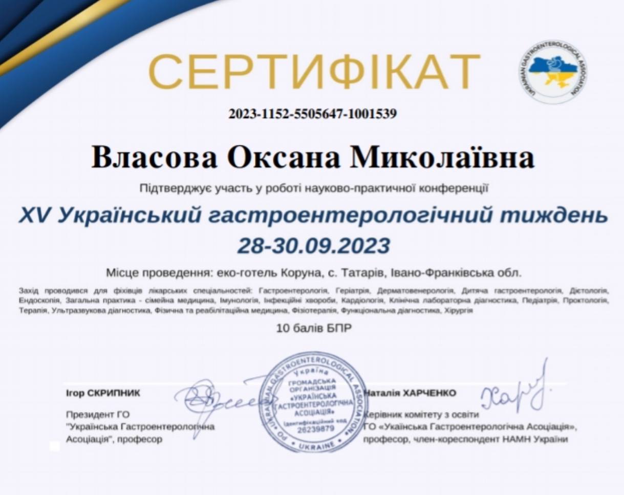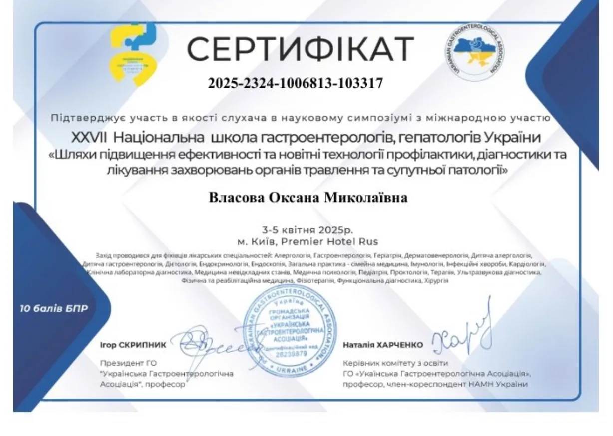 - Врач высшей категории. Кандидат медицинских наук. Автор 42 научных статей и 1 патента. Член ассоциации гастроэнтерологов Украины.